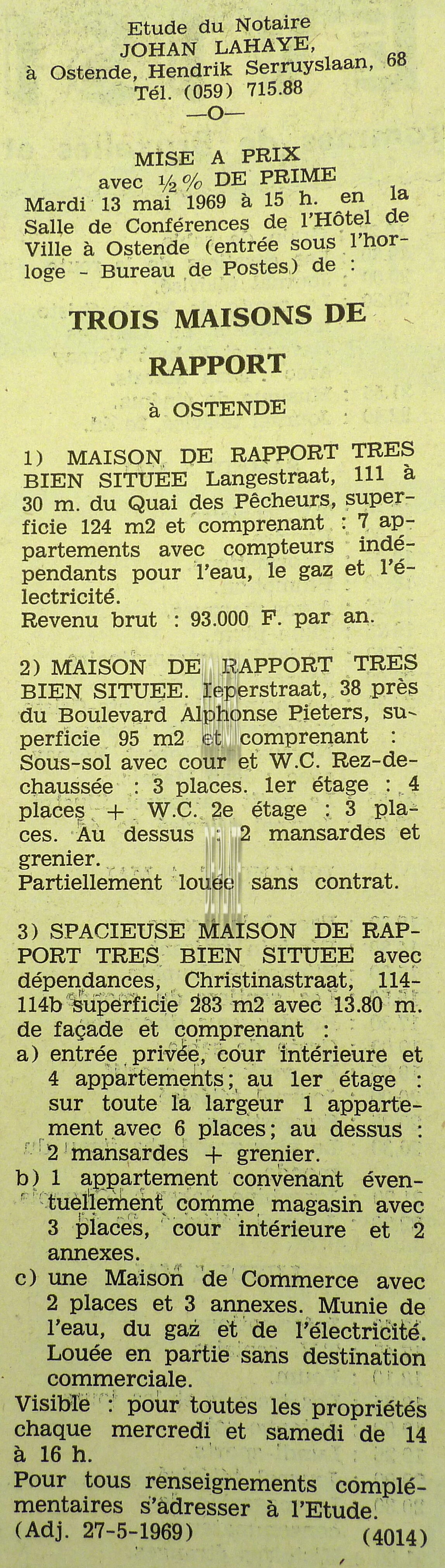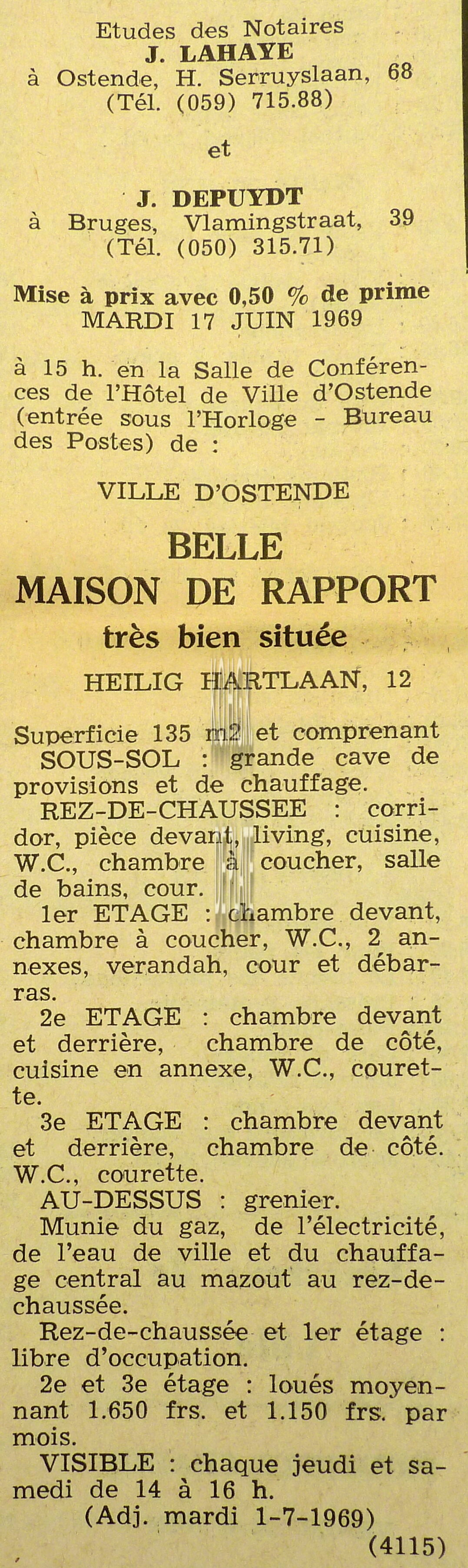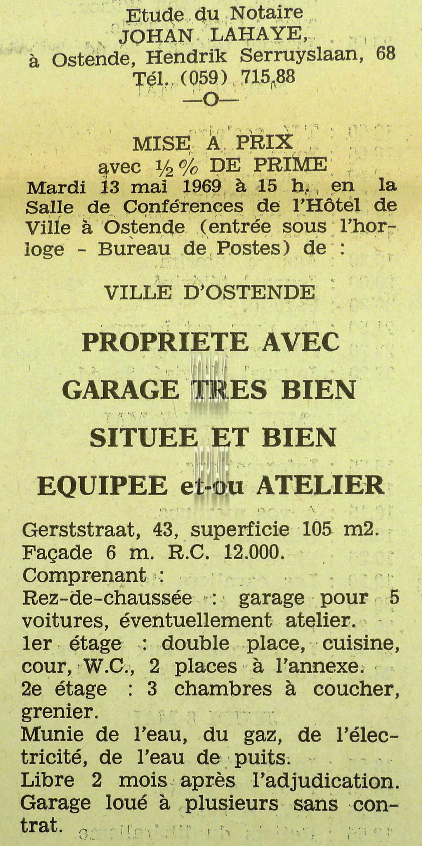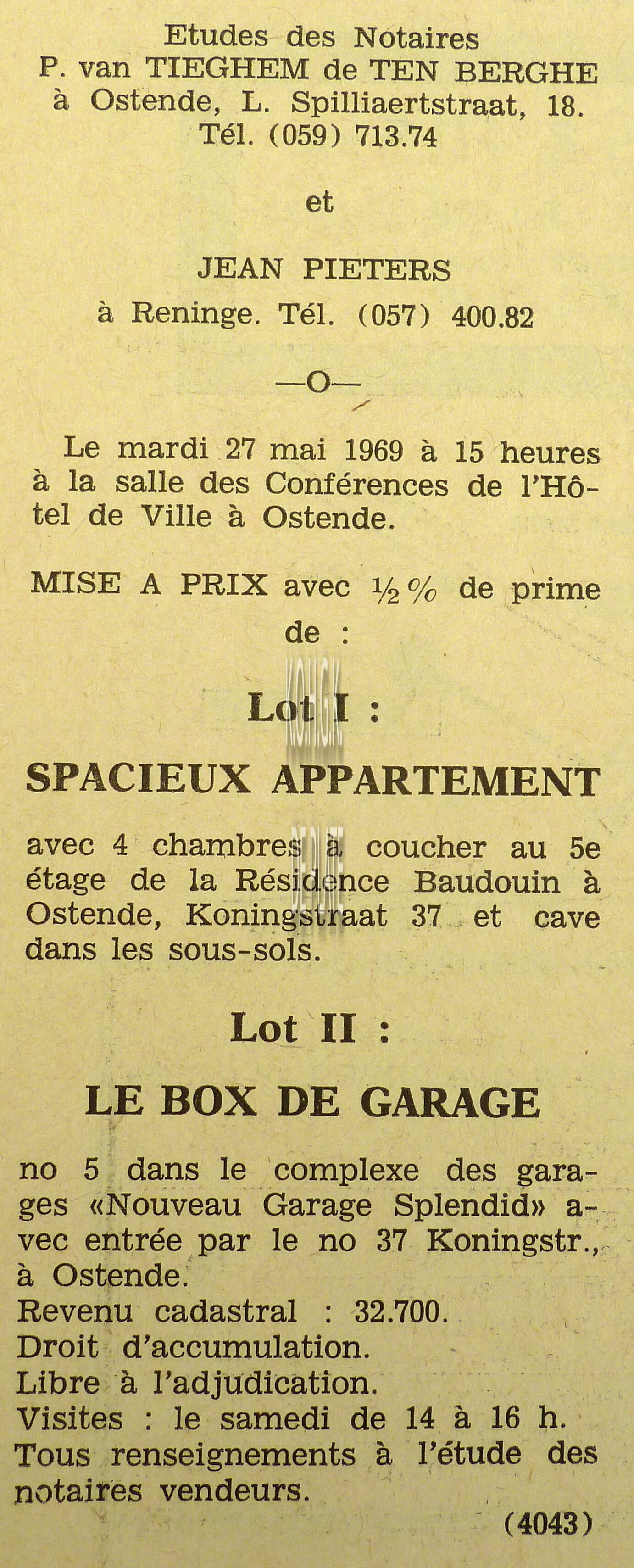 Advertentie : Etude du notaire Maurice Quaghebeur. Vente publique. Grand local commercial dénommé "Hotel de Flandre". A l'angle de la Place Leopold I, la chaussée de Thourout et du Boulevard Rogier 1.