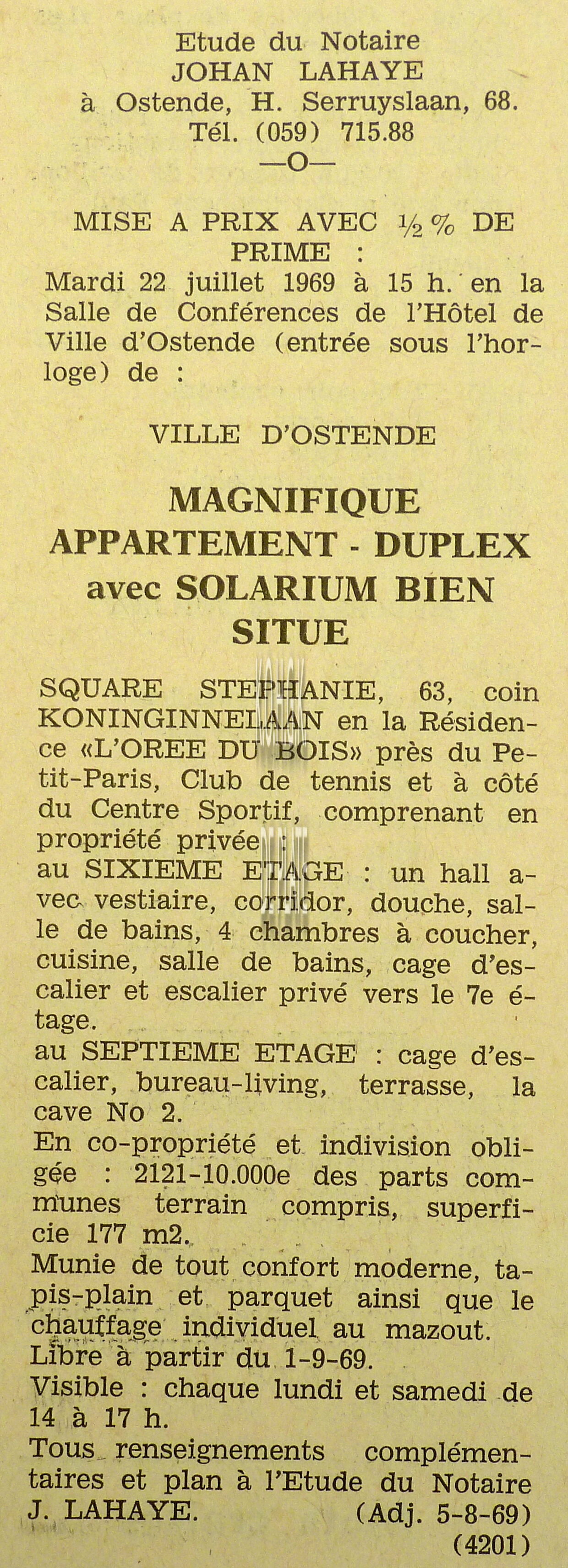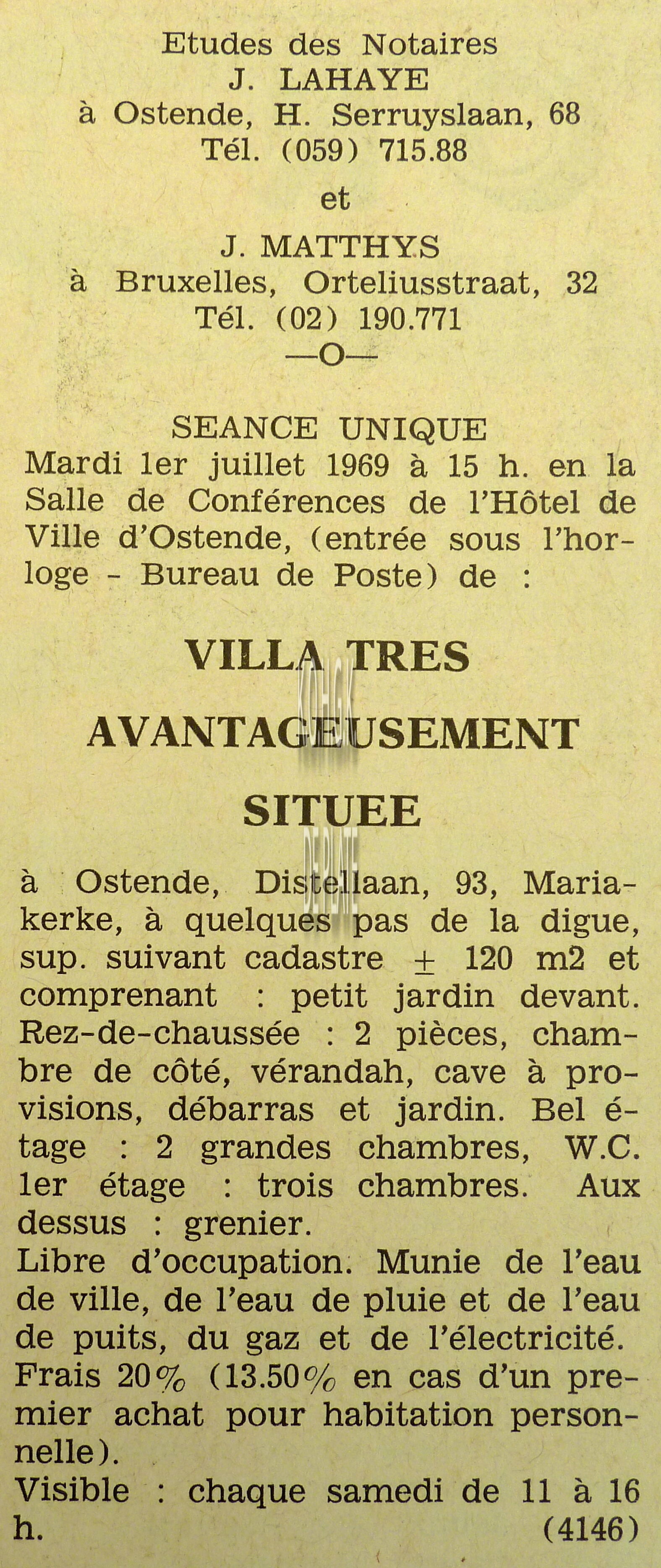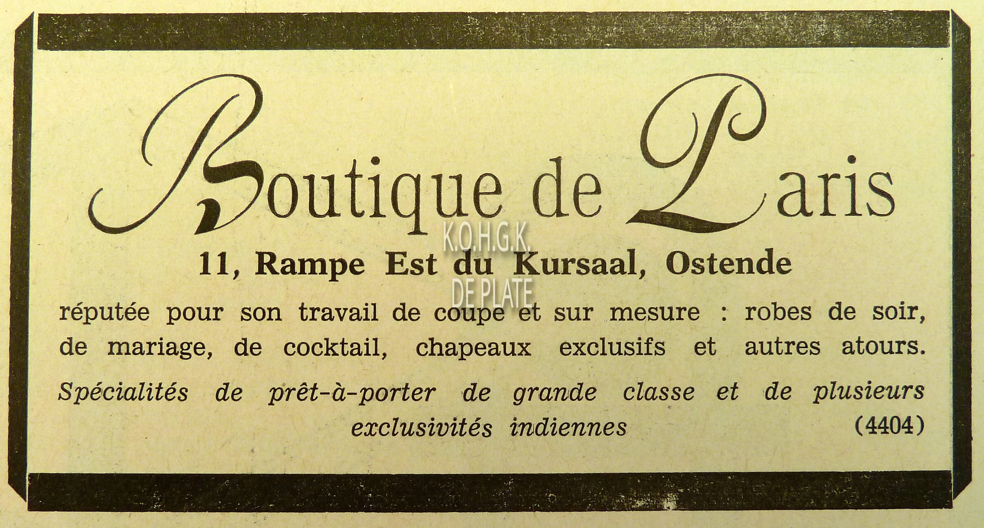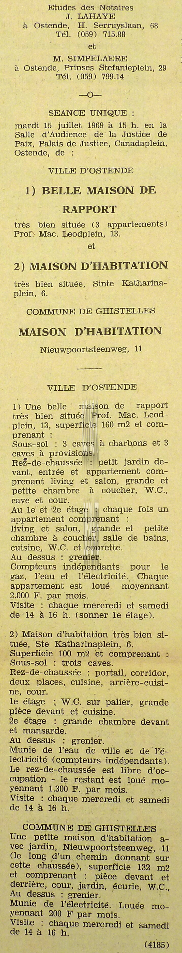 Advertentie : Etude du notaire Maurice Quaghebeur. Vente publique. Grand local commercial dénommé "Hotel de Flandre". A l'angle de la Place Leopold I, la chaussée de Thourout et du Boulevard Rogier 1.