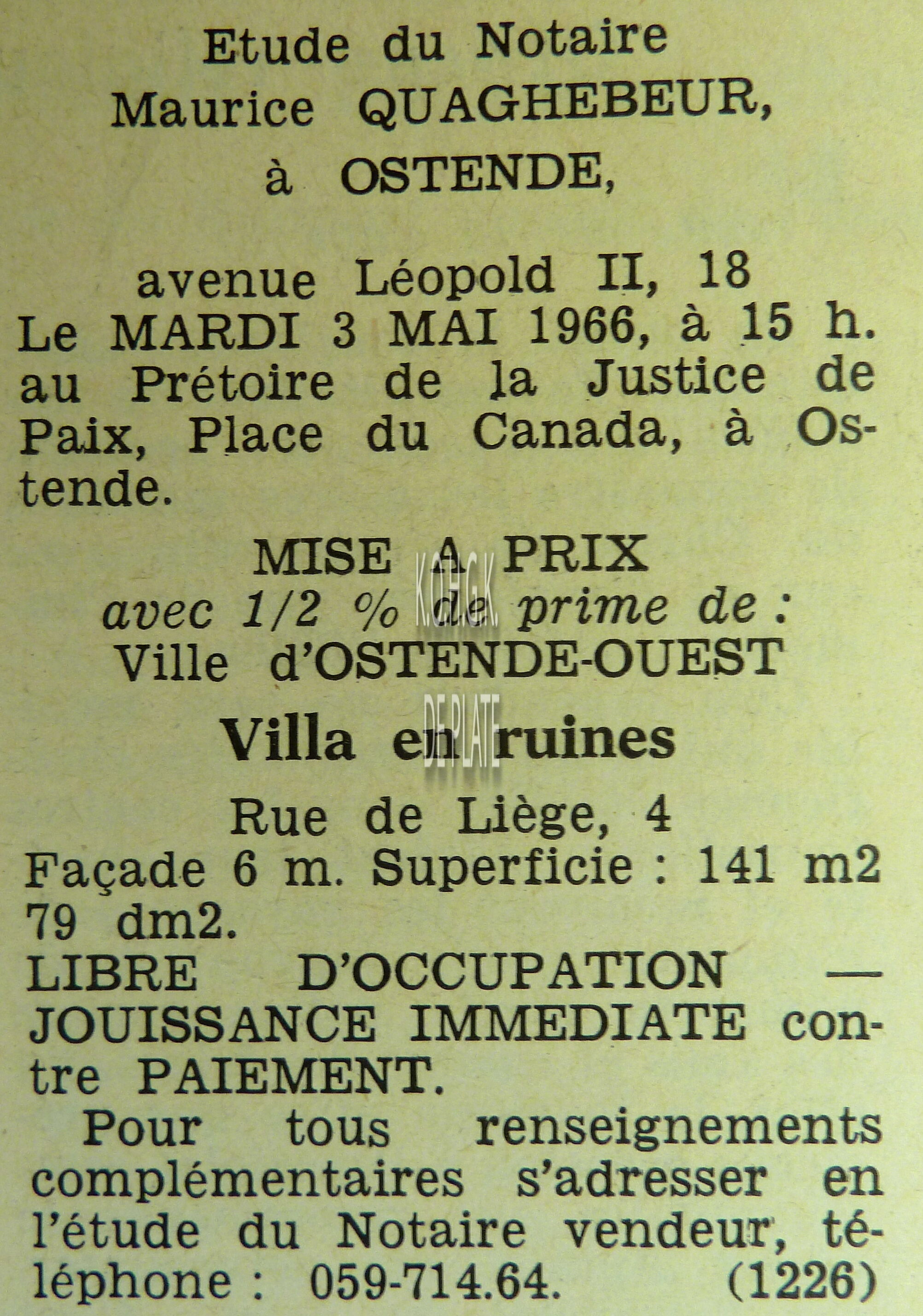Advertentie : Etudes des notaires F.J. Van Caillie et I. Muylle. Vente publique. "Strand Hotel". Angle du Quai des Pêcheurs et du Parvis SS. Pierre et Paul