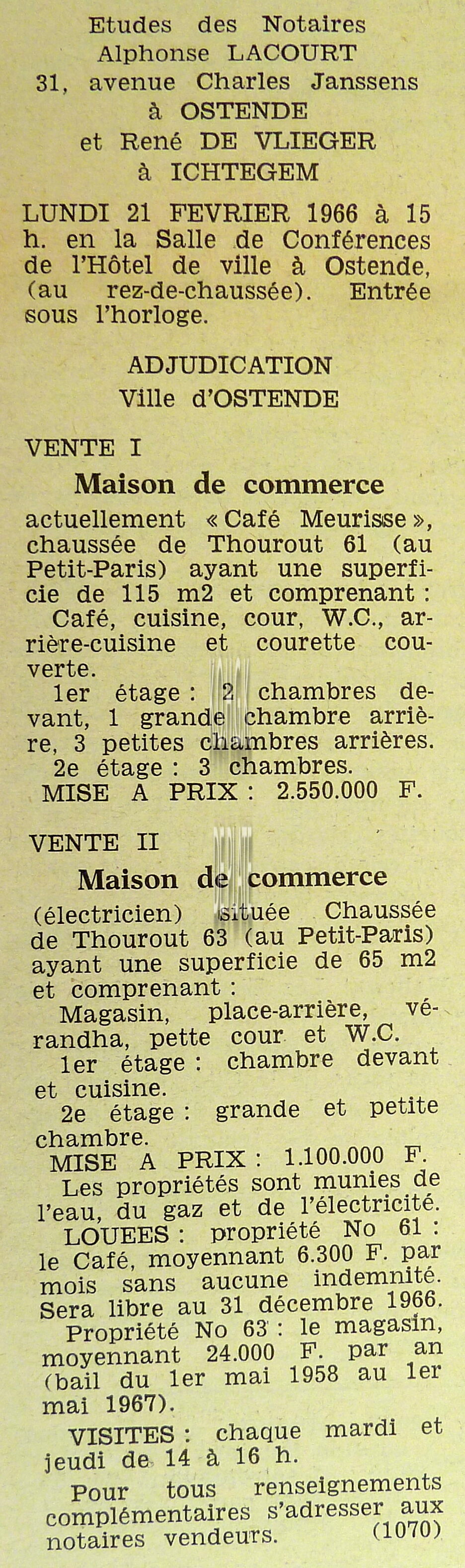 Advertentie : Etudes des notaires Alphonse Lacourt et René De Vieger. Vente publique. Vente I : Maison de commerce "Café Meurisse", Chaussée de Thourout 61. Vente II : Maison de commerce, electricien, Chaussée de Thourout 63