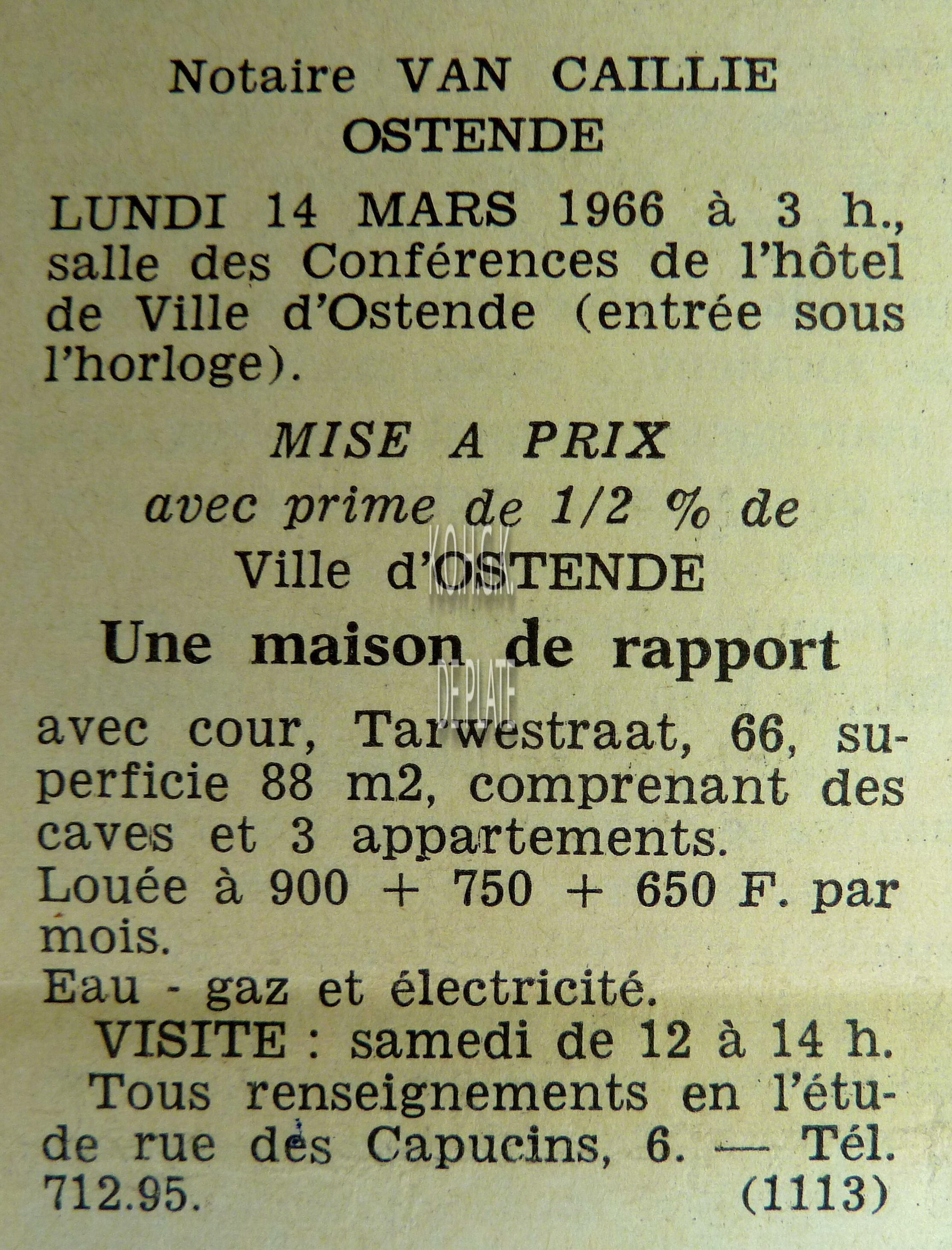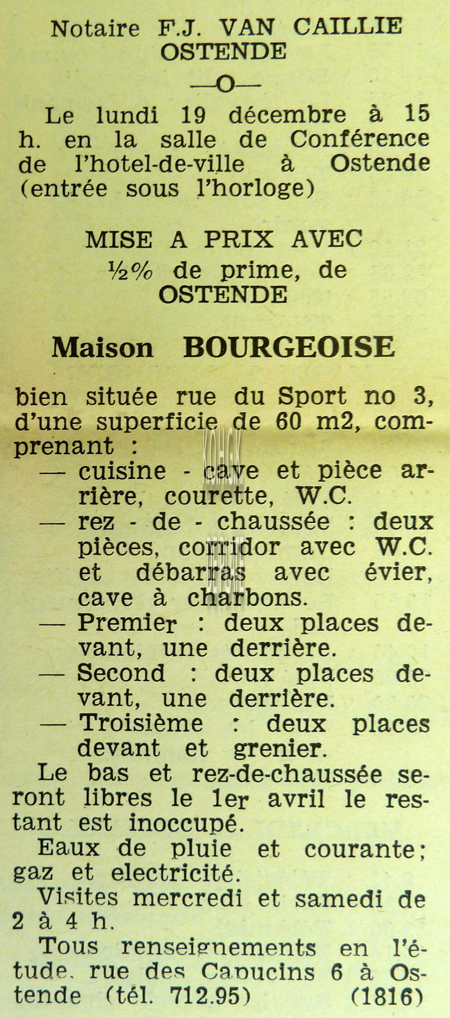 Advertentie : Etude du notaire F.J. Van Caillie. Vente publique. Un bloc d'immeubles. Nieuwpoortsteenweg 21 et 27. Toekomststraat 1, 3 et 5.
