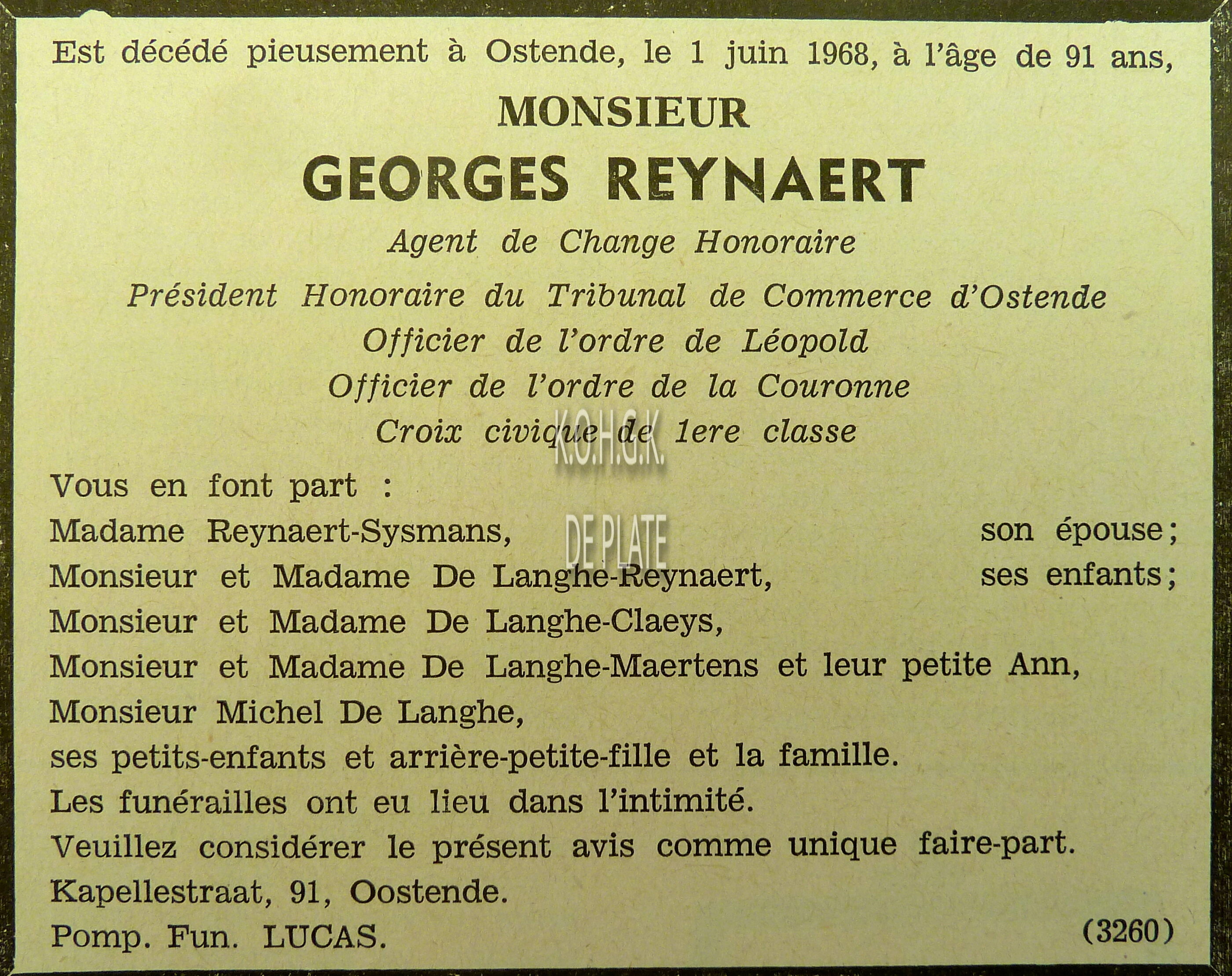 Formaat : 62 x 85 cm. Kennisgeving uitgaande van de burgemeester A. Liebaert van het bevel van generaal Clooten ter herinnering aan de bevolking van de plicht inlichtingen te geven aan de politie over het verblijf van personen die in Oostende niet gedomicilieerd zijn