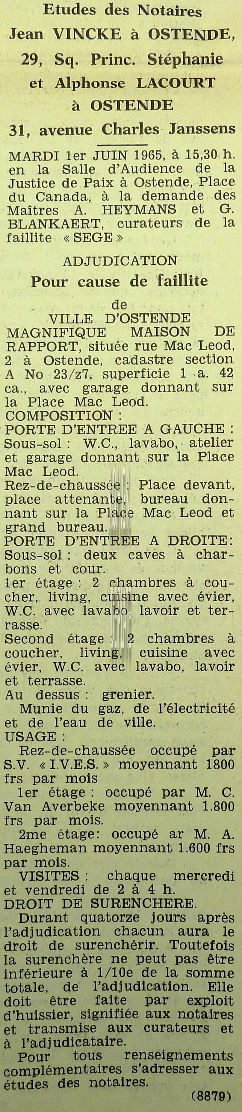 Advertentie : Etudes des notaires Jean Vincke et Alphonse Lacourt. Vente publique. Maison de rapport. Rue Mac Leod 2, Ostende