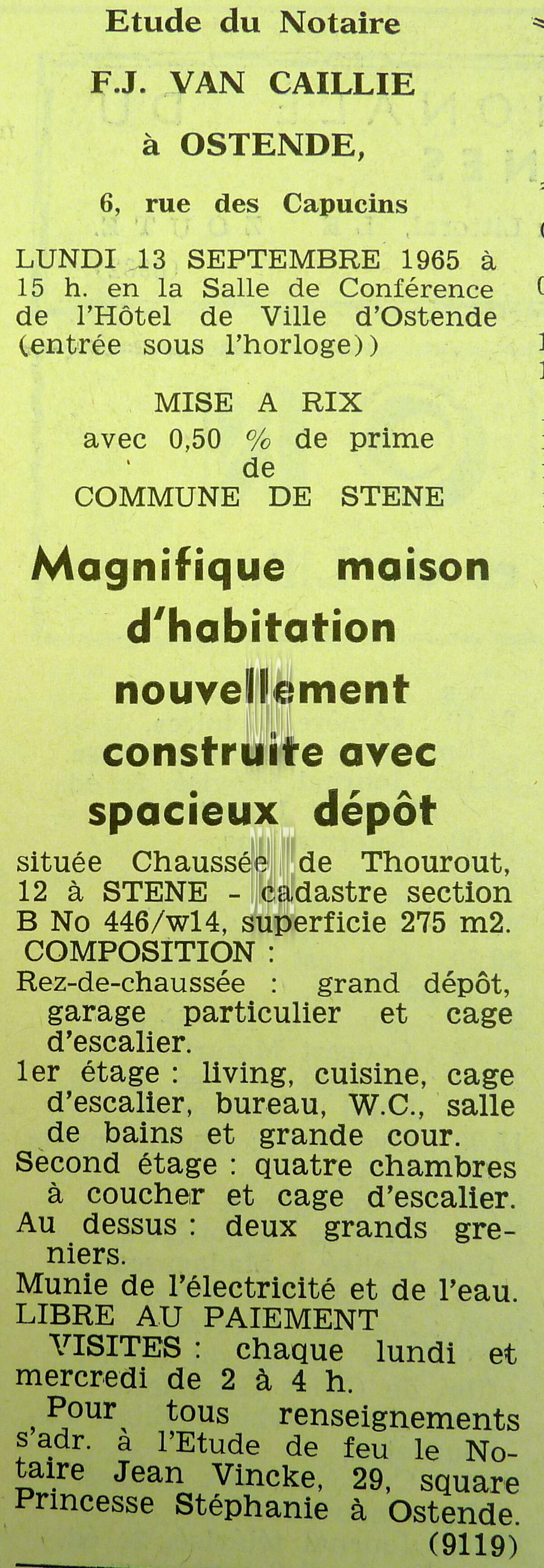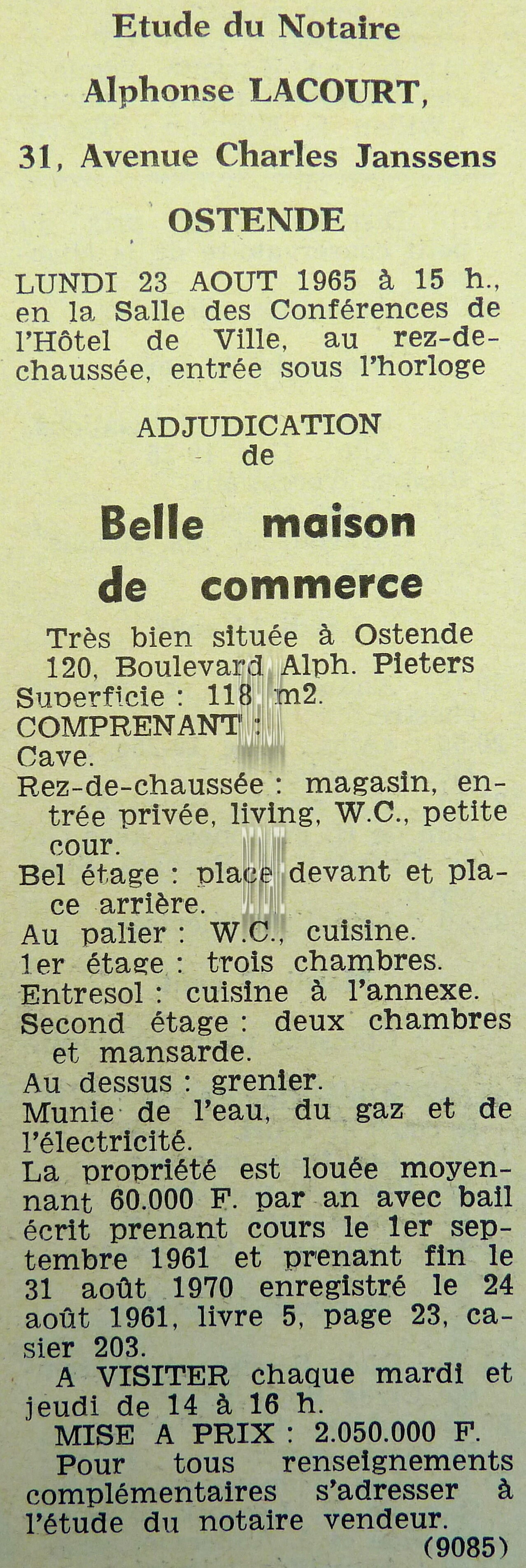 Advertentie : Etude du notaire Maurice Quaghebeur. Vente publique. Grande et renommée maison de commerce. Rue de Flandre, 44 Ostende