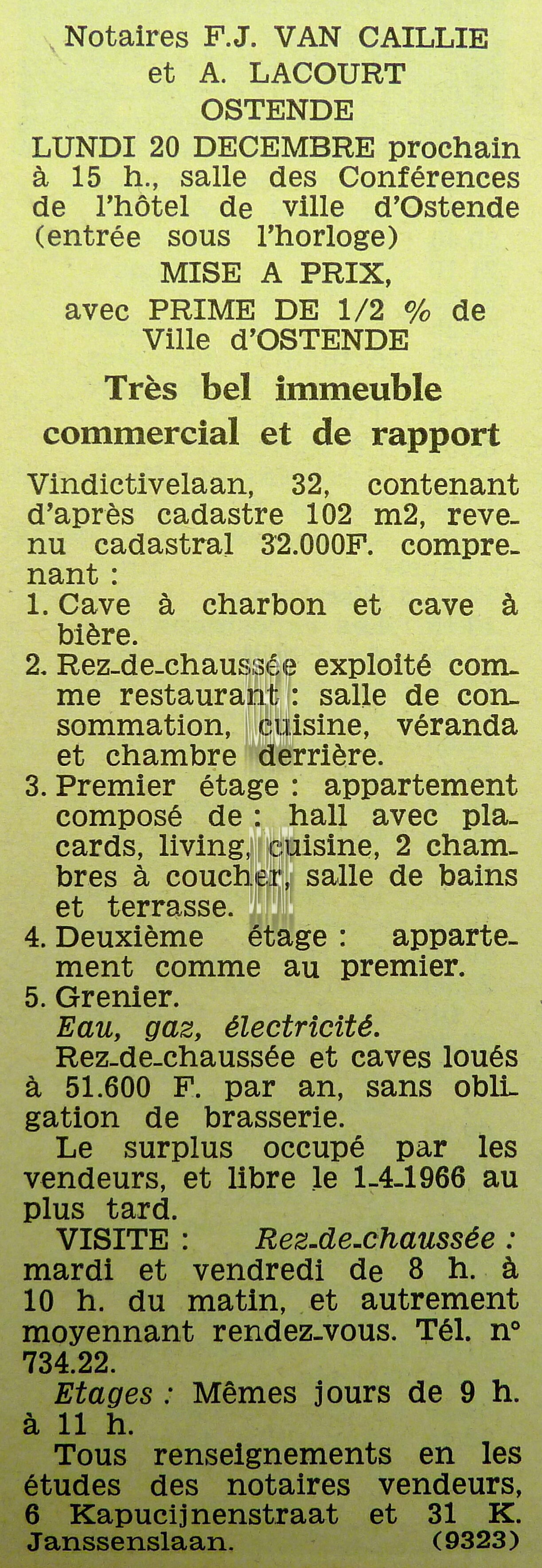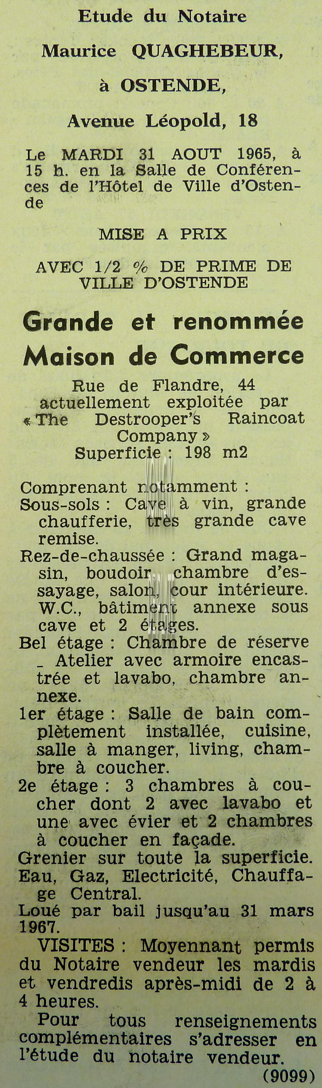 Advertentie : Etude du notaire Maurice Quaghebeur. Vente publique. Grande et renommée maison de commerce. Rue de Flandre, 44 Ostende