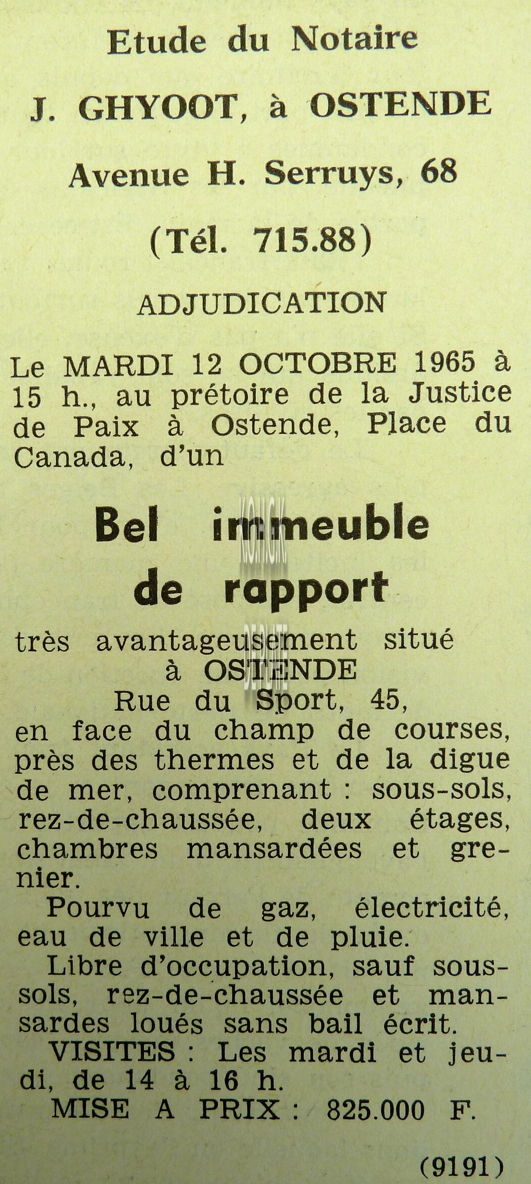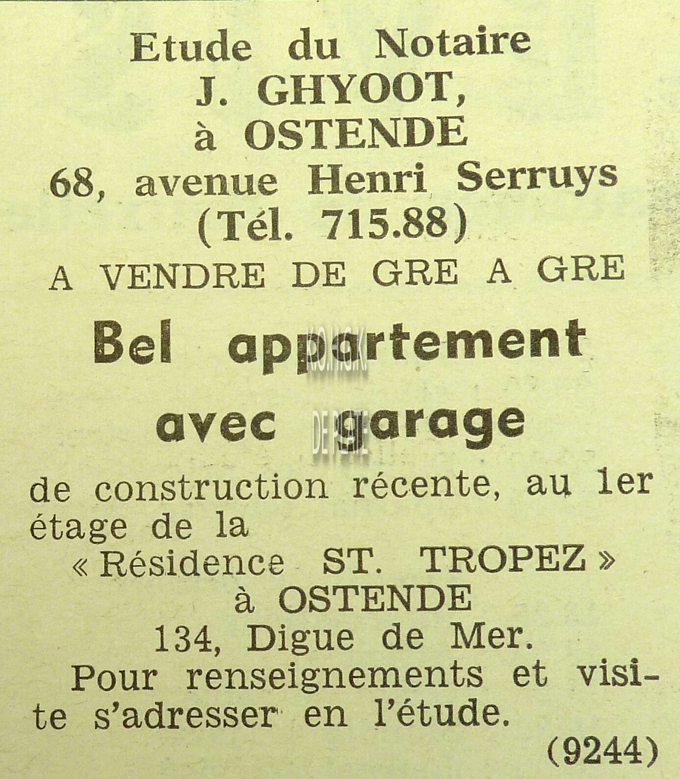 Advertentie : Etude du notaire J. Ghyoot. A vendre de gré à gré. Bel appartement avec garage au 1er étage. Résidence St. Tropez. 134, Digue de Mer, Ostende