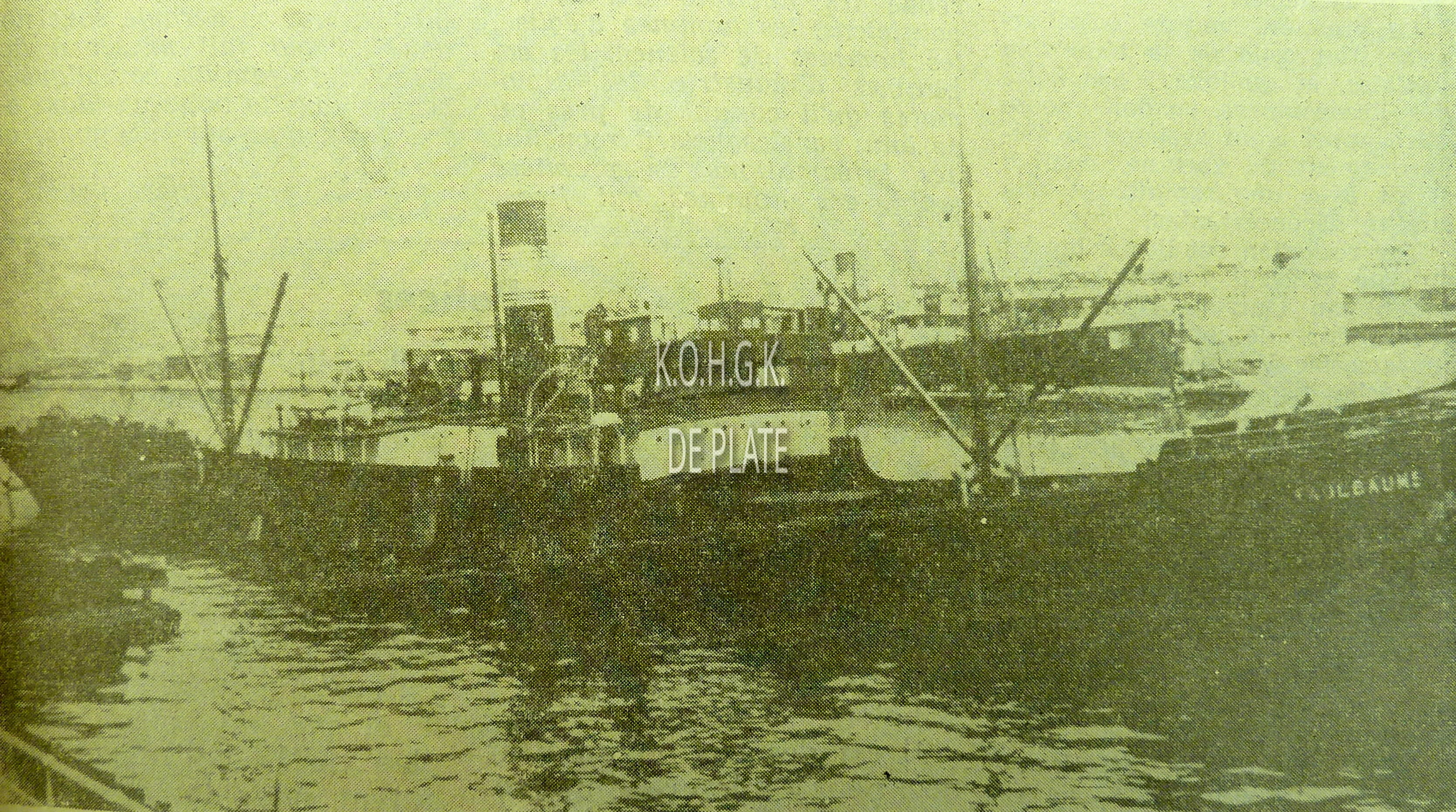 Vissersvaartuigen in het eerste handelsdok langs de Vindictivelaan. Het Zeevaartcommissariaat of Pilotage en het Zeestation
