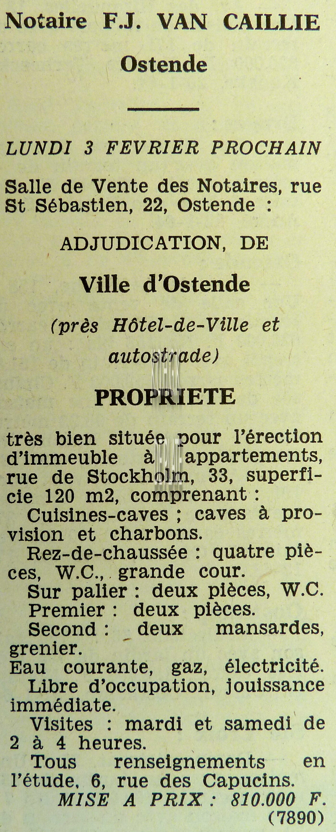 Advertentie : Etudes des notaires Alphonse Lacourt et Jean De Witte. Vente publique. Lot 1 : Belle maison d'habitation. 44 rue du Froment. Lot 2-6 : Belle parcelle de terrain à bâtir. Rue des Hirondelles, Ostende