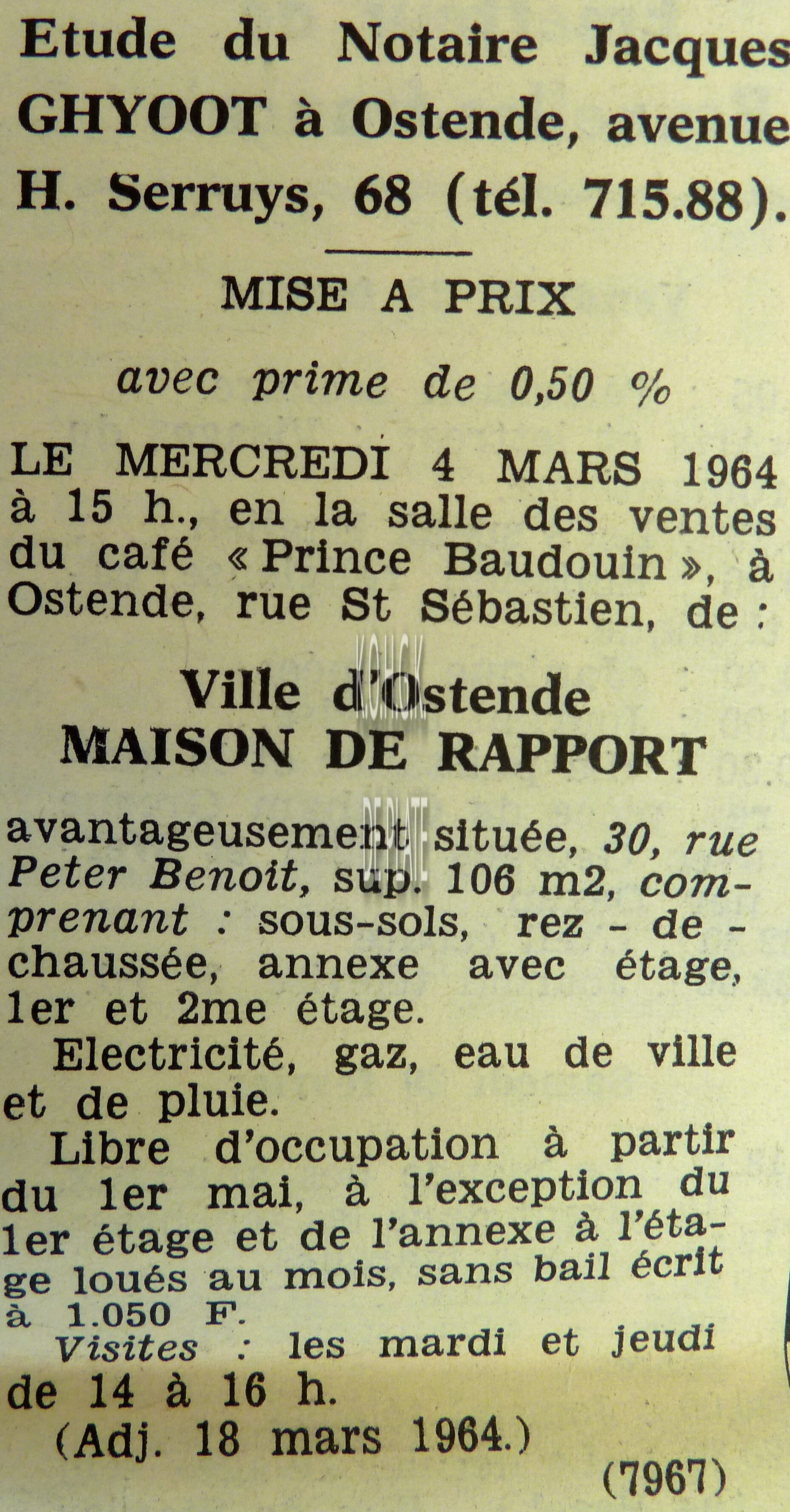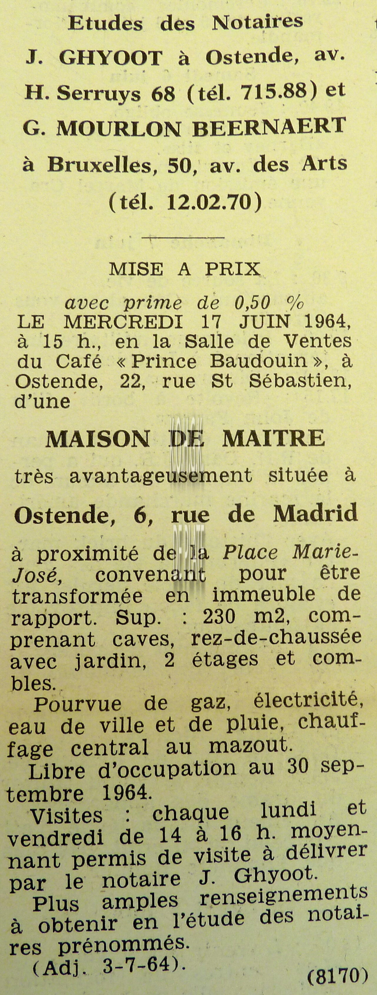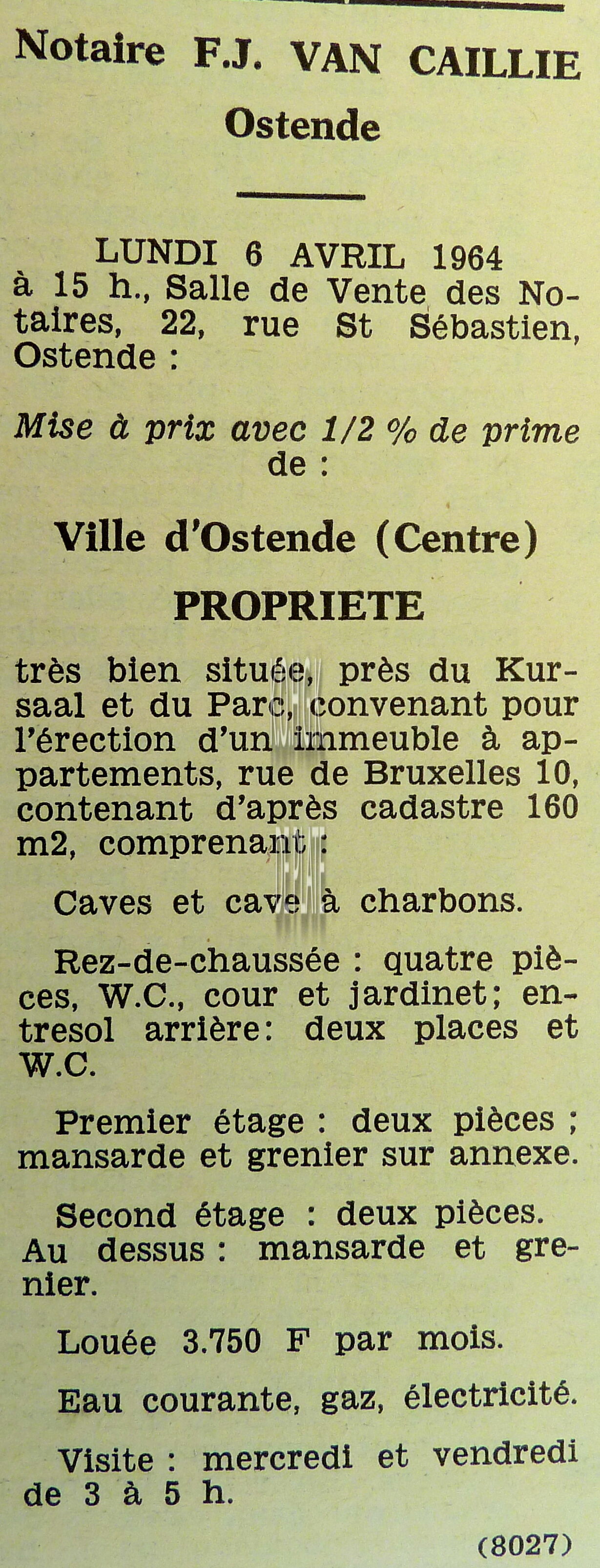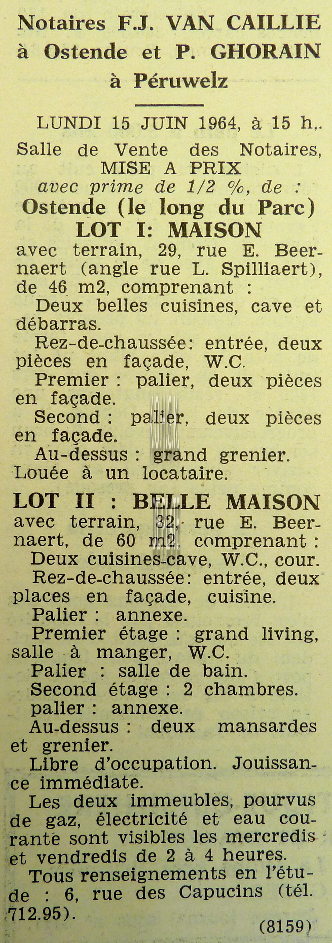 Advertentie : Etudes des notaires F.J. Van Caillie et P. Ghorain. Vente publique. Lot I : Maison. 29, rue E. Beernaert. Lot II : Belle maison. 82, rue E. Beernaert, Ostende