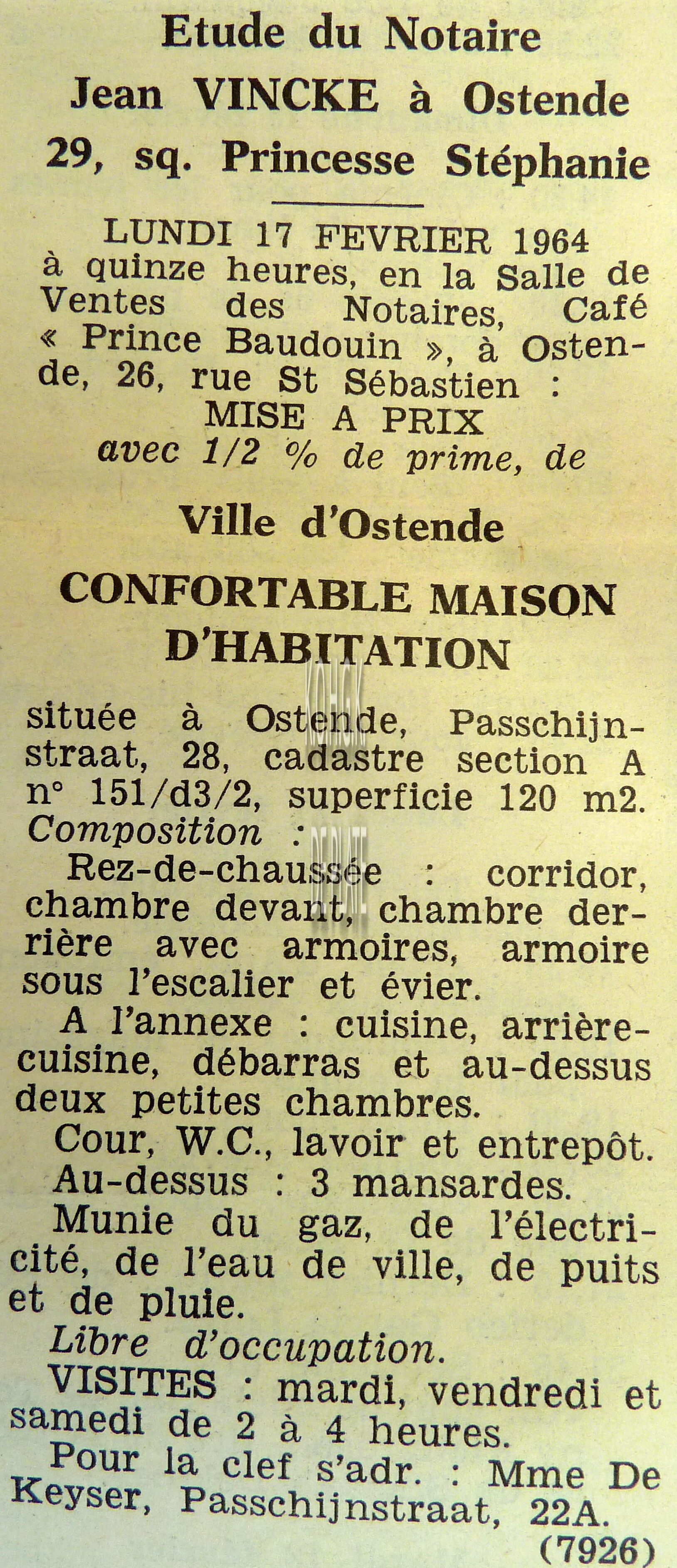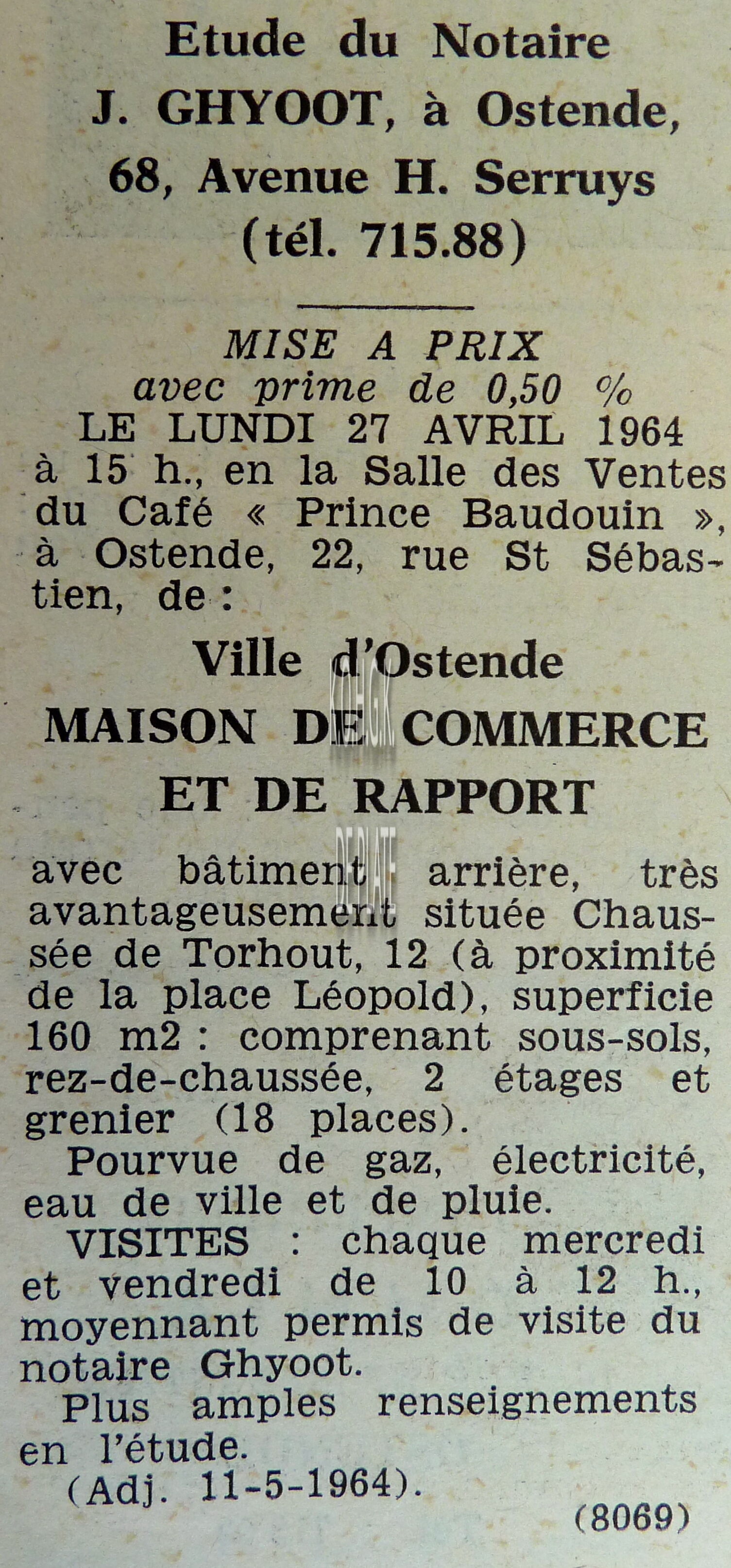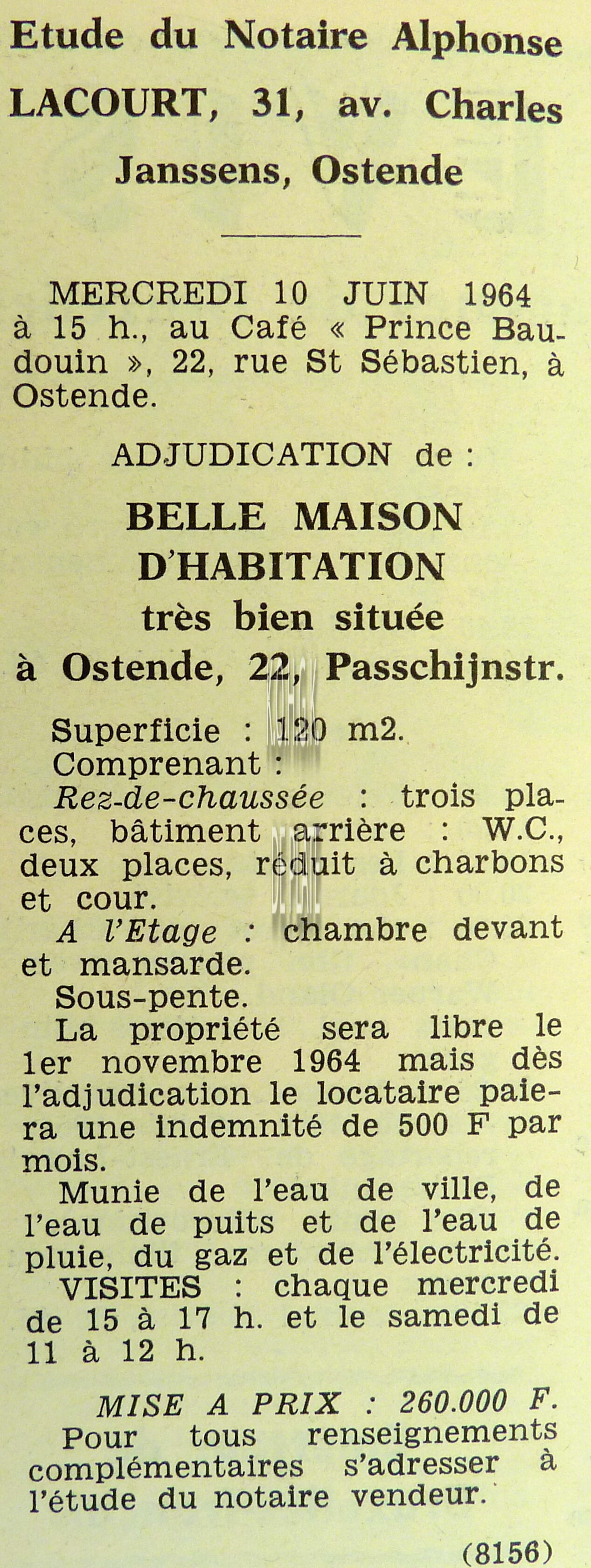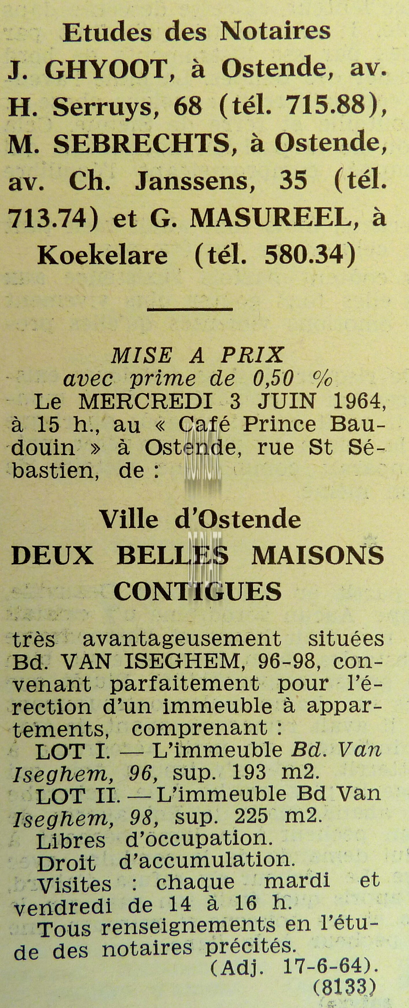 Advertentie : Etudes des notaires F.J. Van Caillie et P. Ghorain. Vente publique. Lot I : Maison. 29, rue E. Beernaert. Lot II : Belle maison. 82, rue E. Beernaert, Ostende