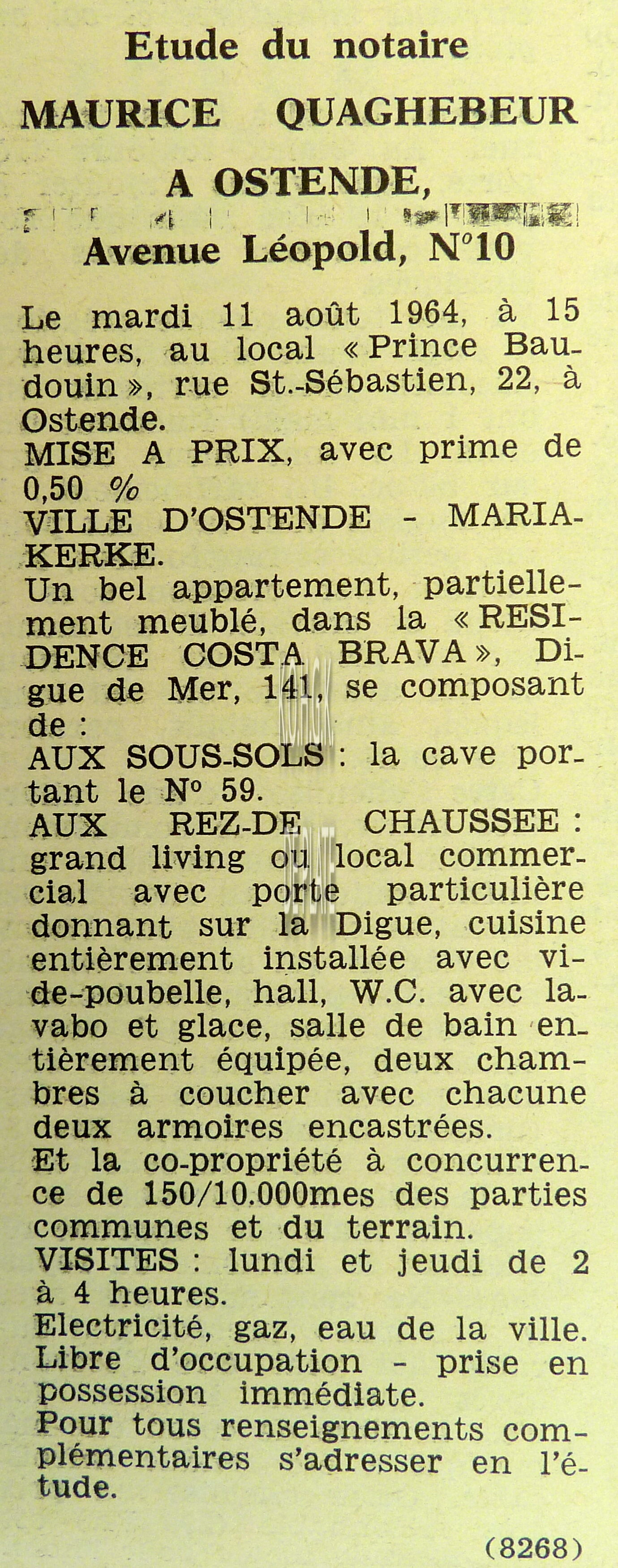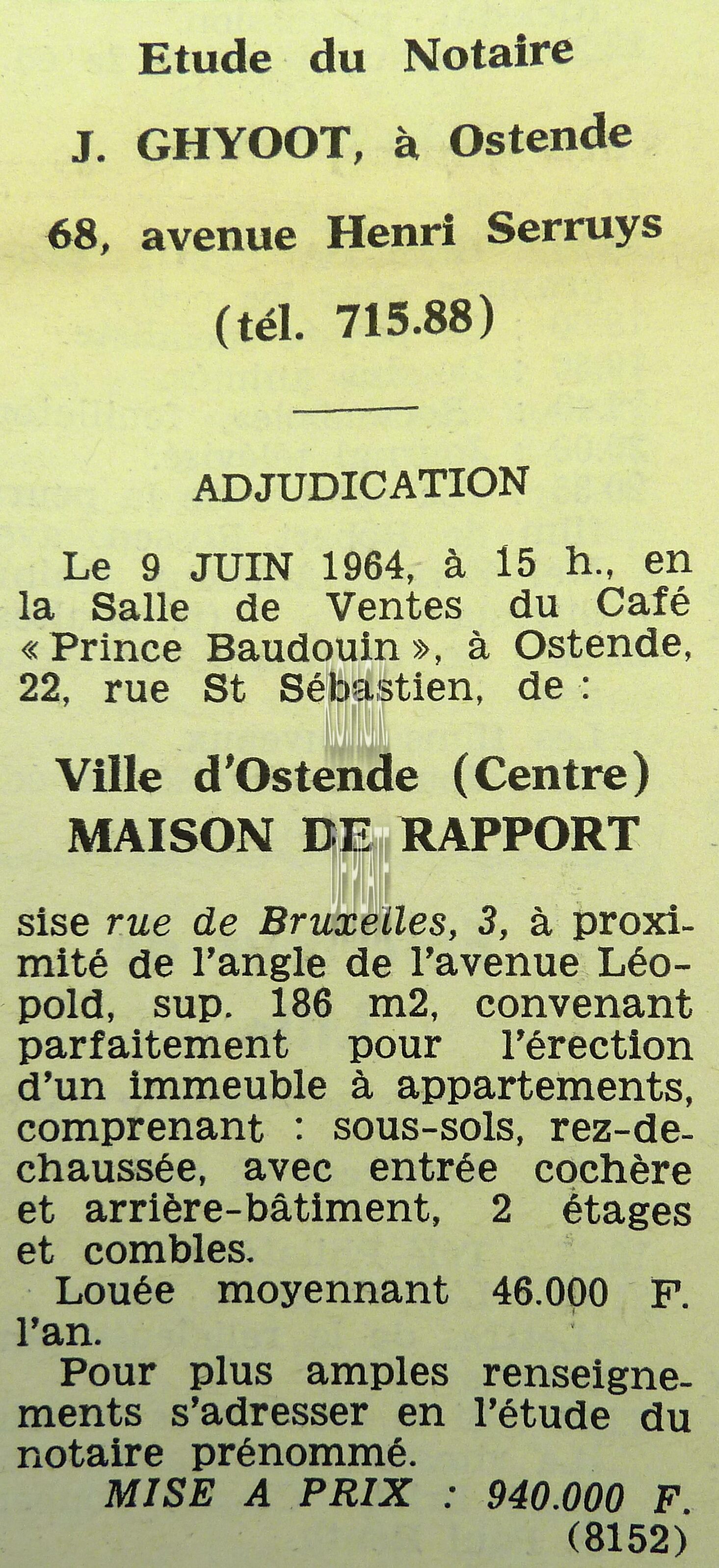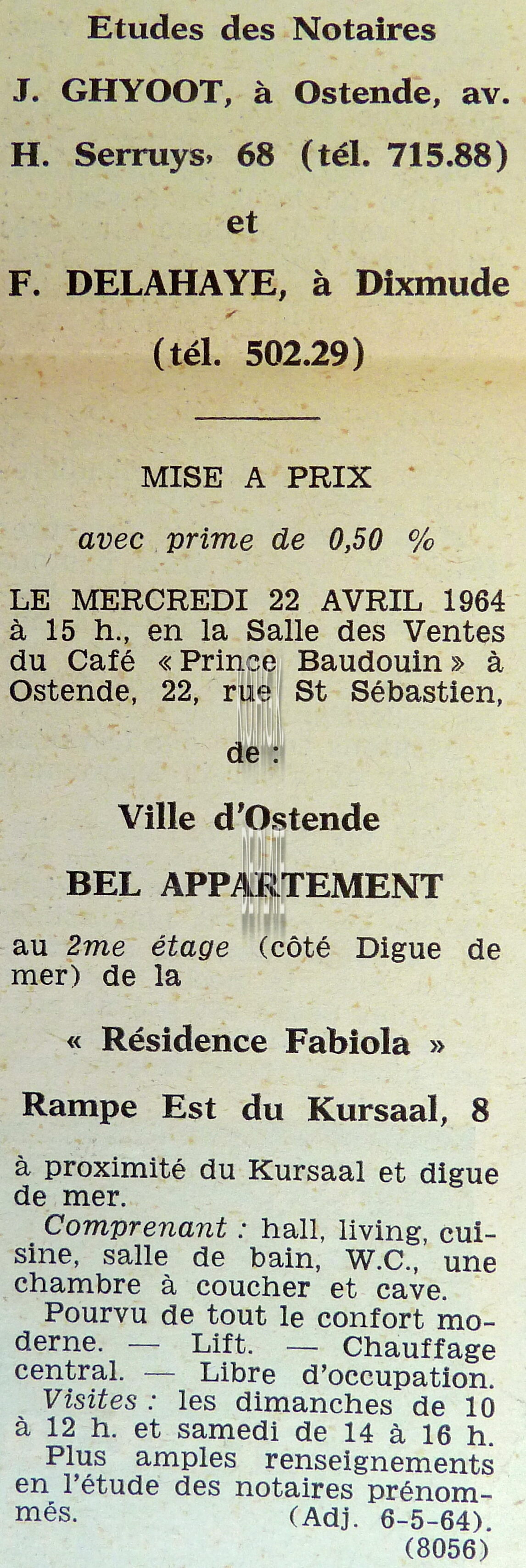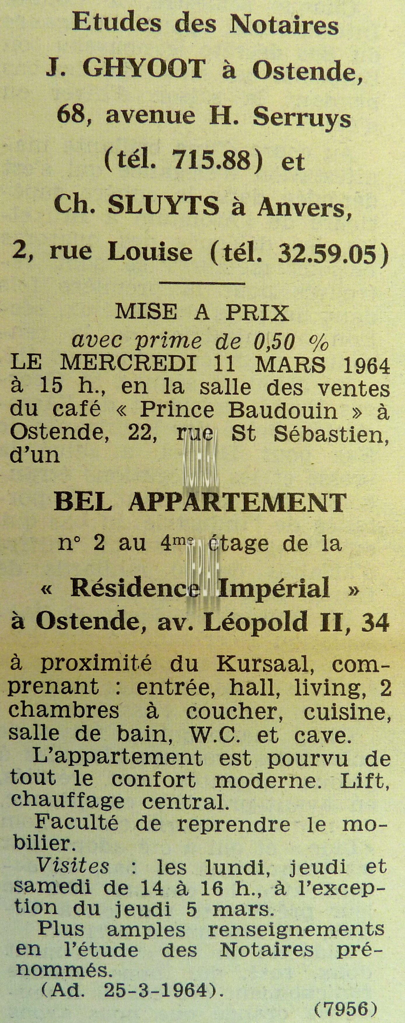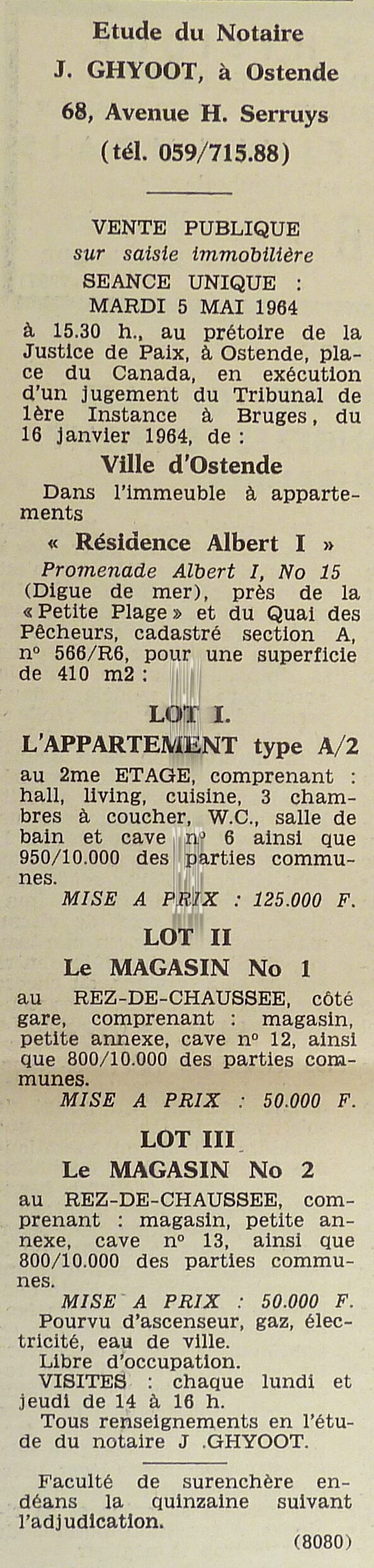 Advertentie : Etude du notaire J. Ghyoot. Vente publique. Lot I : L'appartement type A/2 au 2me étage de l'immeuble "Résidence Albert I', Promenade Albert I, 15 Ostende