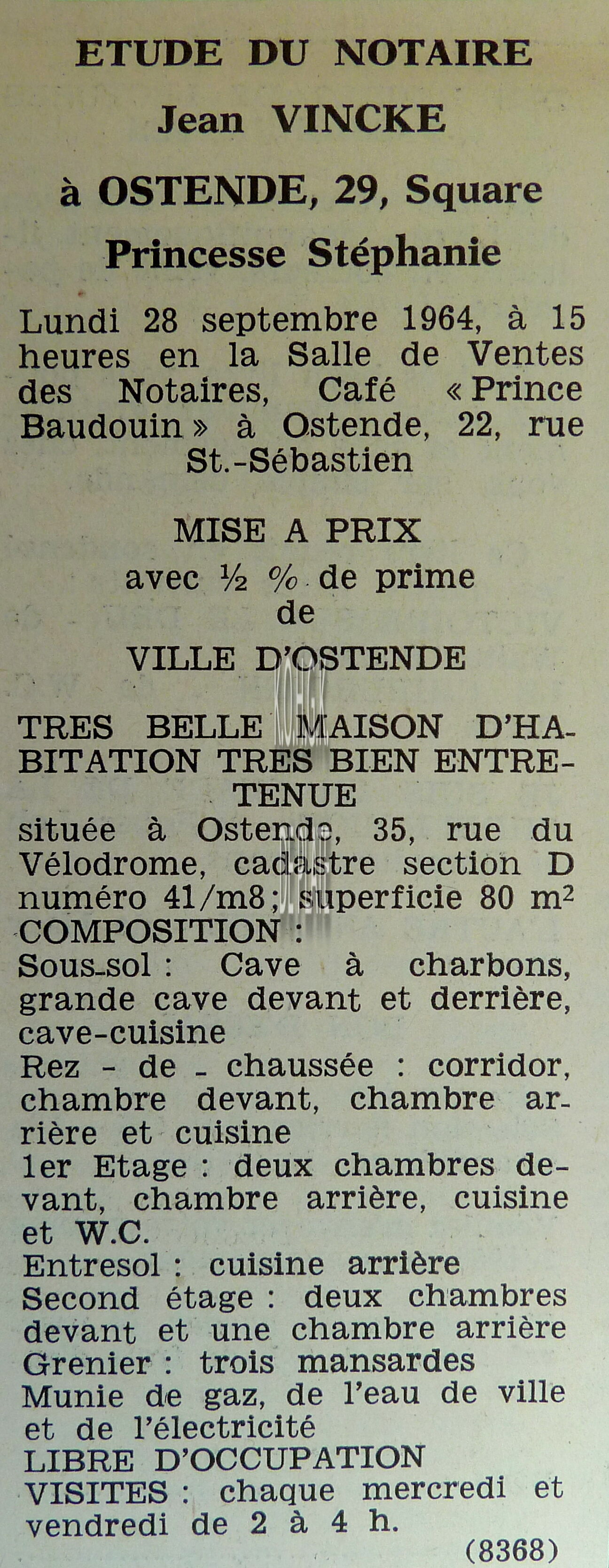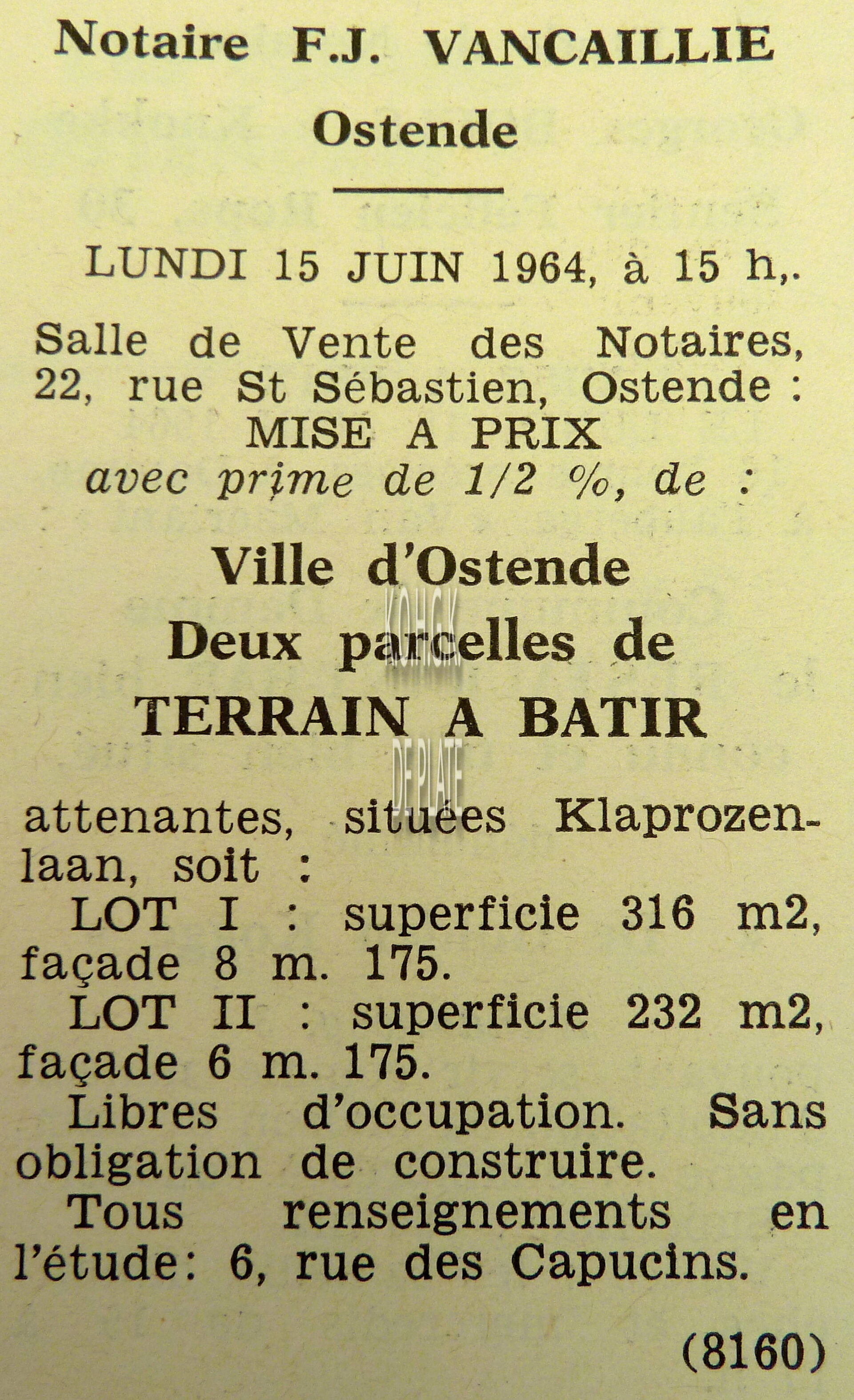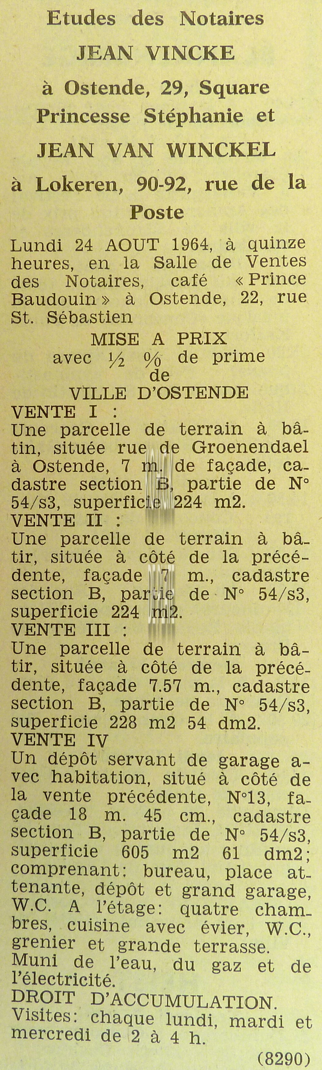 Advertentie : Etudes des notaires Jean Vincke et Jean Van Winckel. Vente publique. Vente I, II et III : Parcelle de terrain à bâtir. Vente IV : Un dépôt servant de garage avec habitation. Rue de Groenendael 13, Ostende