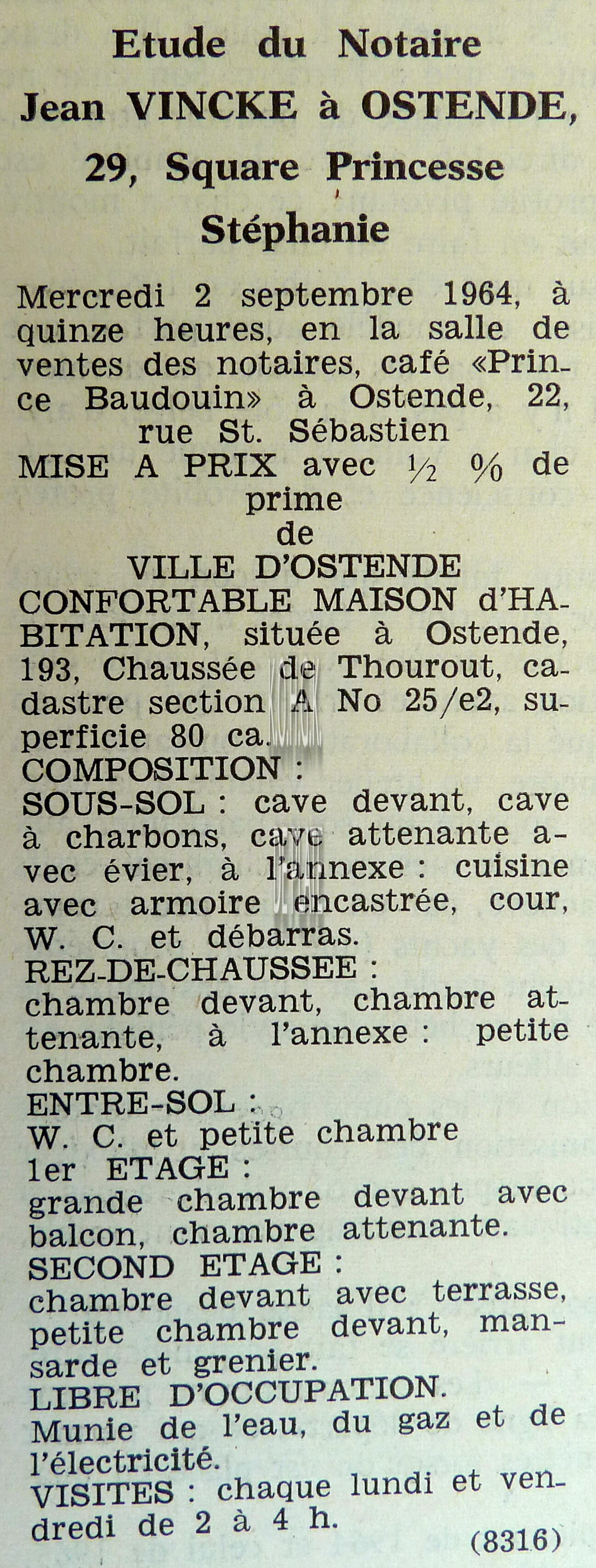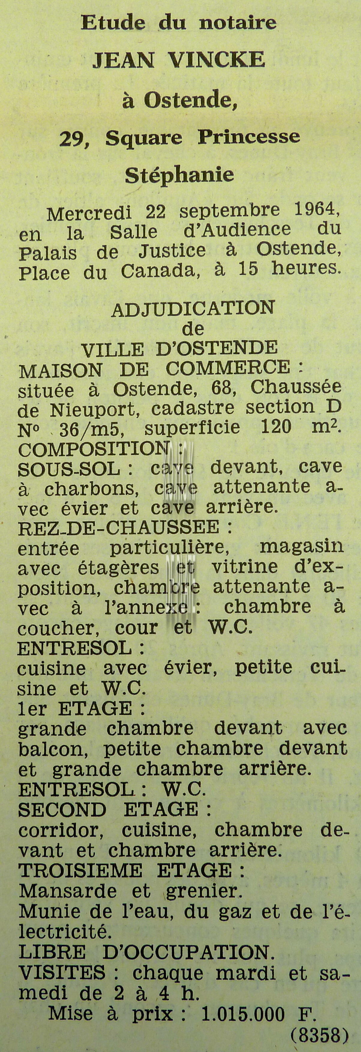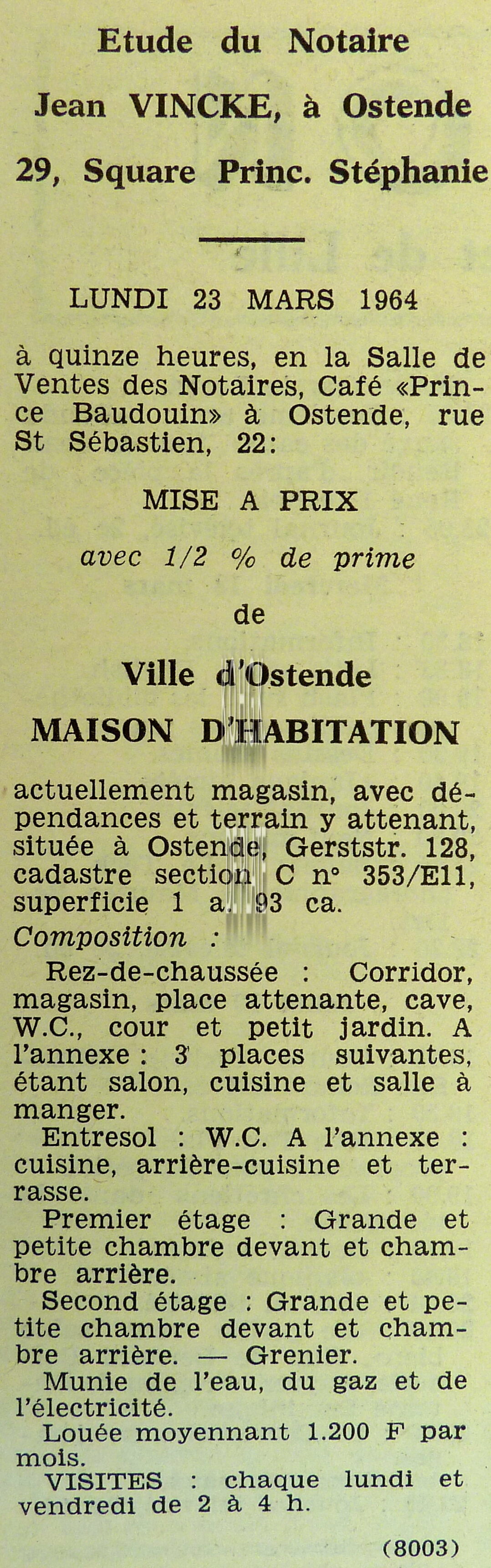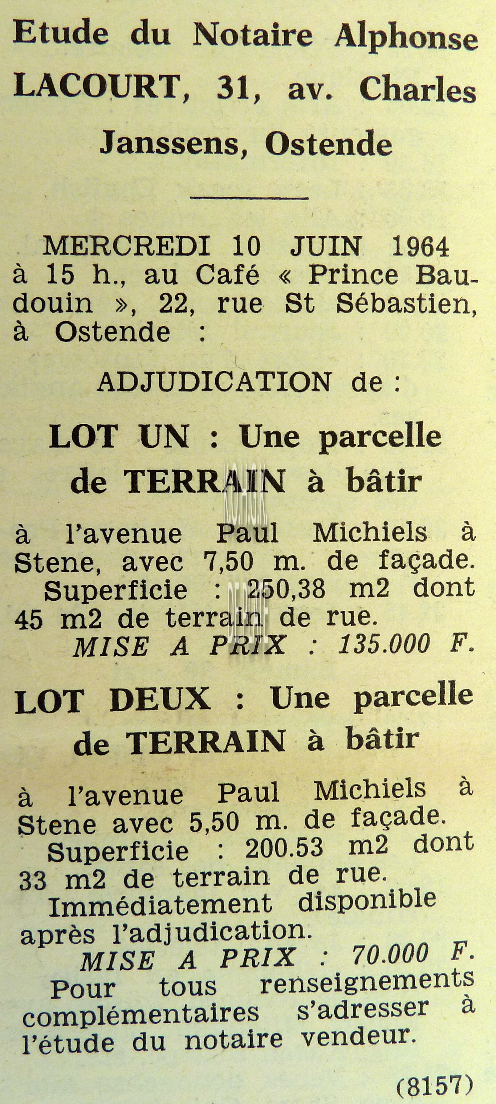 Advertentie : Etudes des notaires Jean Vincke et Jean Van Winckel. Vente publique. Vente I, II et III : Parcelle de terrain à bâtir. Vente IV : Un dépôt servant de garage avec habitation. Rue de Groenendael 13, Ostende