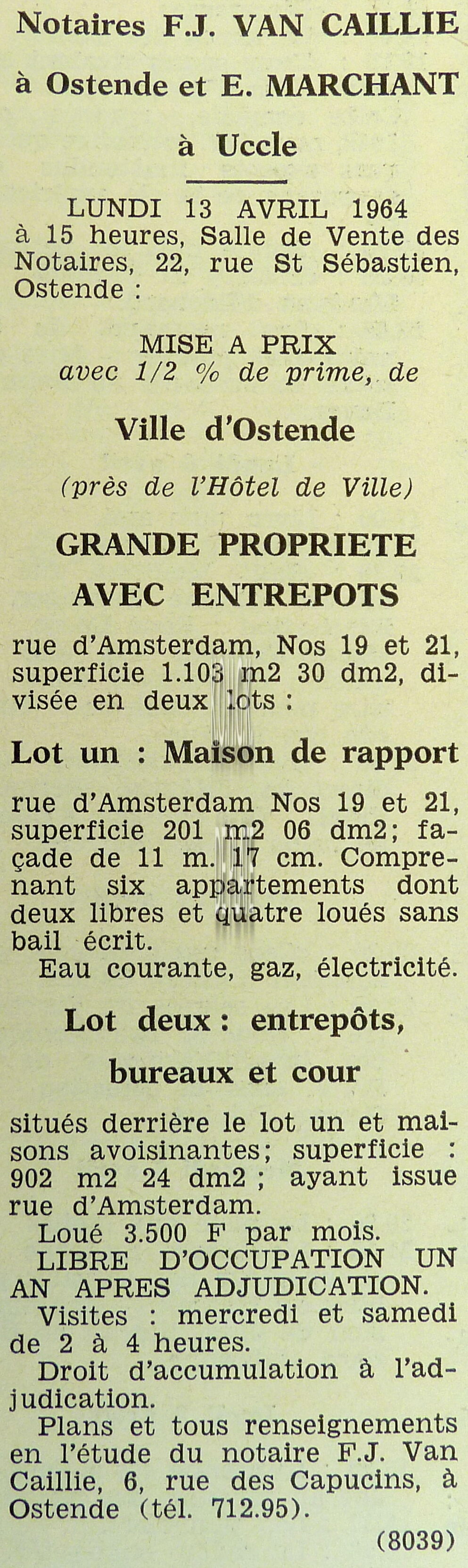 Advertentie : Etudes des notaires F.J. Van Caillie et E. Marchant. Vente publique. Grande propriété avec entrepôts. Rue d'Amsterdam 19 et 21, Ostende