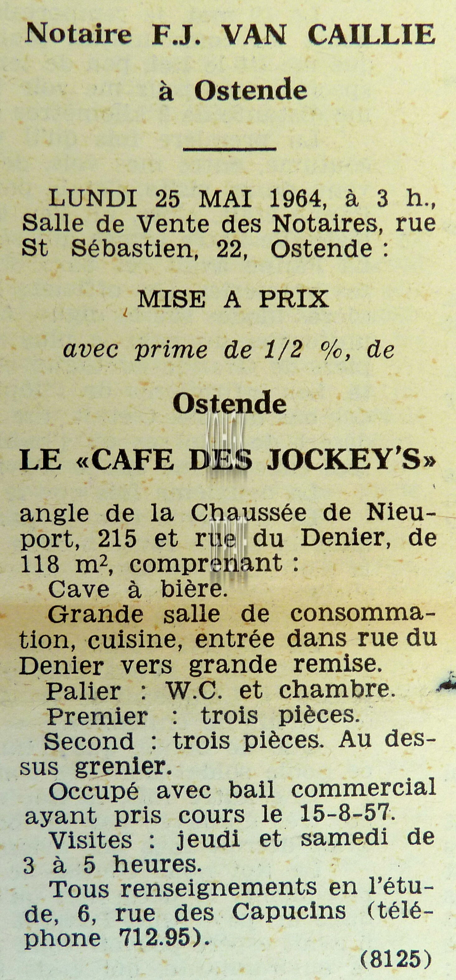 Advertentie : Etude du notaire F.J. Van Caillie. Vente publique. Le "Café des Jockey's". Angle de la Chaussée de Nieuport 215 et rue du Denier. Ostende