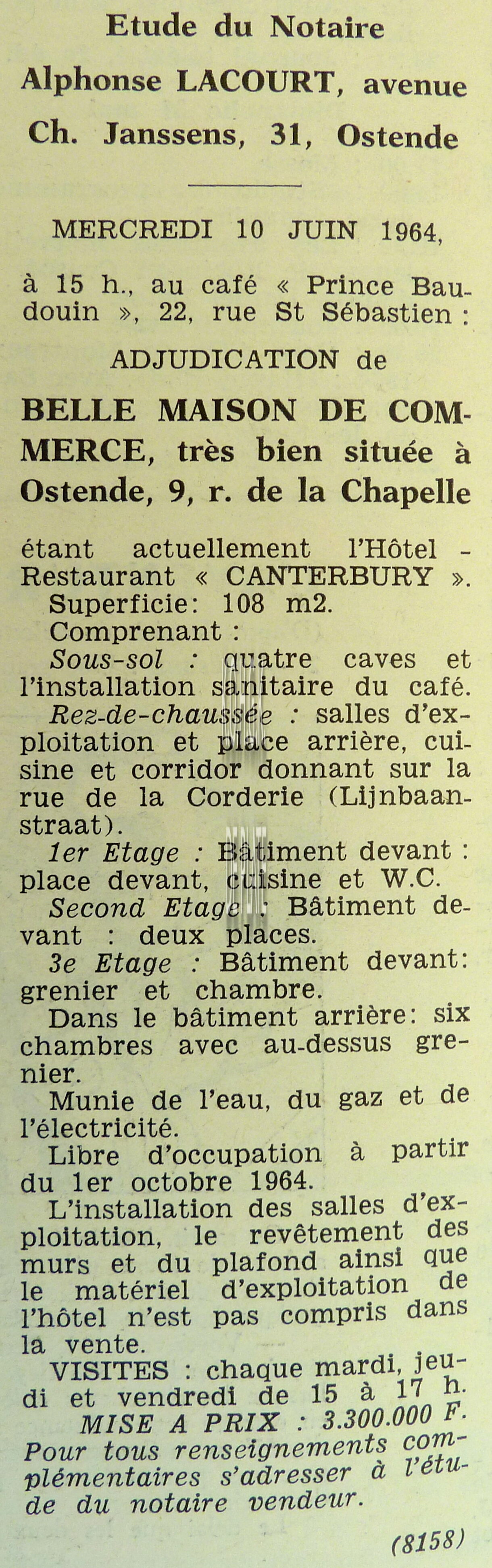 Advertentie : Etude du notaire A. Lacourt. Vente publique. Belle maison de commerce. Hôtel-Restaurant "Canterbury", 9, Rue de la Chapelle, Ostende