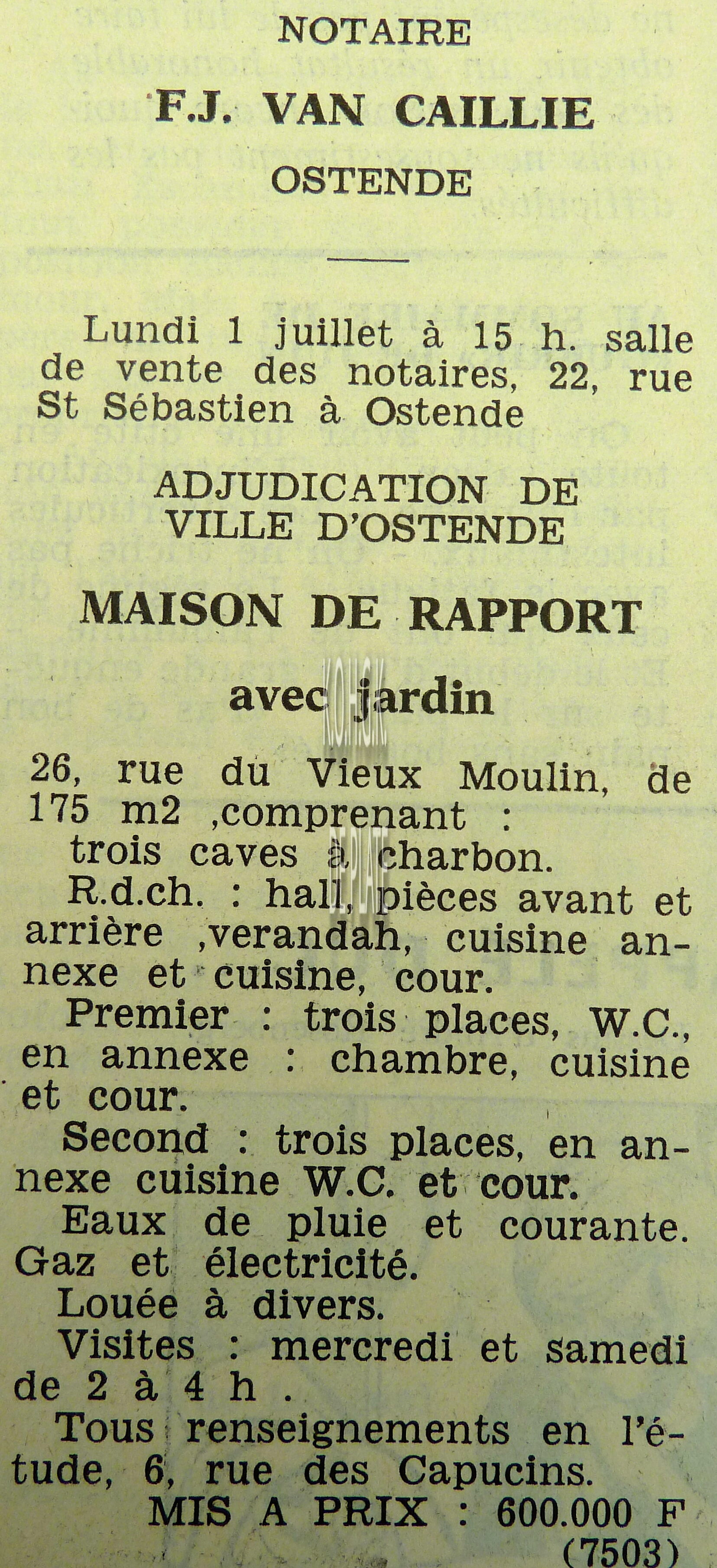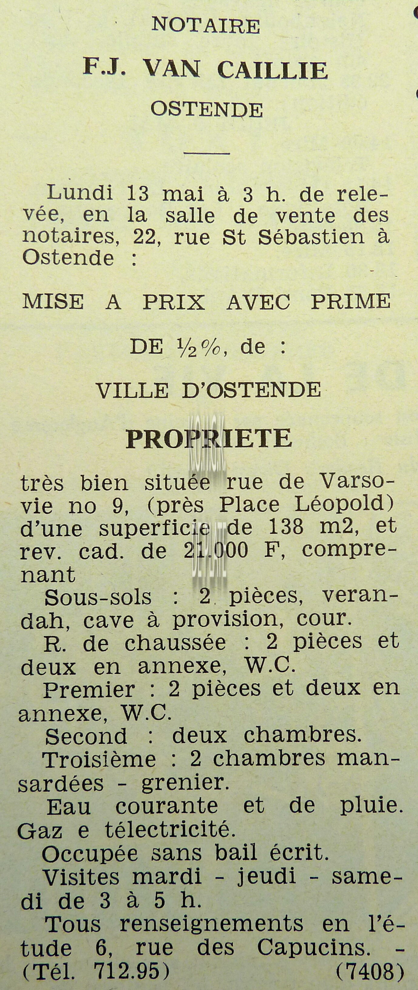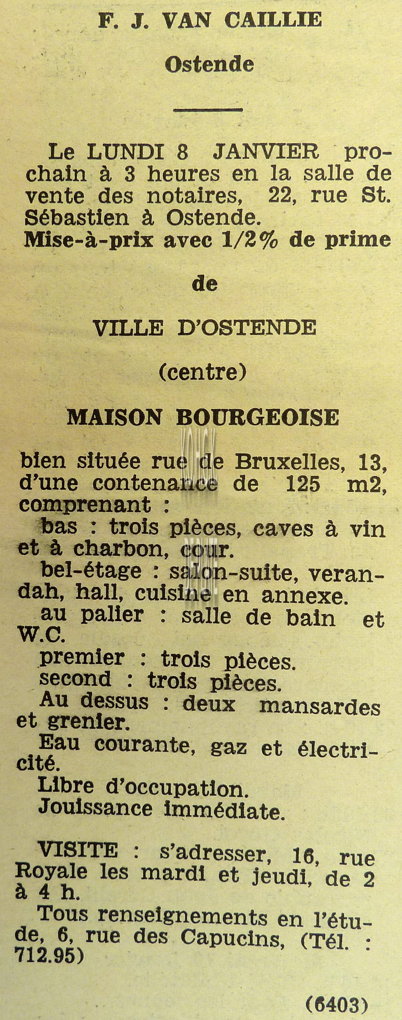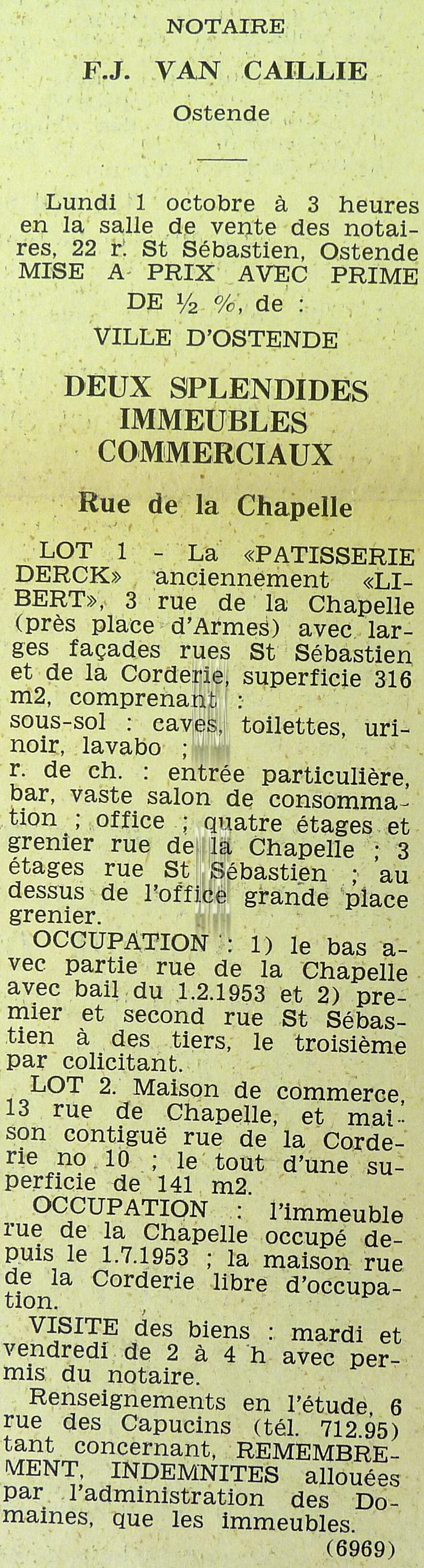 Advertentie : Etude du notaire F.J. Van Caillie. Vente publique. Deux splendides immeubles commerciaux. Lot 1 : La "Patisserie Derck", 3 rue de la Chapelle, Lot 2 : Maison de commerce, 13 rue de la Chapelle, Ostende