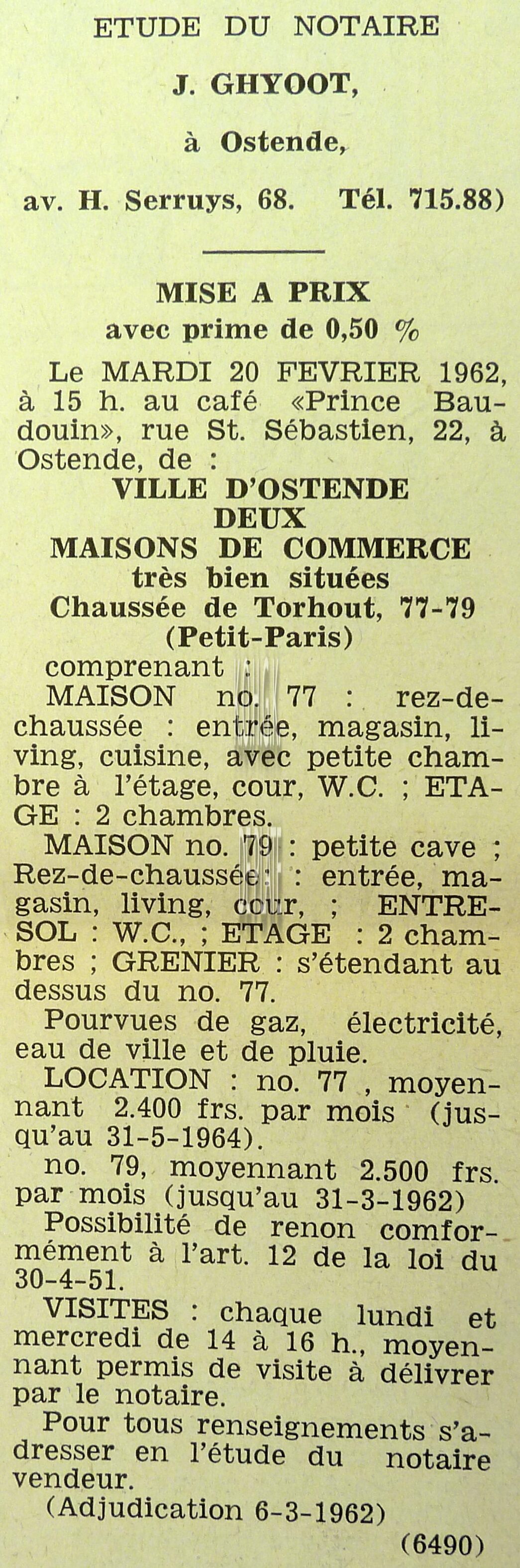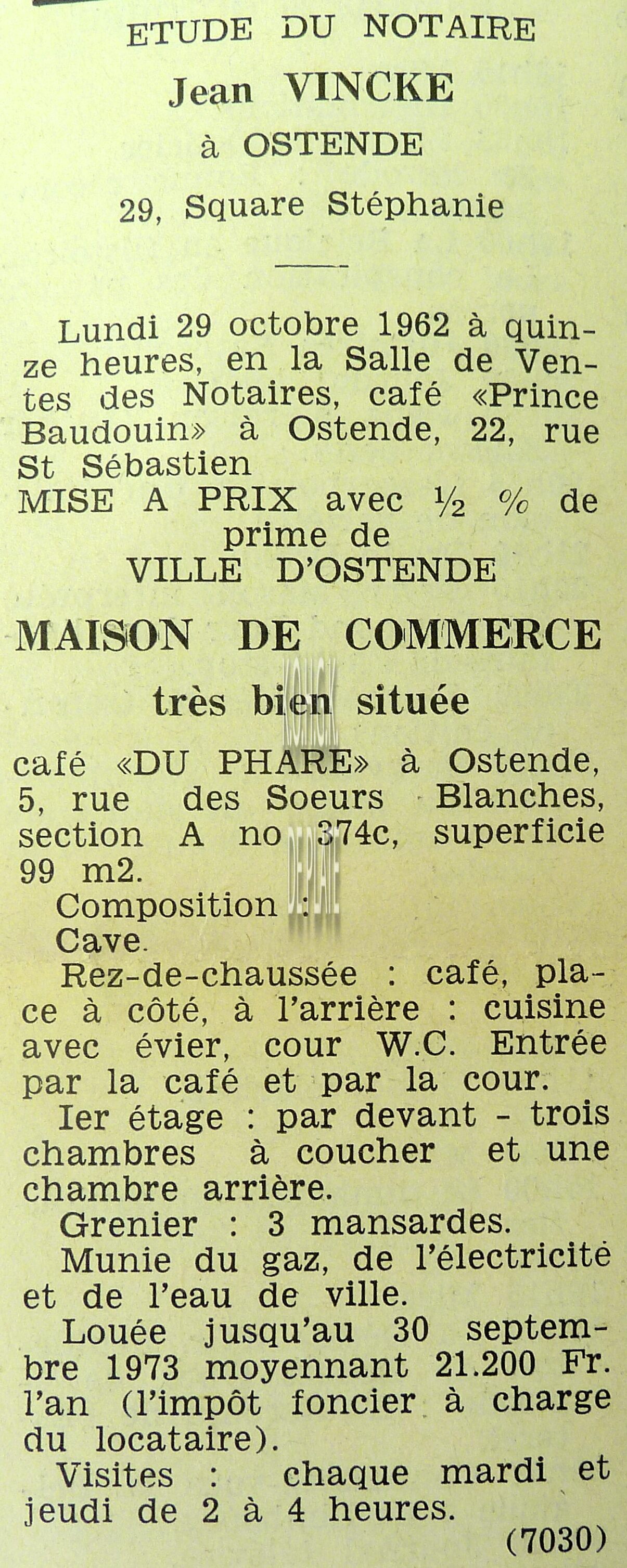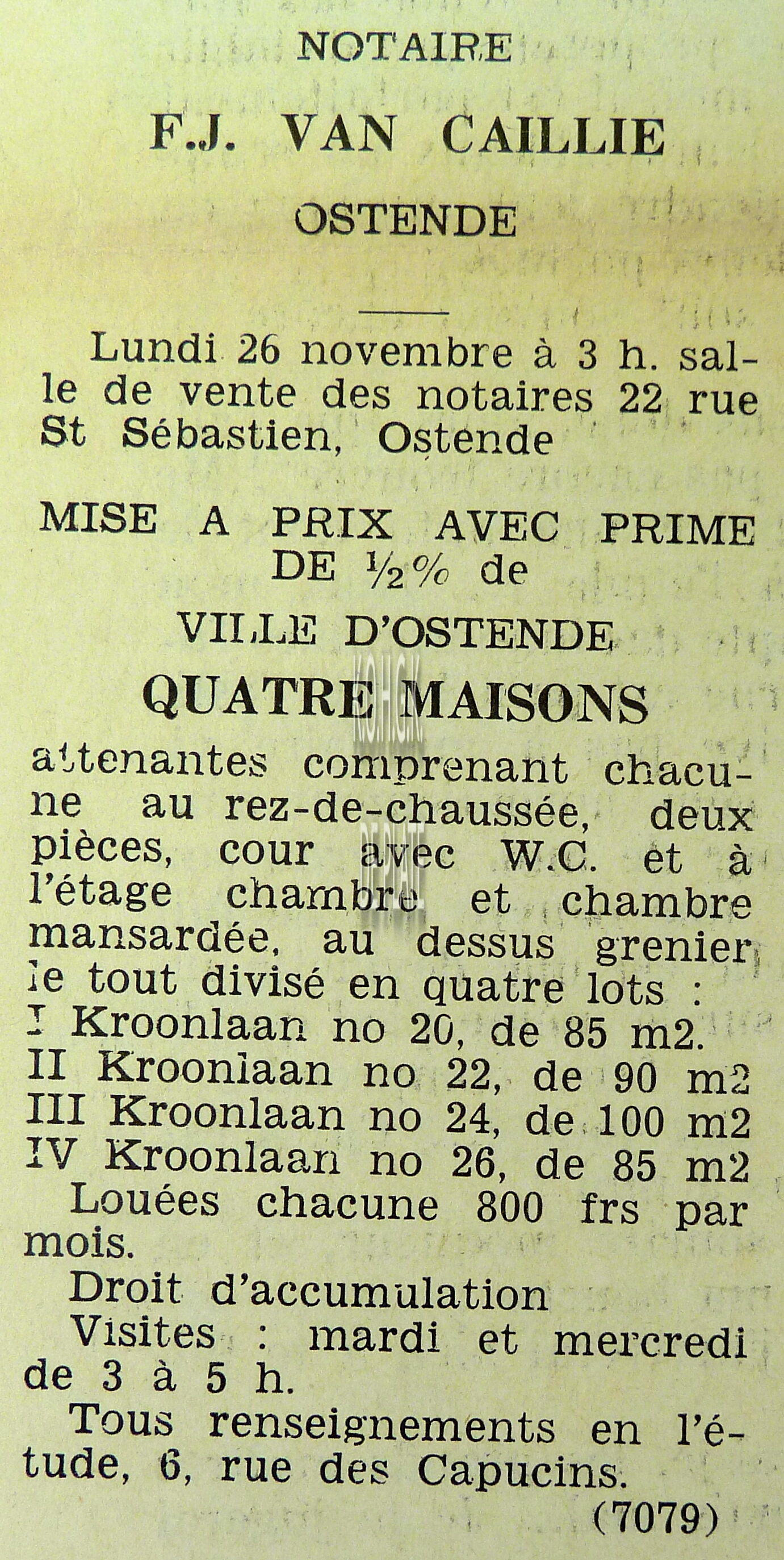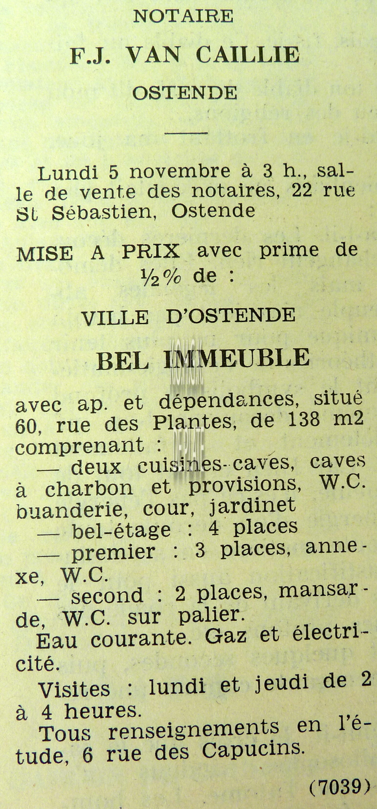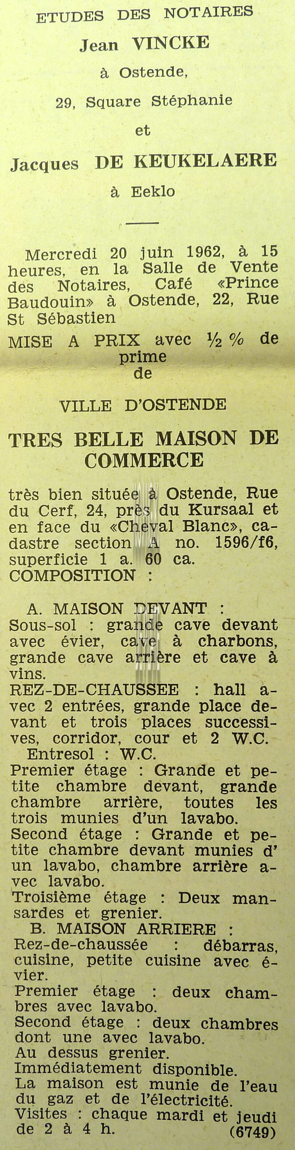 Advertentie : Etude du notaire F.J. Van Caillie. Vente publique. Deux splendides immeubles commerciaux. Lot 1 : La "Patisserie Derck", 3 rue de la Chapelle, Lot 2 : Maison de commerce, 13 rue de la Chapelle, Ostende