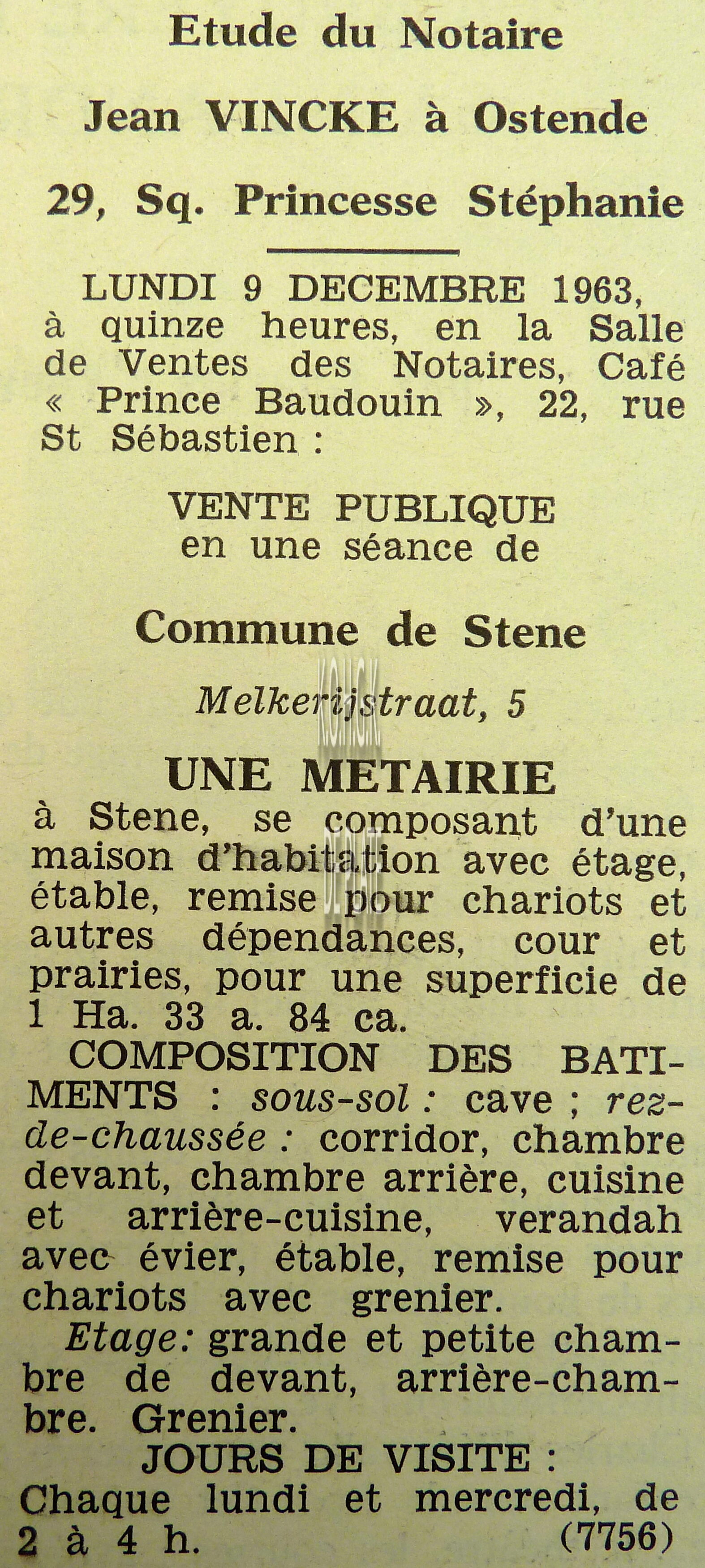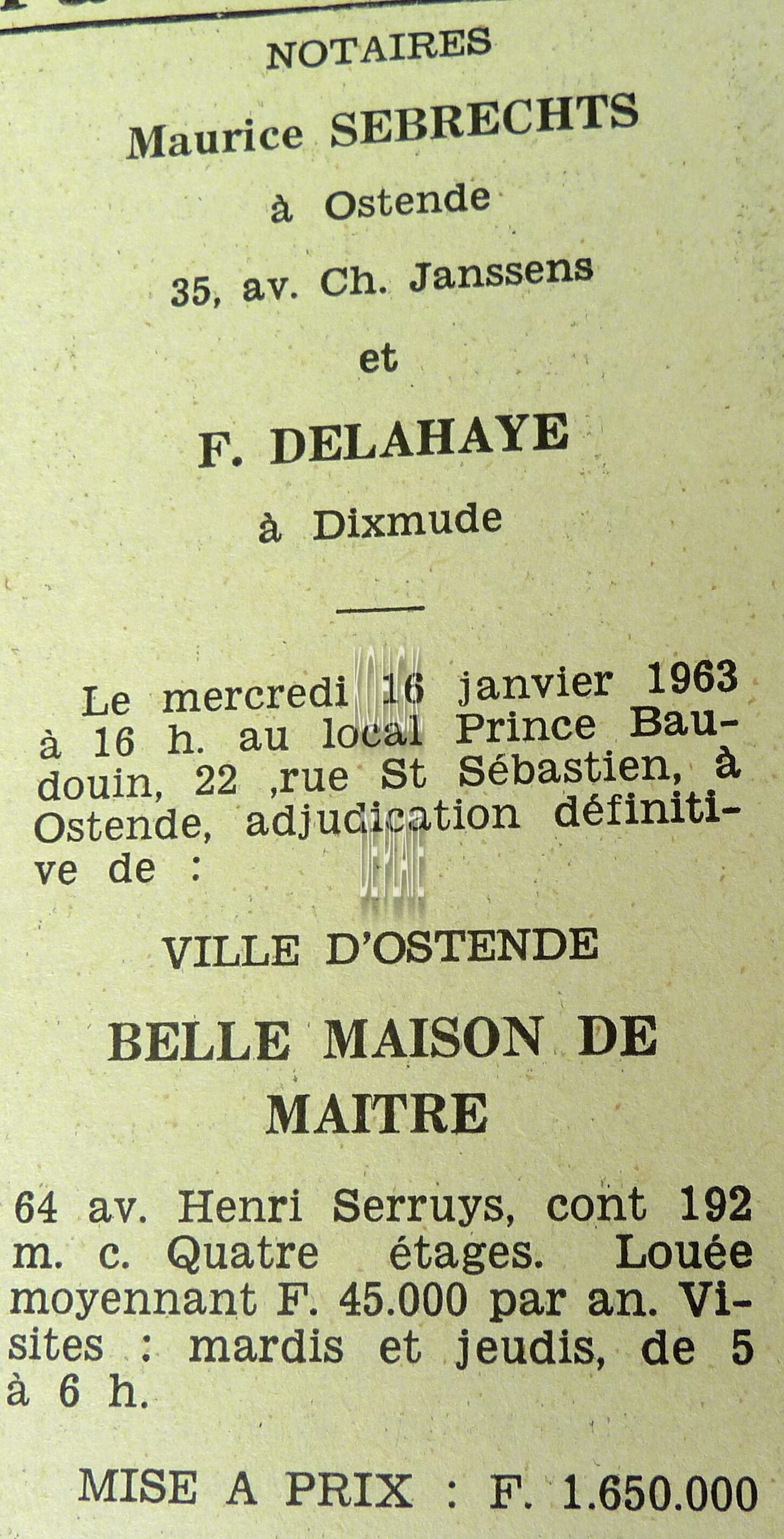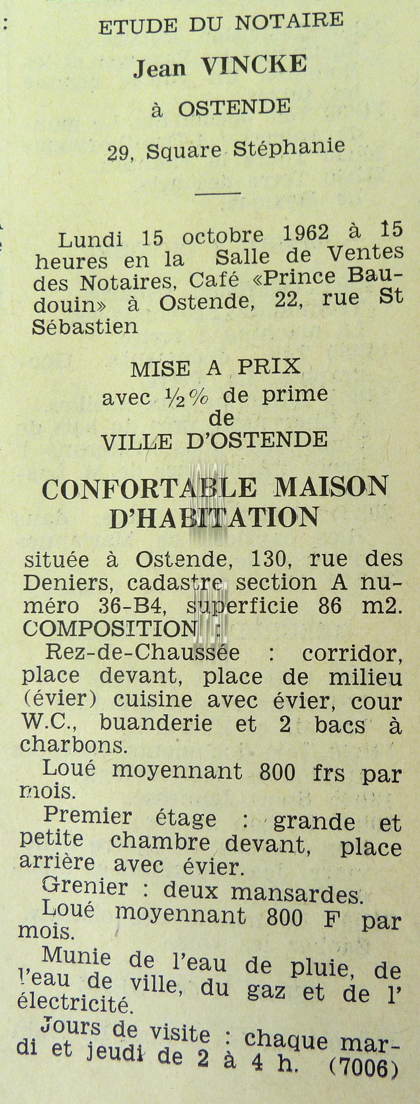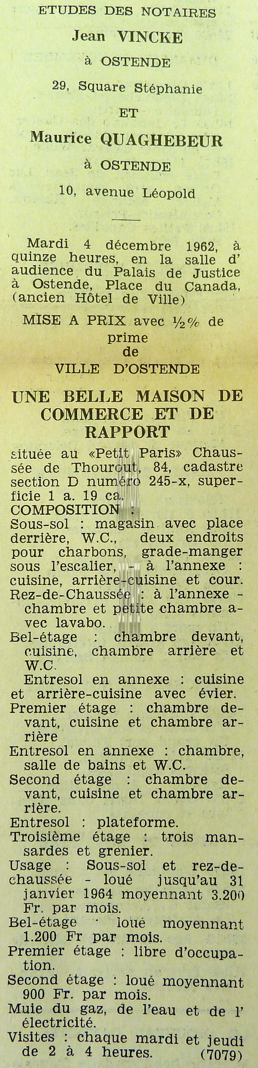 Advertentie : Etude du notaire F.J. Van Caillie. Vente publique. Deux splendides immeubles commerciaux. Lot 1 : La "Patisserie Derck", 3 rue de la Chapelle, Lot 2 : Maison de commerce, 13 rue de la Chapelle, Ostende