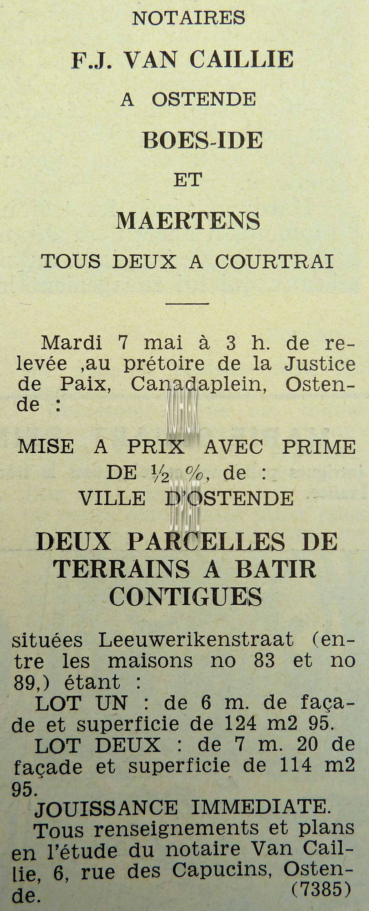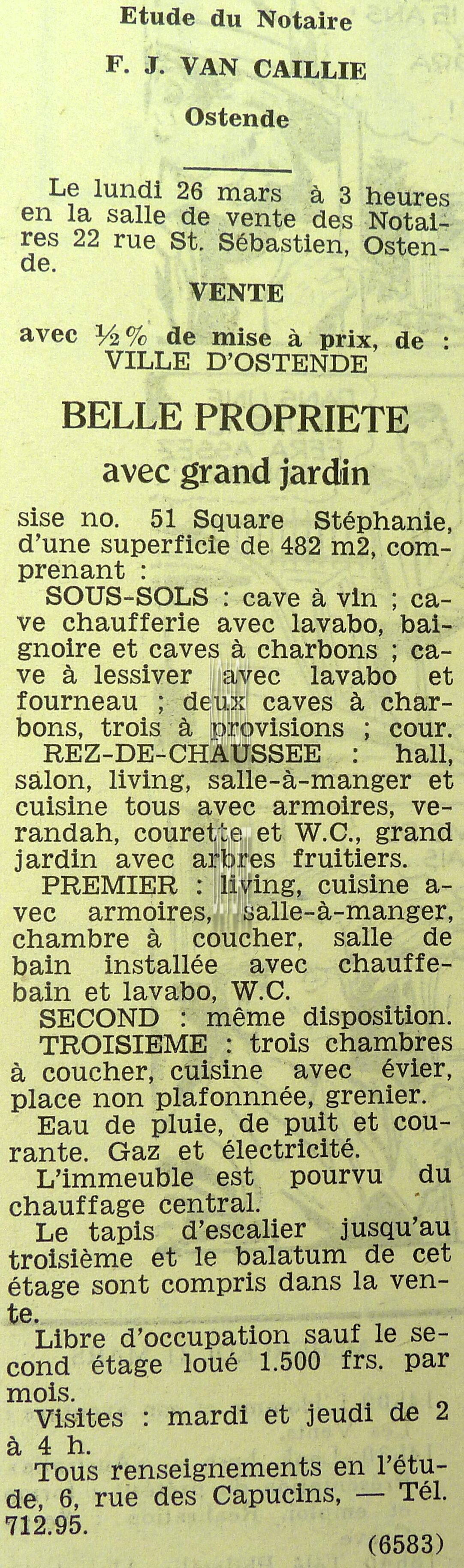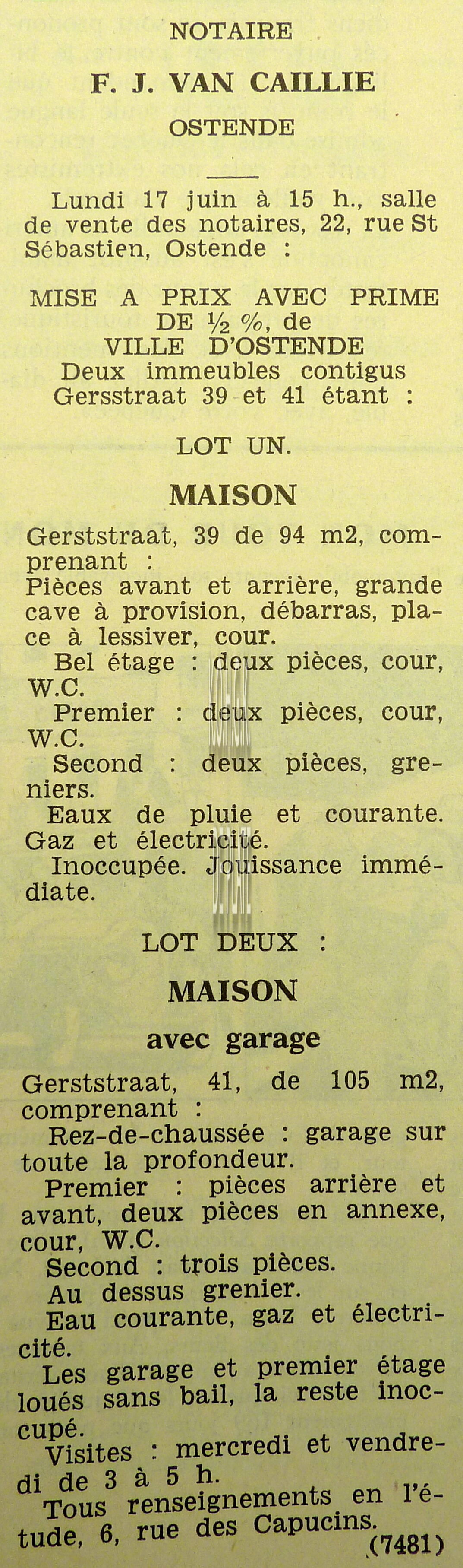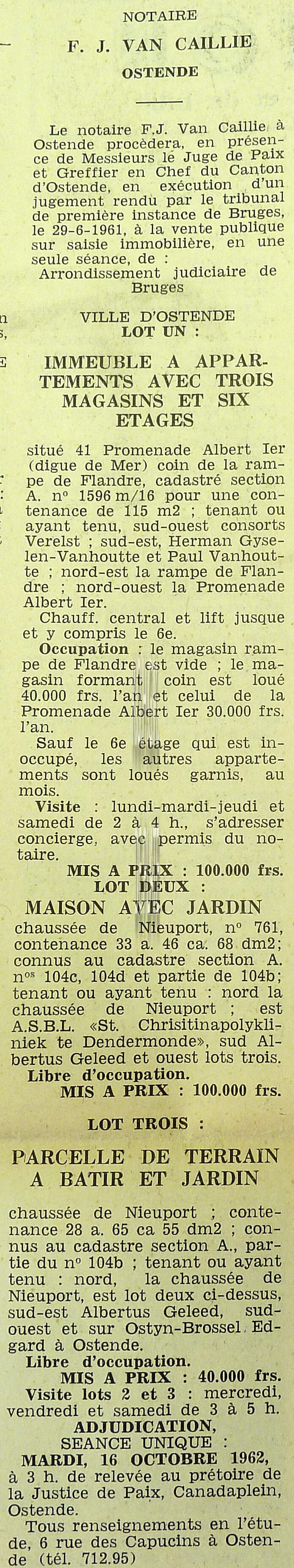 Advertentie : Etude du notaire F.J. Van Caillie. Vente publique. Lot 1 : Immeuble à appartements avec trois magasins et six étages. 41 Promenade Albert Ier, Lot 2 : Maison avec jardin. chaussée de Nieuport 761, Lot 3 : Parcelle de terrain à bâtir et ...
