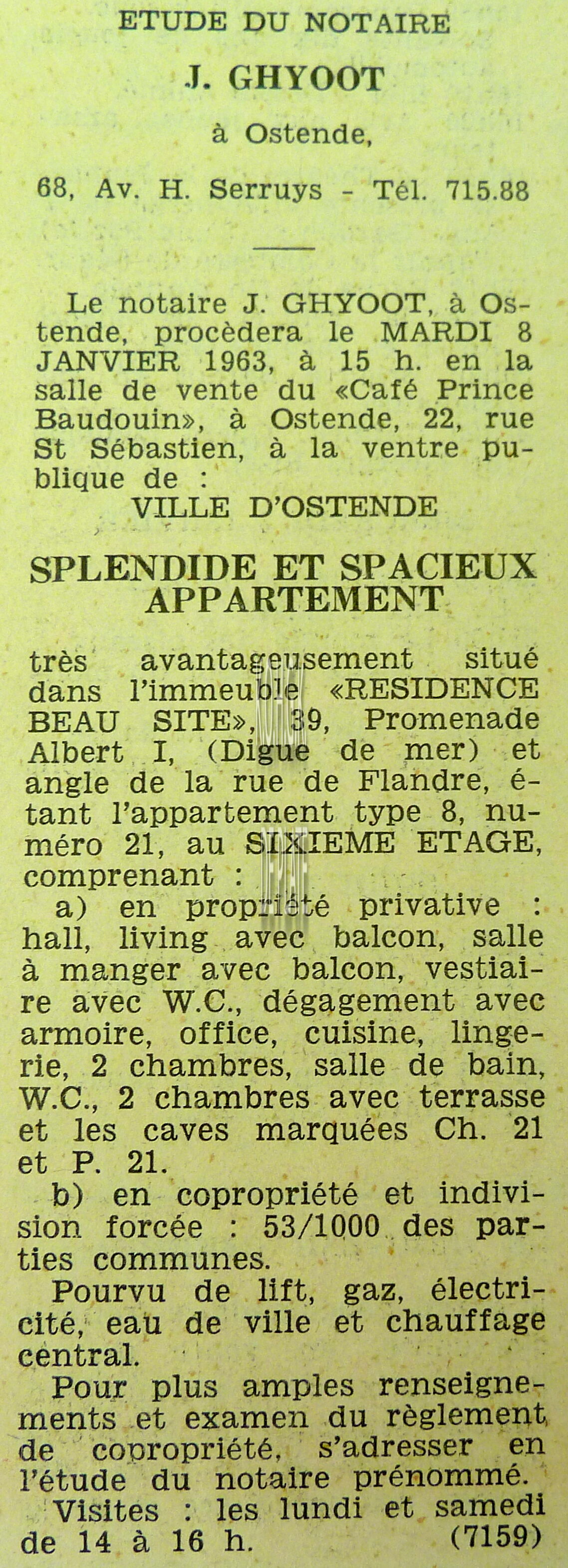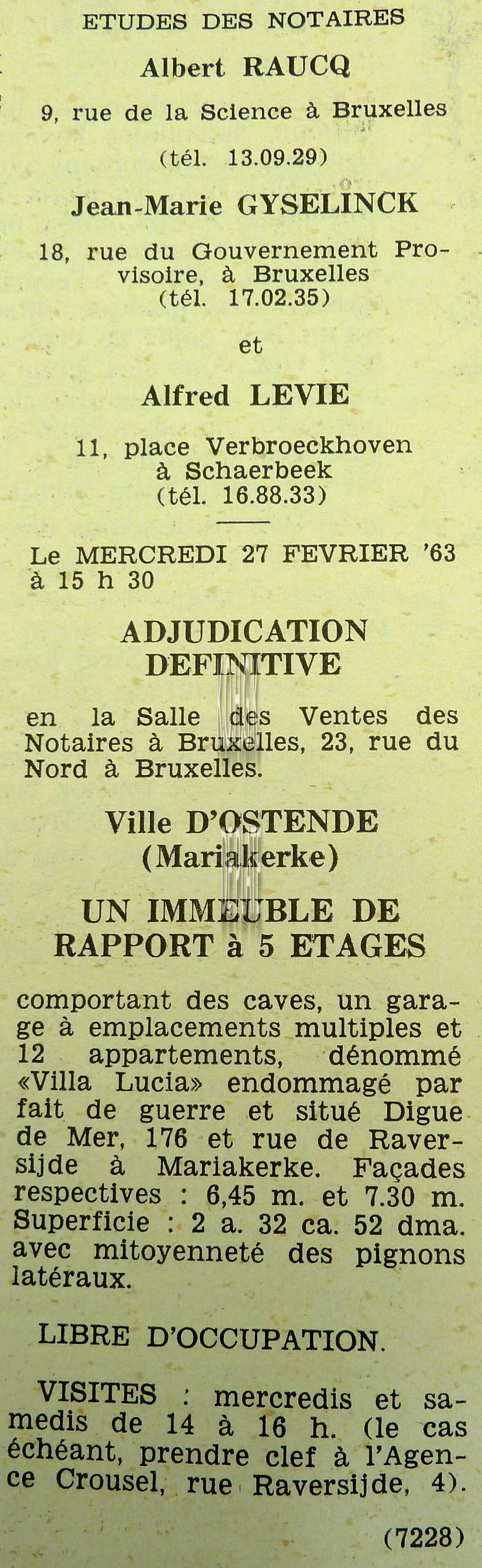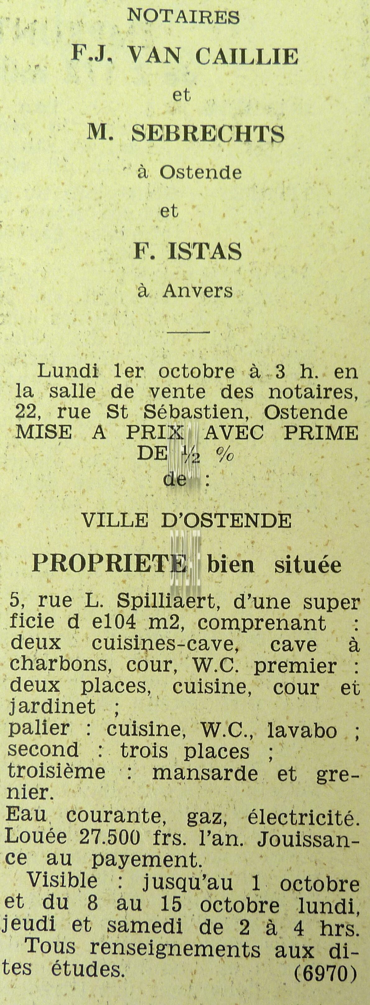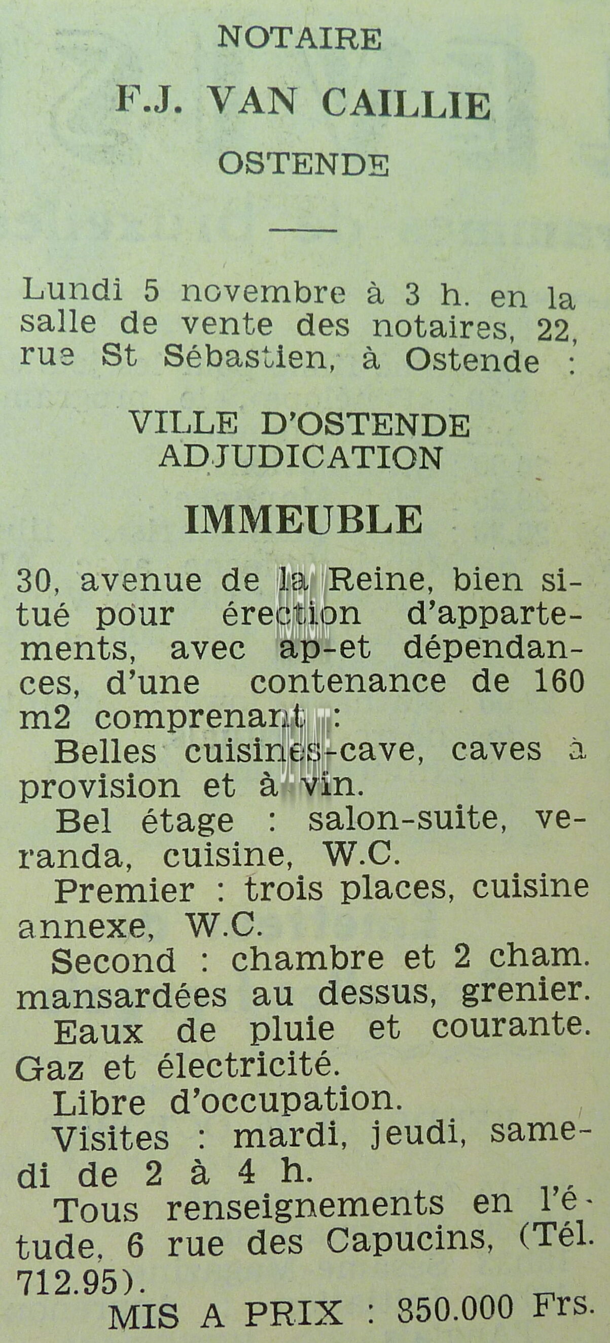 Advertentie : Etude du notaire F.J. Van Caillie. Vente publique. Lot 1 : Immeuble à appartements avec trois magasins et six étages. 41 Promenade Albert Ier, Lot 2 : Maison avec jardin. chaussée de Nieuport 761, Lot 3 : Parcelle de terrain à bâtir et ...