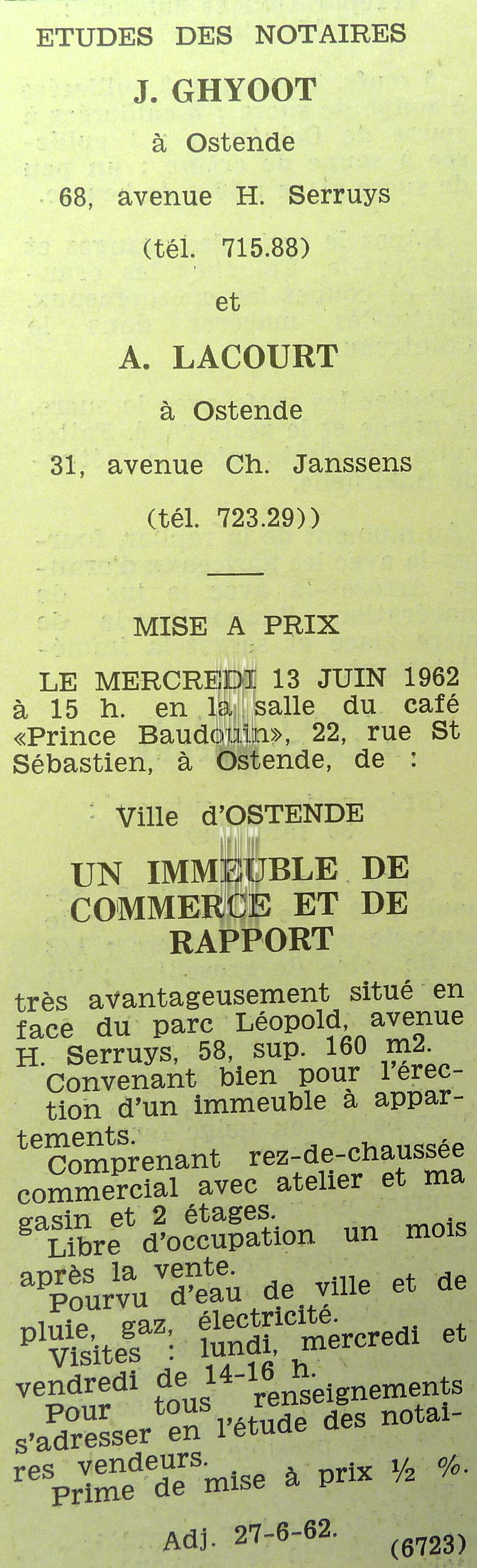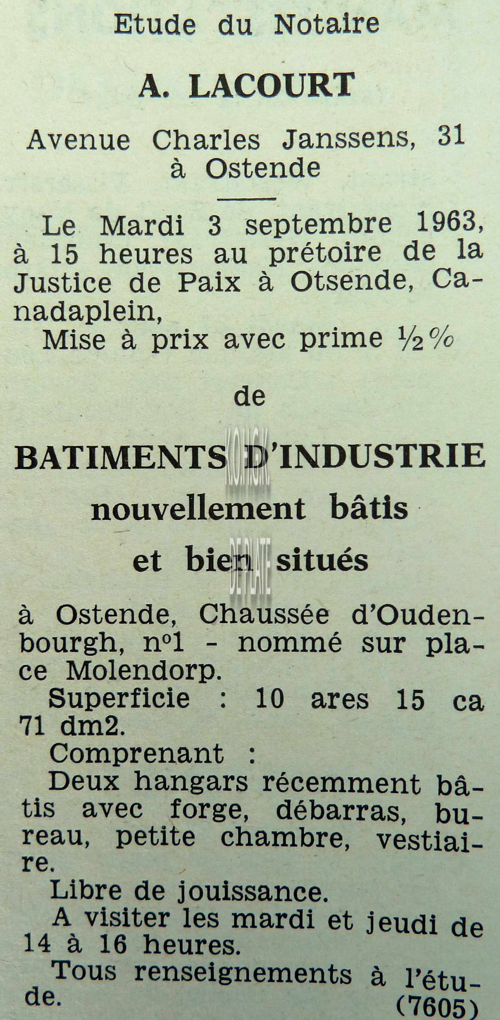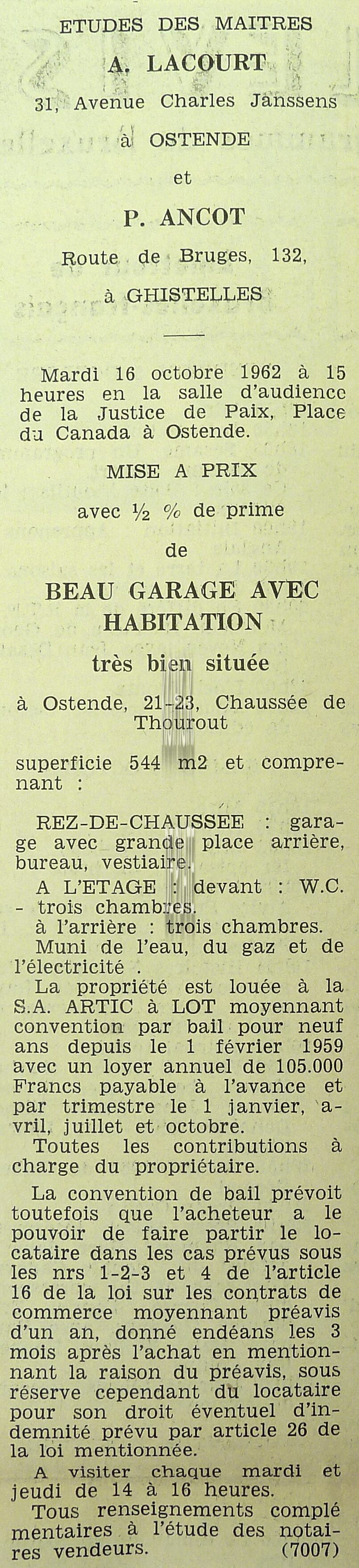 Advertentie : Etudes des notaires A. Lacourt et P. Ancot. Vente publique. Beau garage avec habitation. 21-23, Chaussée de Thourout, Ostende