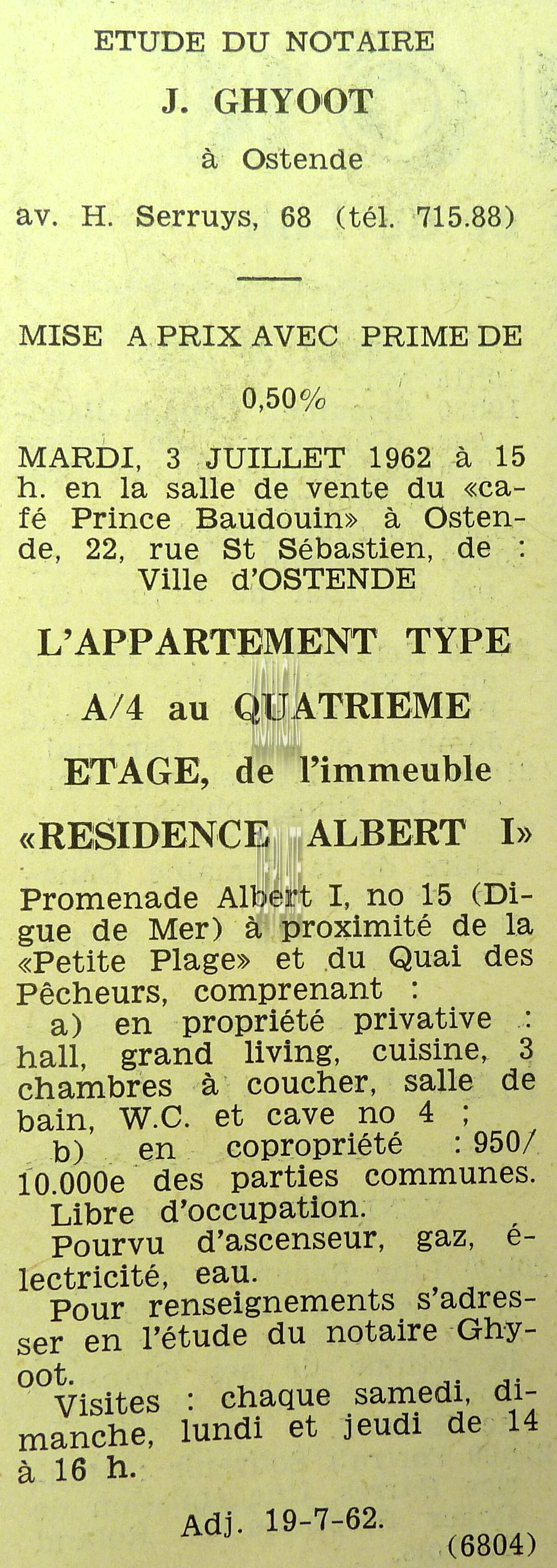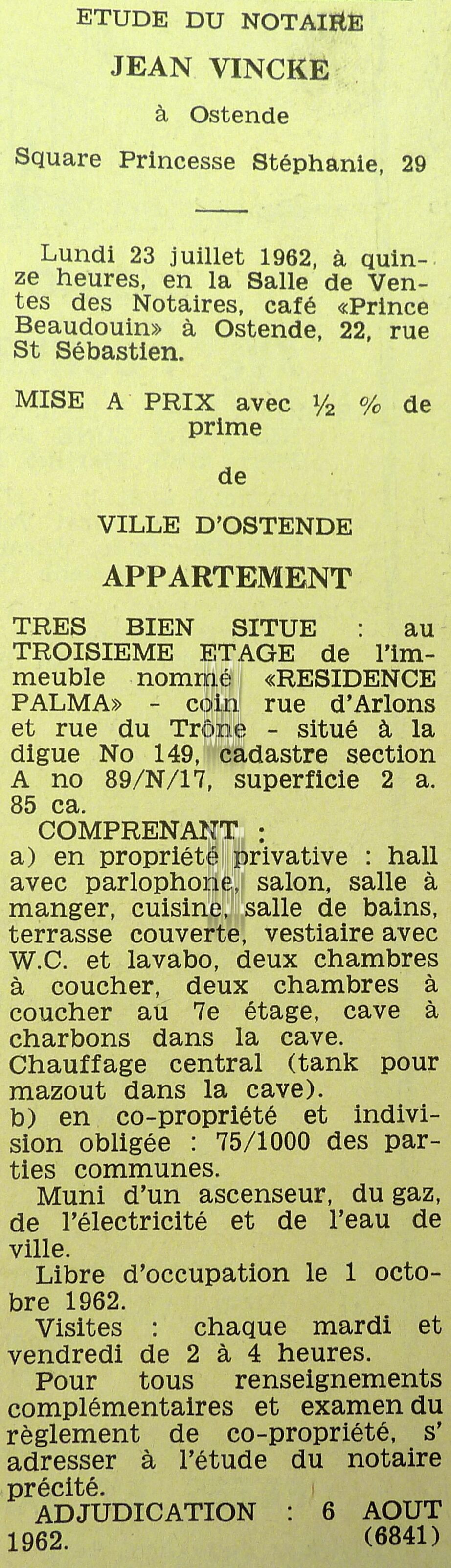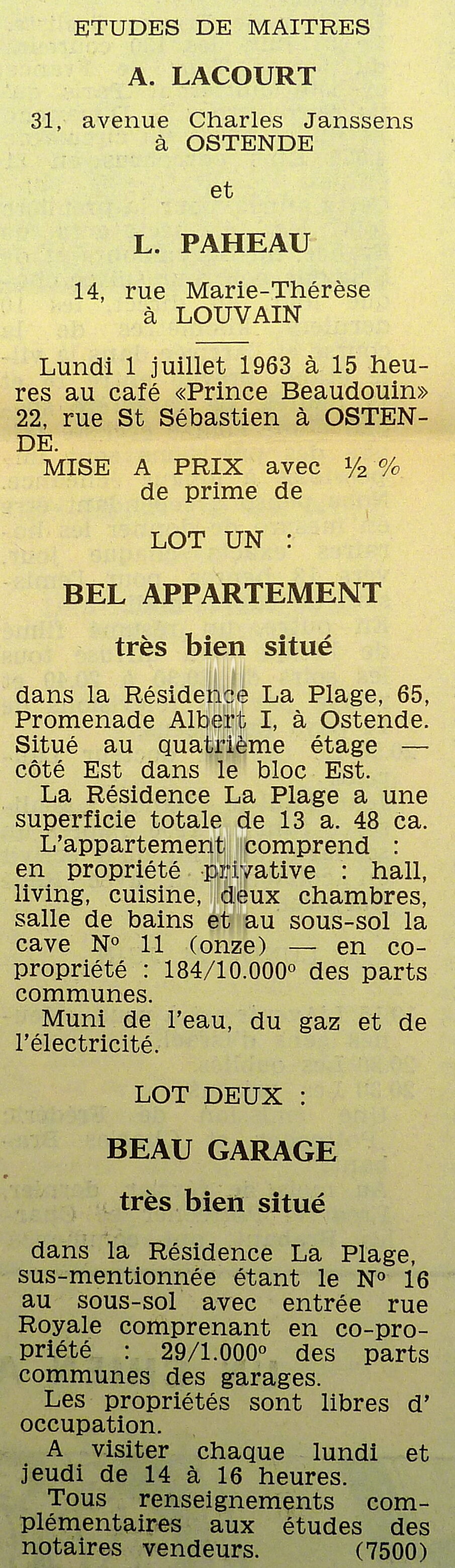 Advertentie : Etudes des notaires A. Lacourt et L. Paheau. Vente publique. Lot un : Bel appartement. Résidence La Plage. 65, Promenade Albert I. Lot deux : Beau garage très bien situé dans la Résidence La Plage