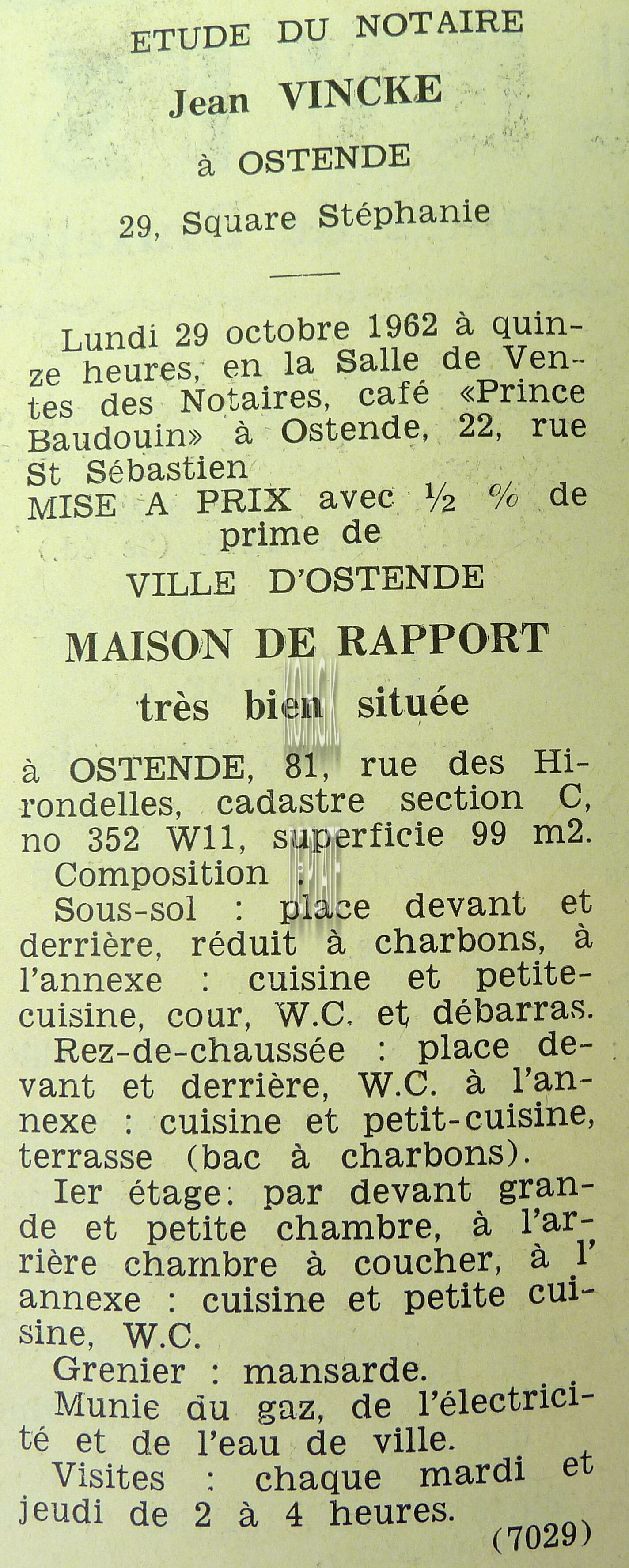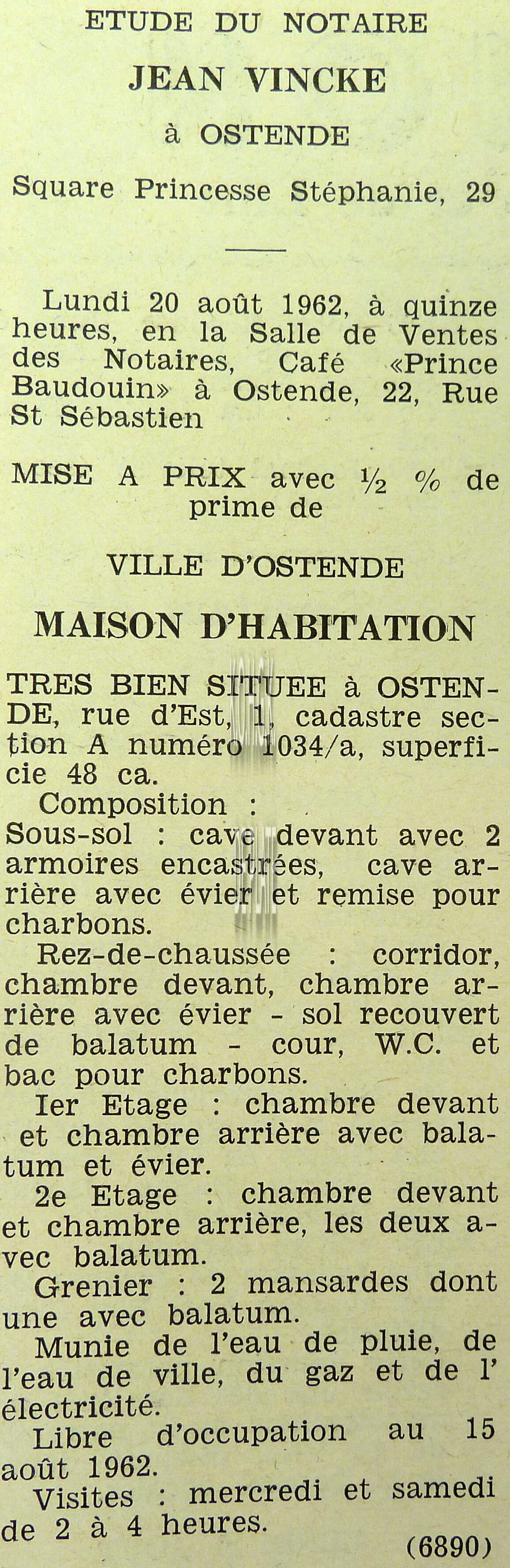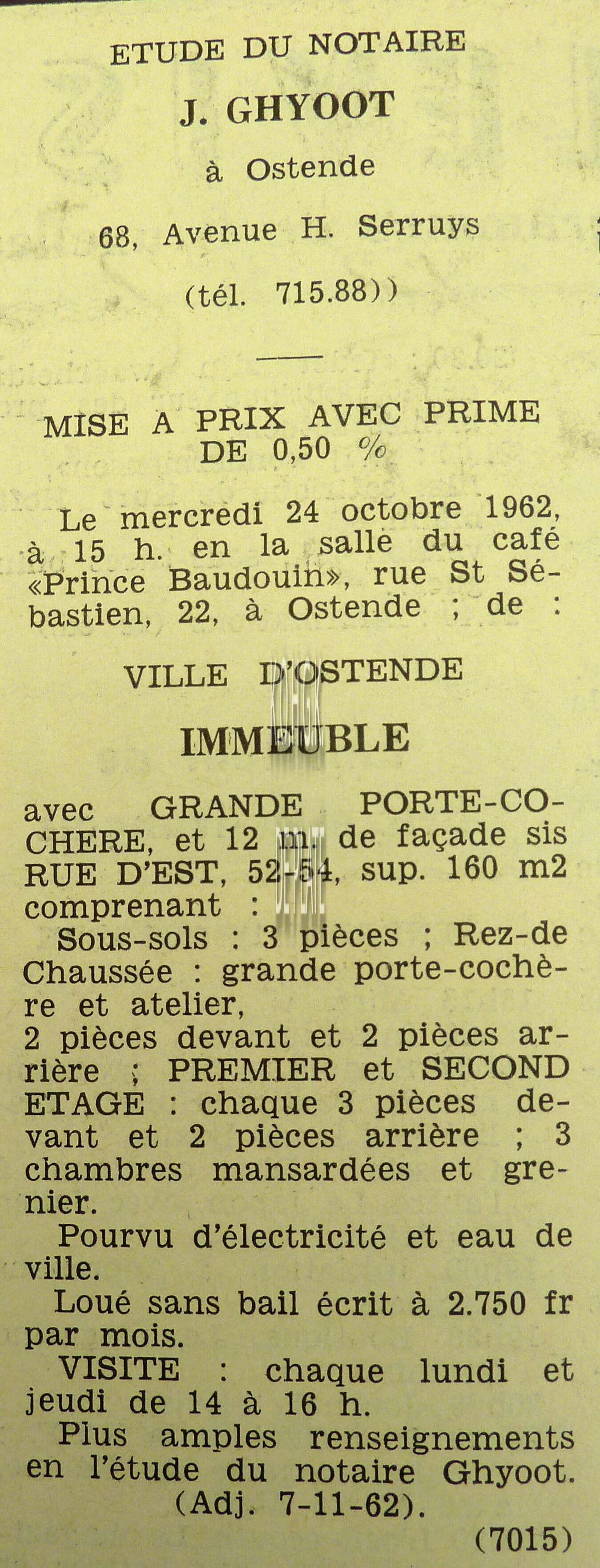 Advertentie : Etude du notaire J. Ghyoot. Vente publique. Immeuble avec grande porte cochère. Rue d'Est 52-54, Ostende