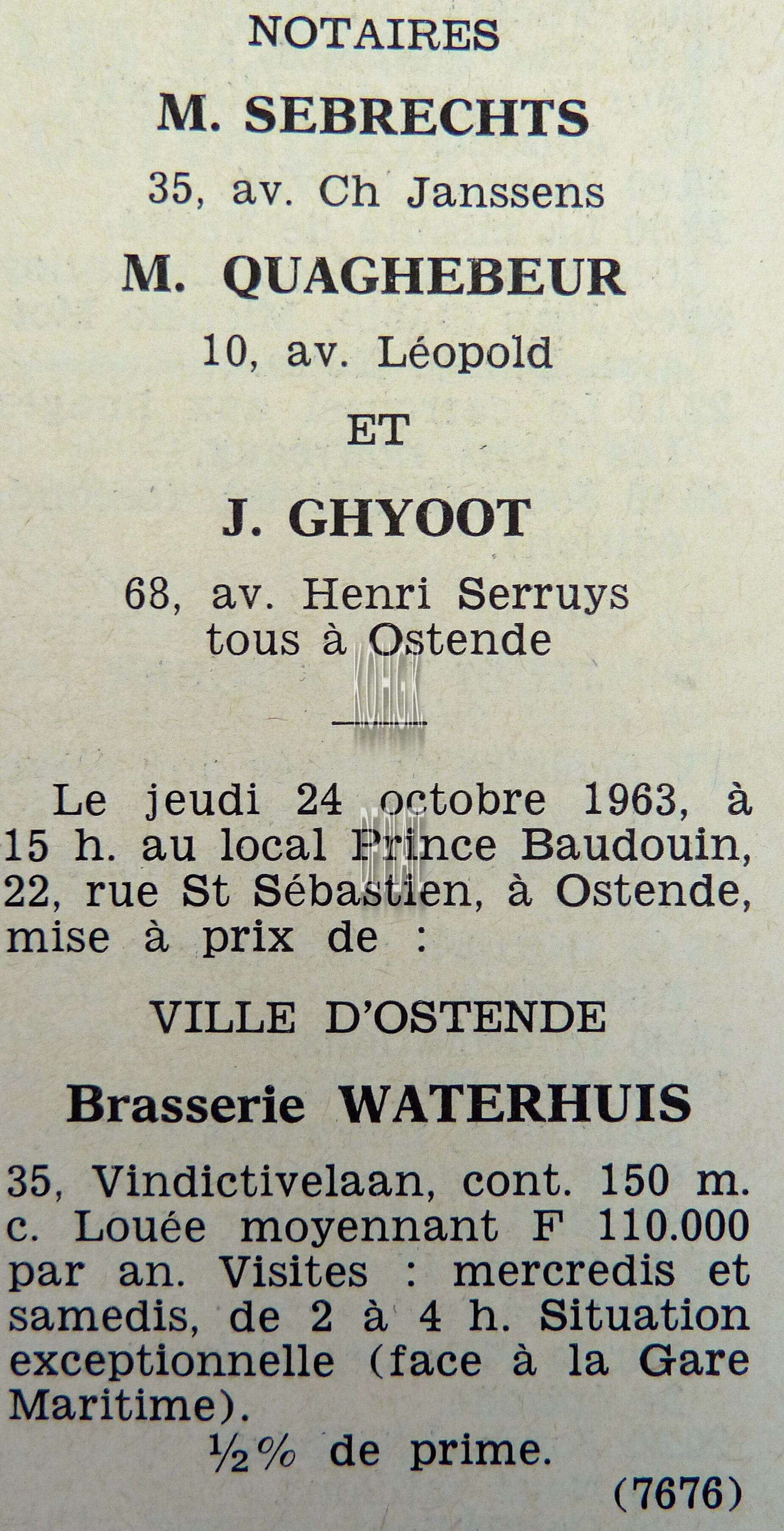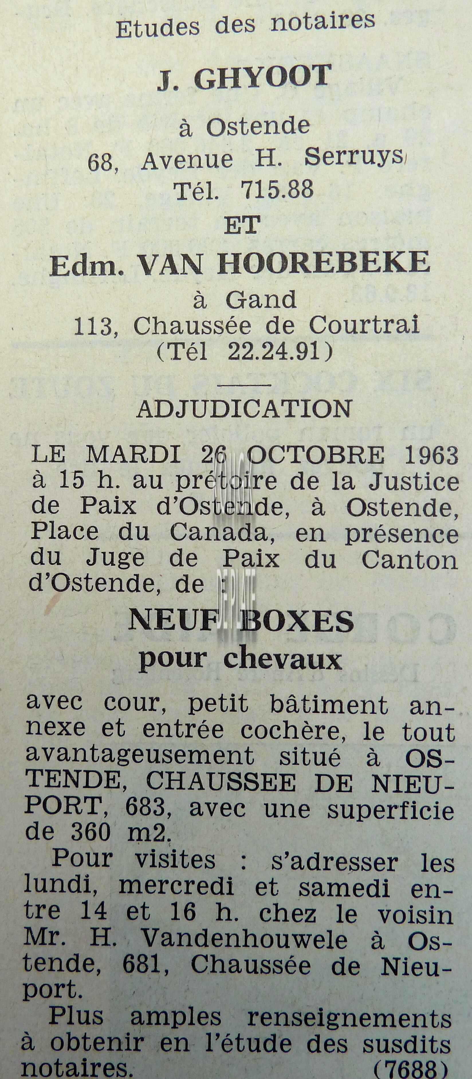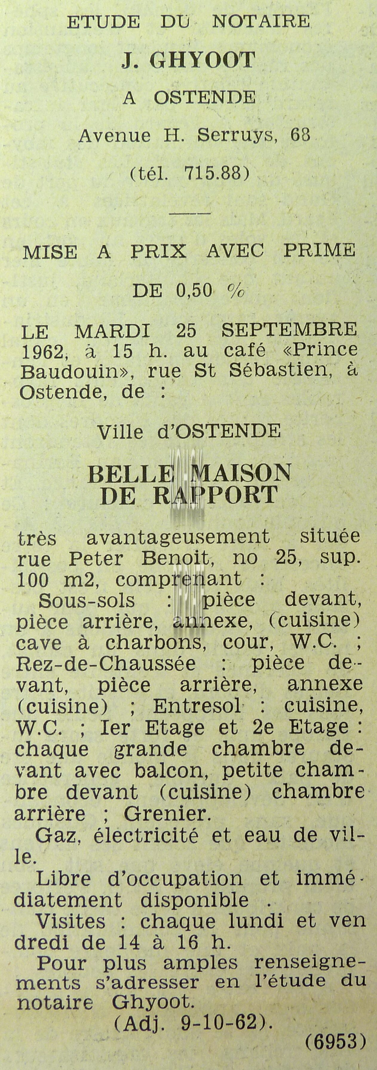 Advertentie : Etude du notaire J. Ghyoot. Vente publique. Immeuble avec grande porte cochère. Rue d'Est 52-54, Ostende