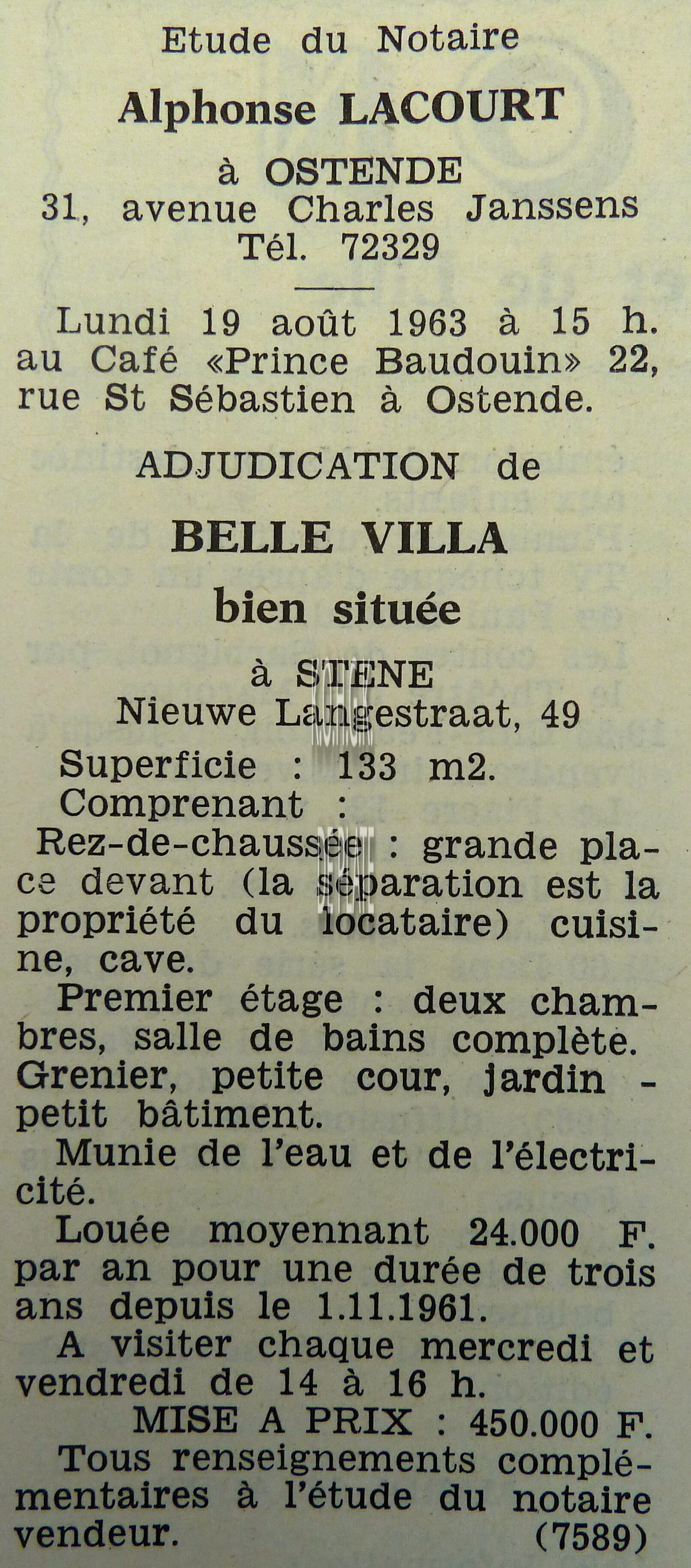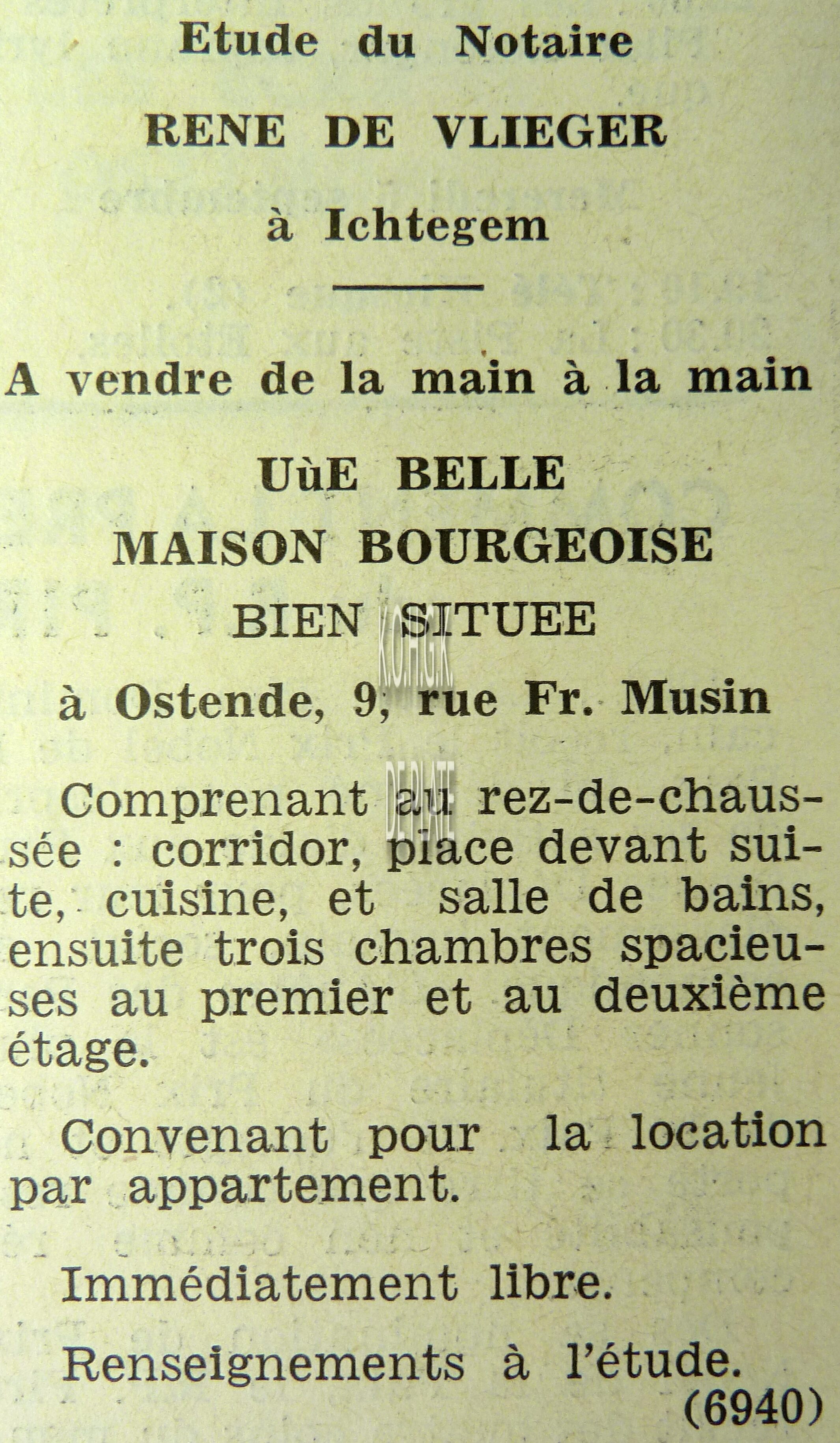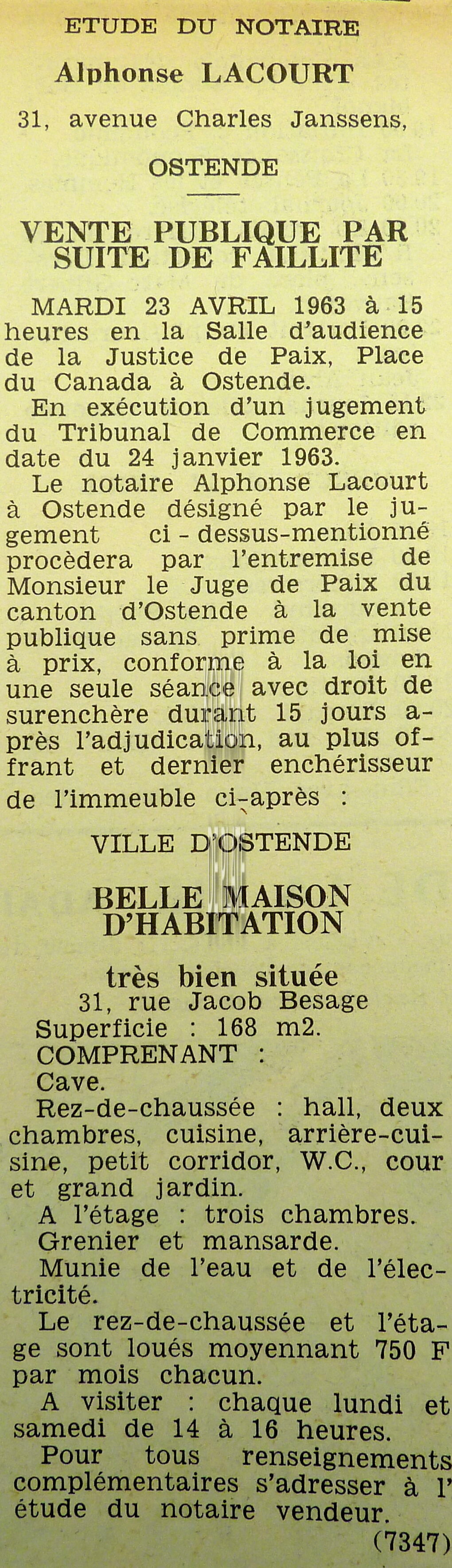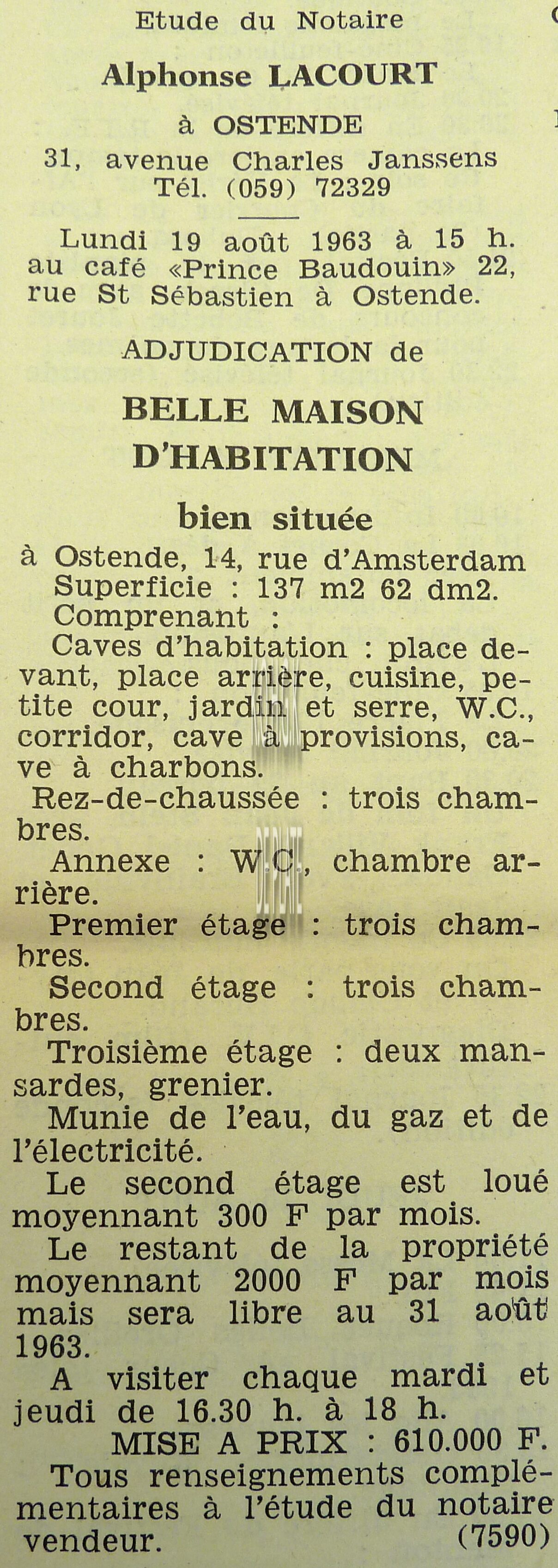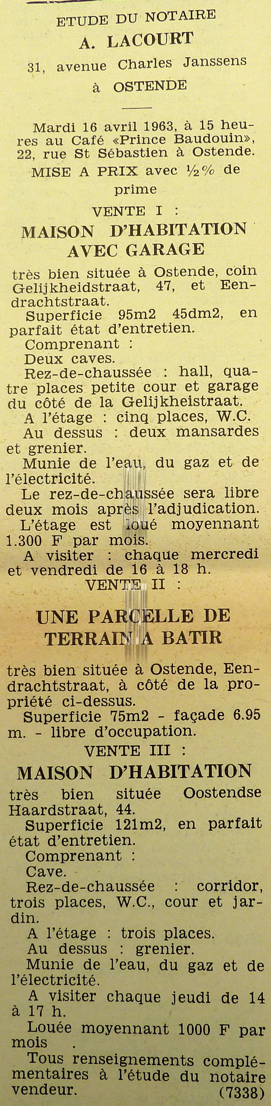 Advertentie : Etude du notaire A. Lacourt. Vente publique. Vente 1 : Maison d'habitation avec garage. Gelijkheidstraat 47. Vente 2 : Une parcelle de terrain à bâtir. Eendrachtstraat. Vente 3 : Maison d'habitation; Oostendse Haardstraat 44
