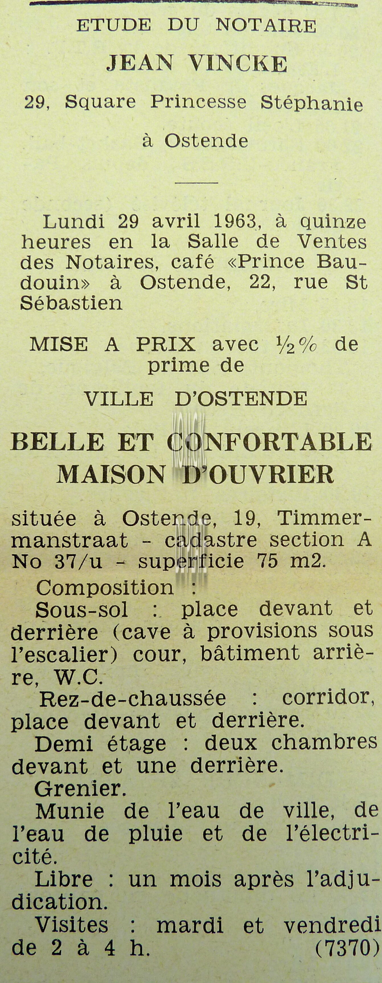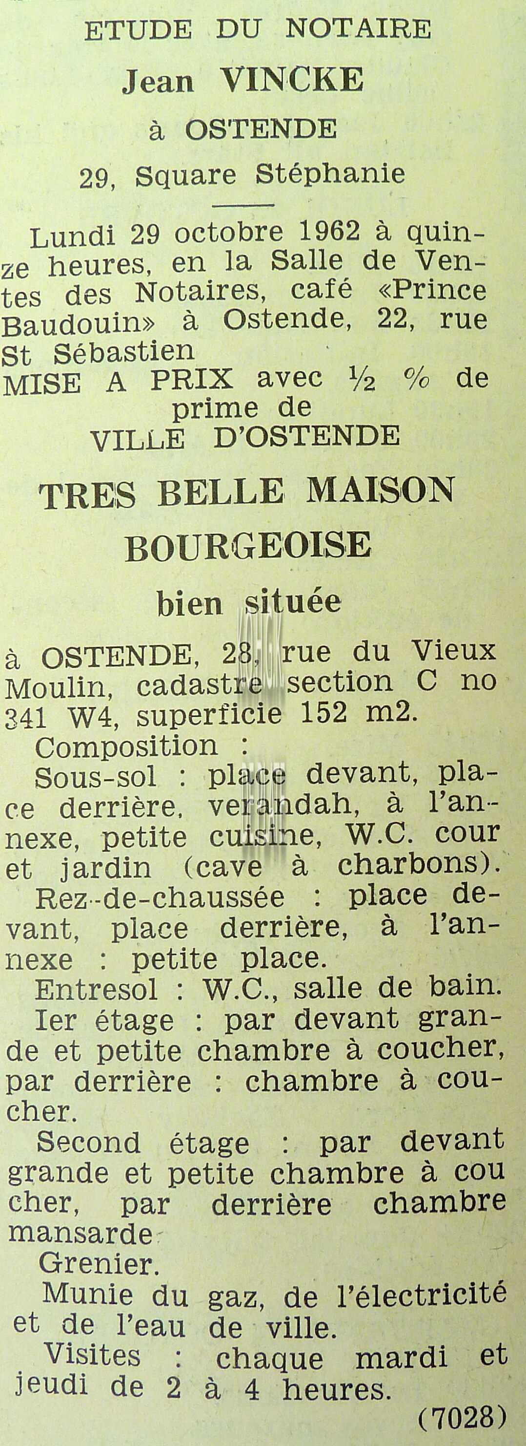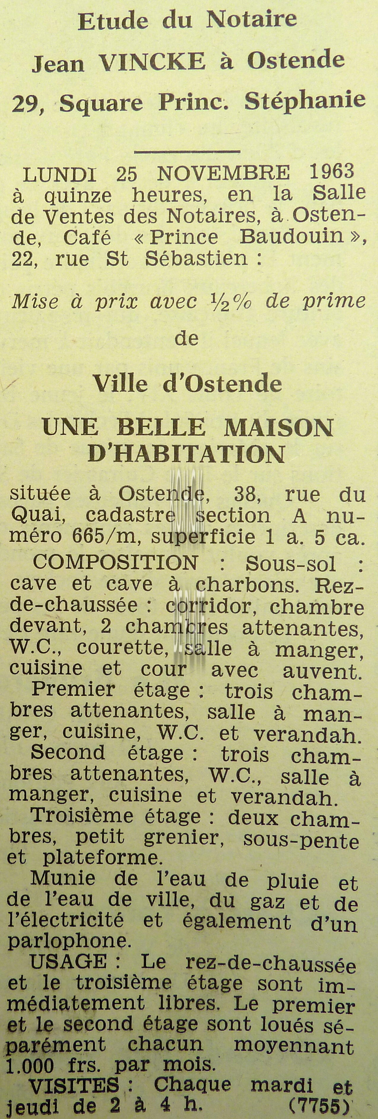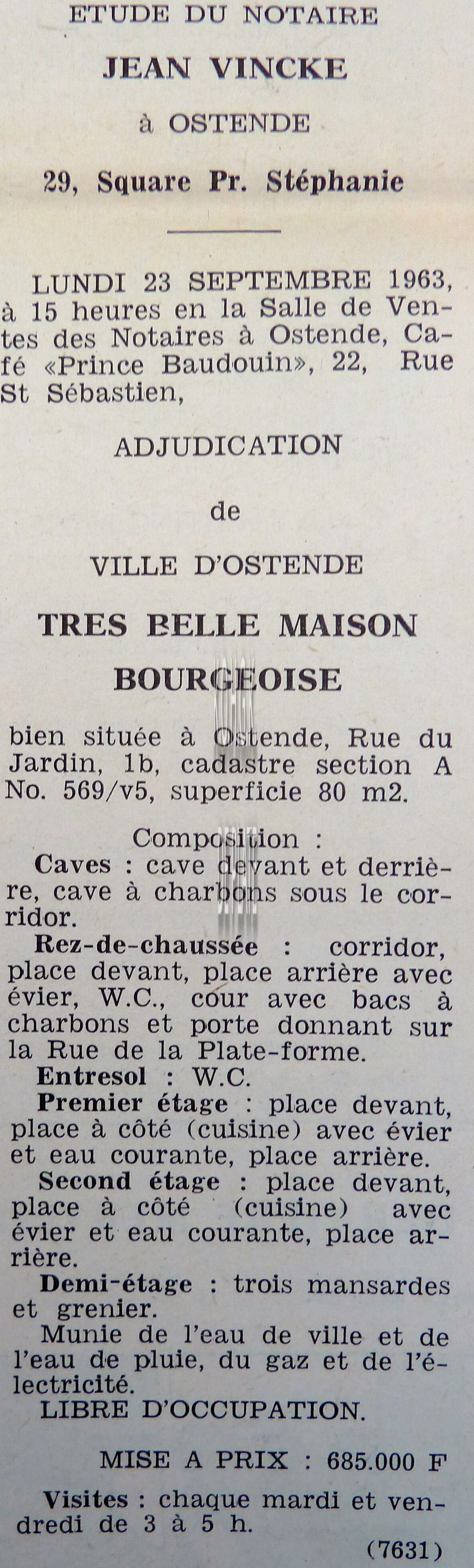 Advertentie : Etudes des notaires Jean Vincke, V. Vereecke et Georges Van Caillie Vente publique. I et II. Très belle maison de rapport, III. Une parcelle de terrain à bâtir.