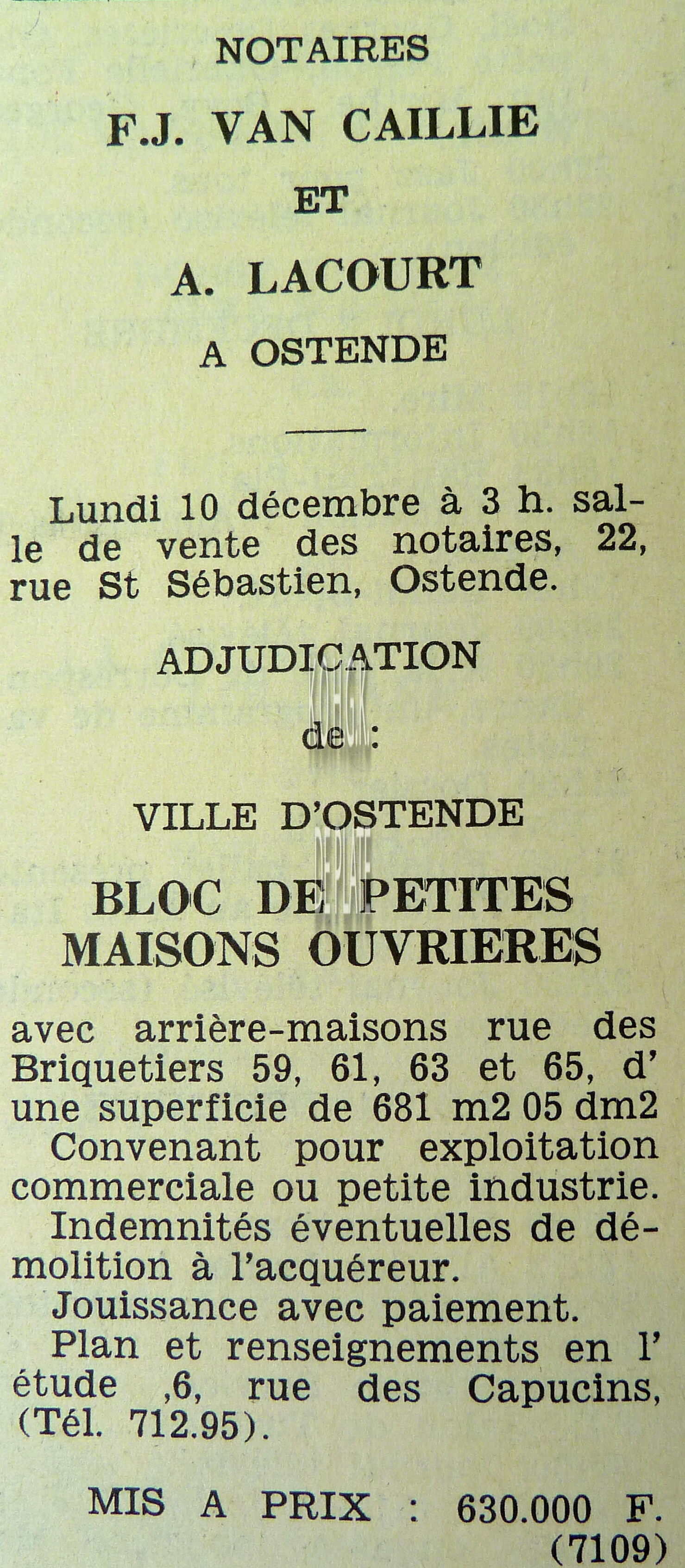 Advertentie : Etudes des notaires F.J. Van Caillie et A. Lacourt. Vente publique. Bloc de petites maisons ouvrières. Rue des Briquetiers 59, 61, 63 et 65,Ostende