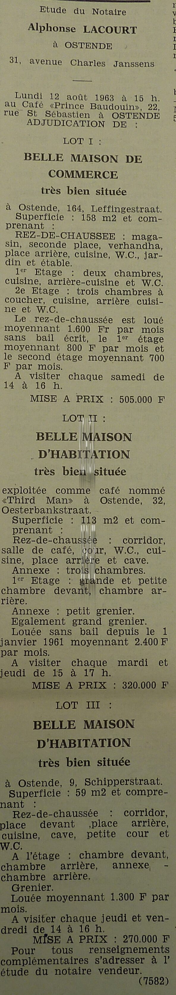 Advertentie : Etude du notaire A. Lacourt. Vente publique. Lot 1 : Belle maison de commerce. 164, Leffingestraat. Lot 2 : Belle maison d'habitation. Café Third Man. 32, Oesterbankstraat. Lot 3 : Belle maison d'habitation. 9, Schipperstraat