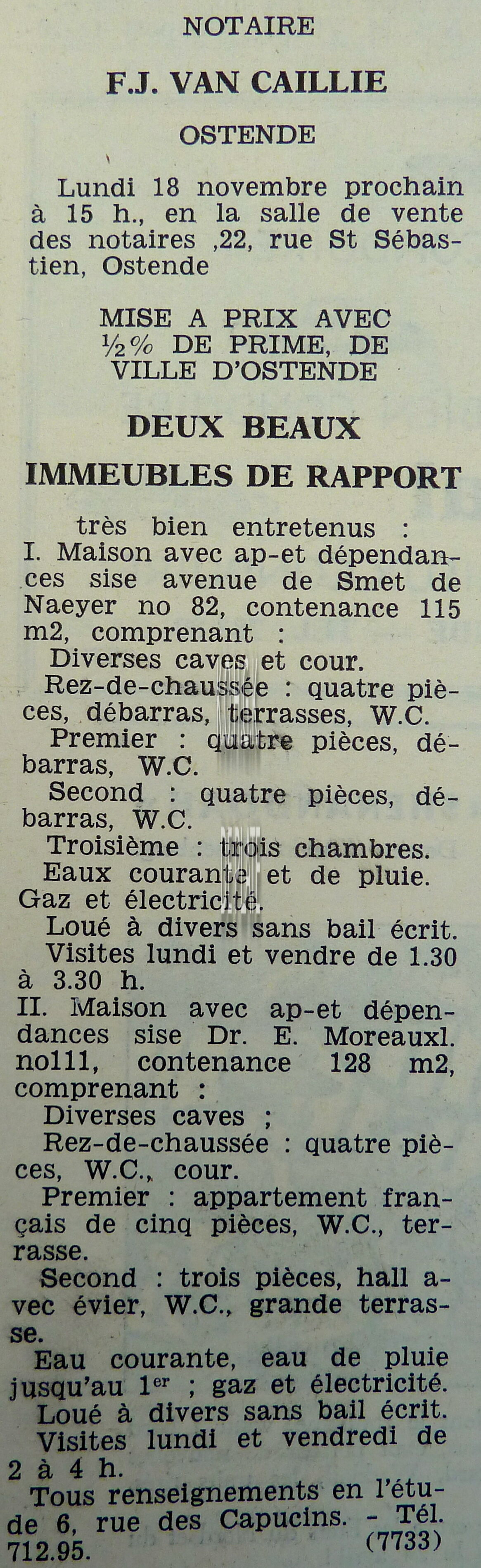 Advertentie : Etude du notaire F.J. Van Caillie. Vente publique. Deux beaux immeubles de rapport. 1 : Avenue de Smet de Naeyer 82. 2 : Dr. E. Moreauxlaan 111, Ostende