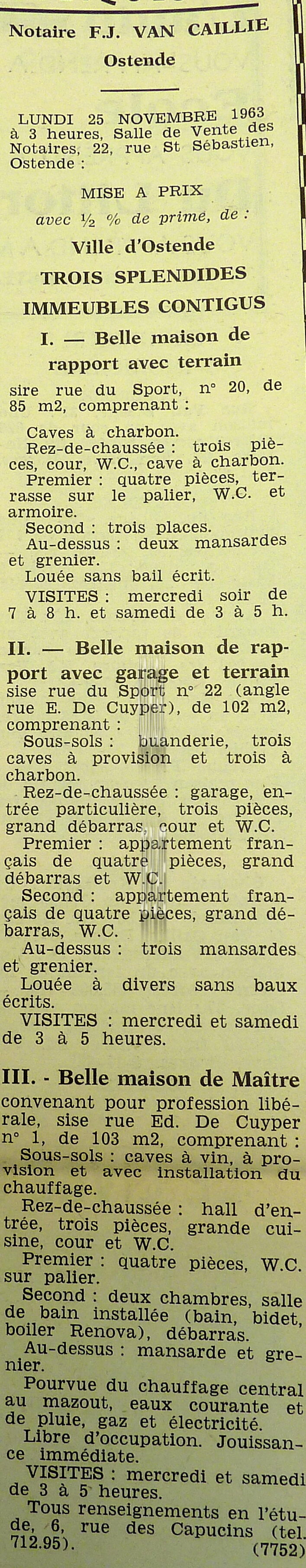 Advertentie : Etude du notaire F.J. Van Caillie. Vente publique. Trois splendides immeubles contigus. 1 : Belle maison de rapport avec terrain. Rue du Sport 20. 2 : Belle maison de rapport avec garage et terrain. Rue du Sport 22. 3 : Belle maison ...