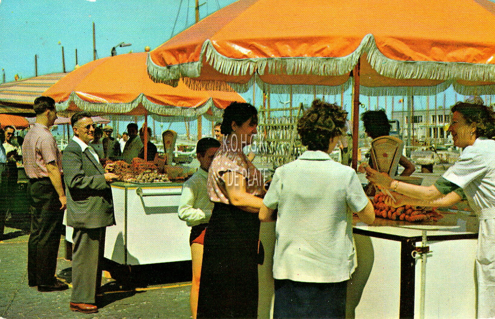 Postkaart : Visserskaai. Verkoop van schaal- en schelpdieren.