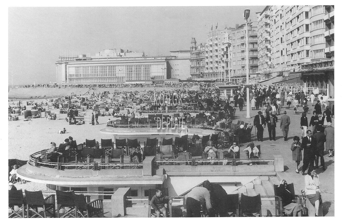 De naoorlogse Zeedijk van Oostende ; Het Kursaal in opbouw ; Het Kursaal in volle pracht (zonder de lelijke ''hoed''). - 2 foto's uit het archief De Plate van Foto Luc