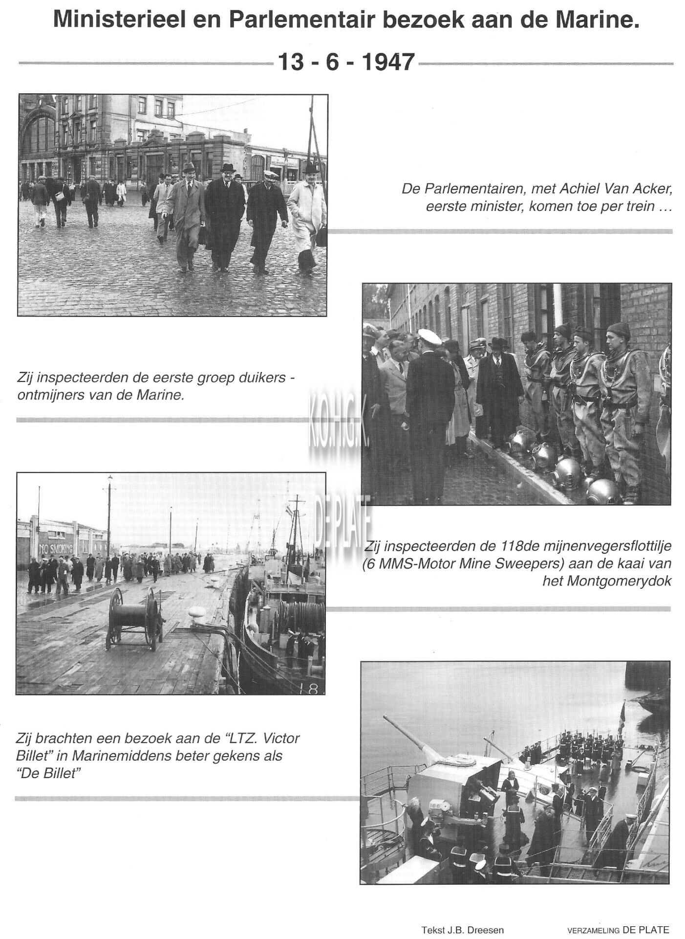 Uit de beginjaren van de Marine te Oostende : Ministerieel en parlementair bezoek aan de Marine 13-6-1947. - 4 foto's uit het archief De Plate