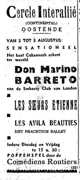 ADVERTENTIES ; MUZIEKCERCLE INTERALLIE (SOCIO-CULTURELE) ; TWEEDE WERELDOORLOGHOTEL CONTINENTALPROGRAMMA'SCOMÉDIENS ROUTIERS (POPPENSPEL)DON MARINO BARRETO (ORKEST)LES SOEURS ETIENNE (VOCAAL)LES AVILAS BEAUTIES (BALLET)