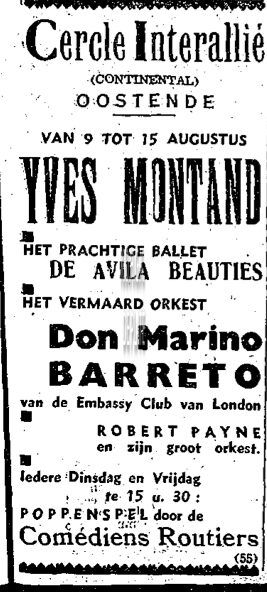 ADVERTENTIES ; MUZIEKCERCLE INTERALLIE (SOCIO-CULTURELE) ; TWEEDE WERELDOORLOGHOTEL CONTINENTALPROGRAMMA'SCOMÉDIENS ROUTIERS (POPPENSPEL)LES AVILAS BEAUTIES (BALLET)DON MARINO BARRETO (ORKEST)PAYNE ROBERT (ORKEST)MONTAND YVES (1921-1991) (ZANGER ACTEUR)
