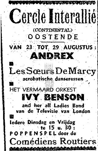 ADVERTENTIES ; MUZIEKCERCLE INTERALLIE (SOCIO-CULTURELE) ; TWEEDE WERELDOORLOGHOTEL CONTINENTALPROGRAMMA'SCOMÉDIENS ROUTIERS (POPPENSPEL)IVY BENSON AND HER ALL LADIES BAND (ORKEST)ANDREXLES SOEURS DE MARCY (ACROBATISCHE DANSERESSEN)
