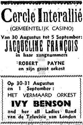 ADVERTENTIES ; MUZIEKCERCLE INTERALLIE (SOCIO-CULTURELE) ; TWEEDE WERELDOORLOGKONINKLIJKE SCHOUWBURG (VAN ISEGHEMLAAN) ; PROGRAMMA'SIVY BENSON AND HER ALL LADIES BAND (ORKEST)JACQUELINE FRANÇOIS (1922-2009) (ZANGERES)PAYNE ROBERT (ORKEST)