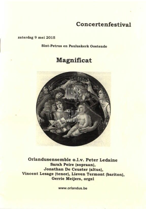 Het Orlandusensemble o.l.v. Peter Ledaine ; Sarah Peire (sopraan) ; Jonathan De Ceuster (altus) ; Vincent Lesage (tenor); Lieven Termont (bariton) ; Gerrie Meijers (orgel). - Deze concerten worden georganiseerd met de steun van Kerkfabriek Sint-Petrus en Paulus, Stadsbestuur en de dienst Cultuur, provinciebestuur van West-Vlaanderen