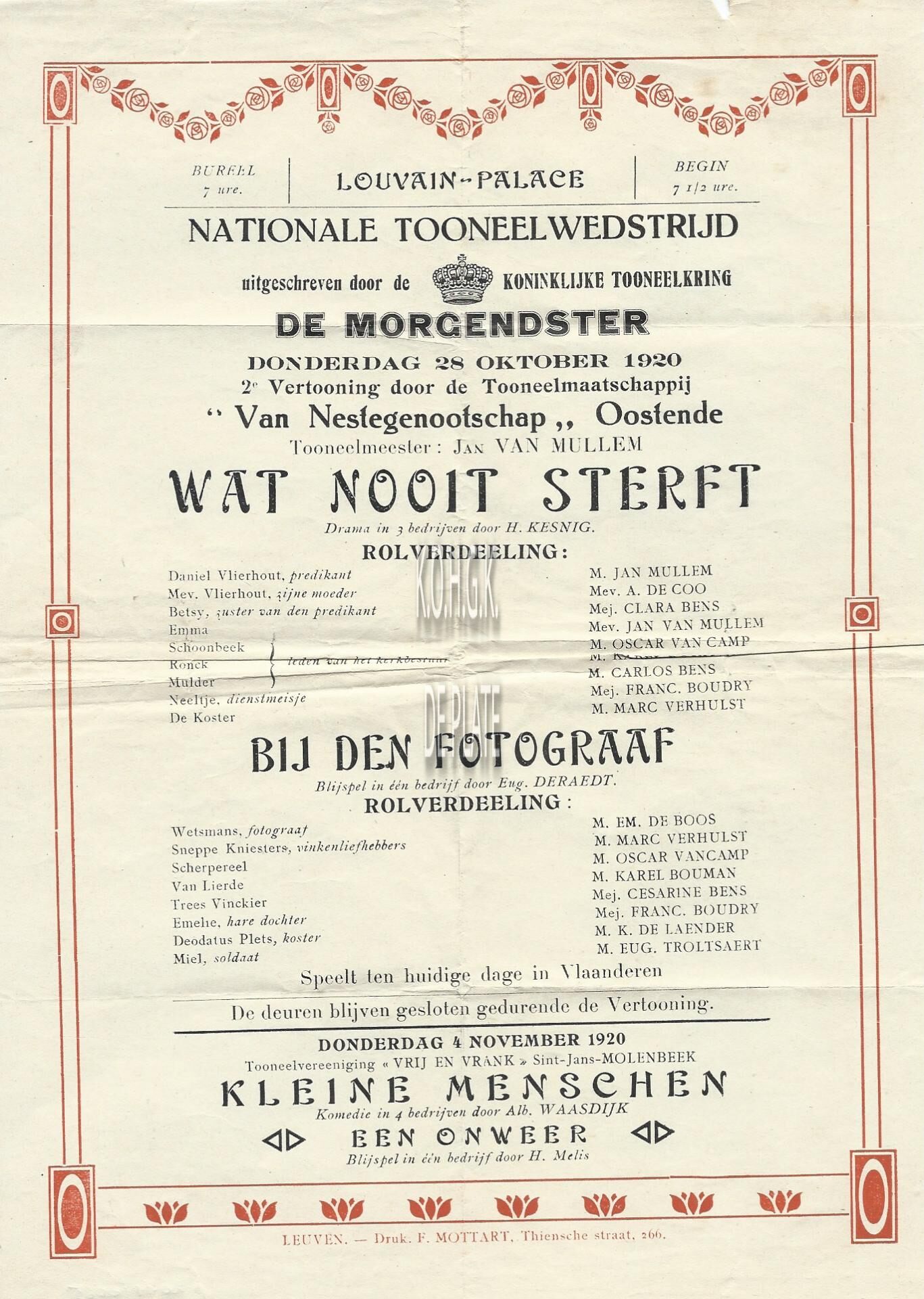 Wat nooit sterft, drama in 3 bedrijven door H. Kesnig. Bij den fotograaf, blijspel in één bedrijf door Eug. Deraedt. Toneelmeester : Jan Van Mullem