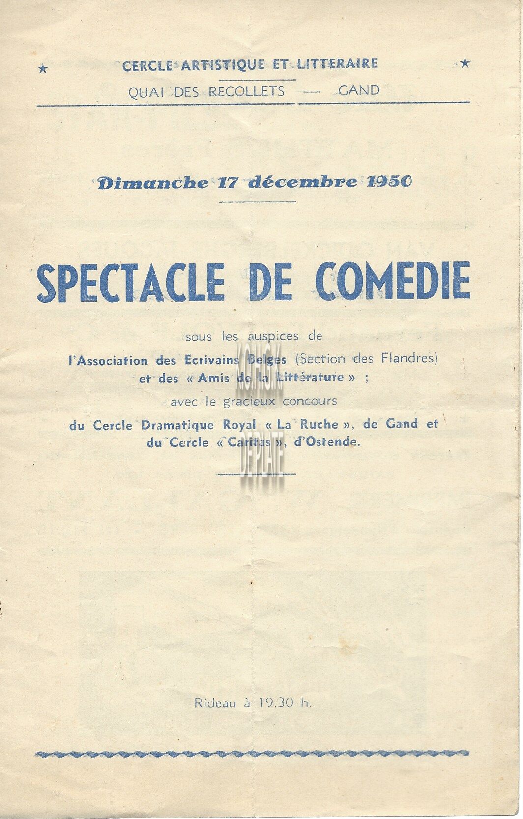 sous les auspices de l'Association des Ecrivains Belges (Section des Flandres) et des "Amis de la Littérature" : avec le gracieux concours de Cercle Dramatique Royal "La Ruche", de Gand et du Cercle "Caritas" d'Ostende.